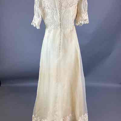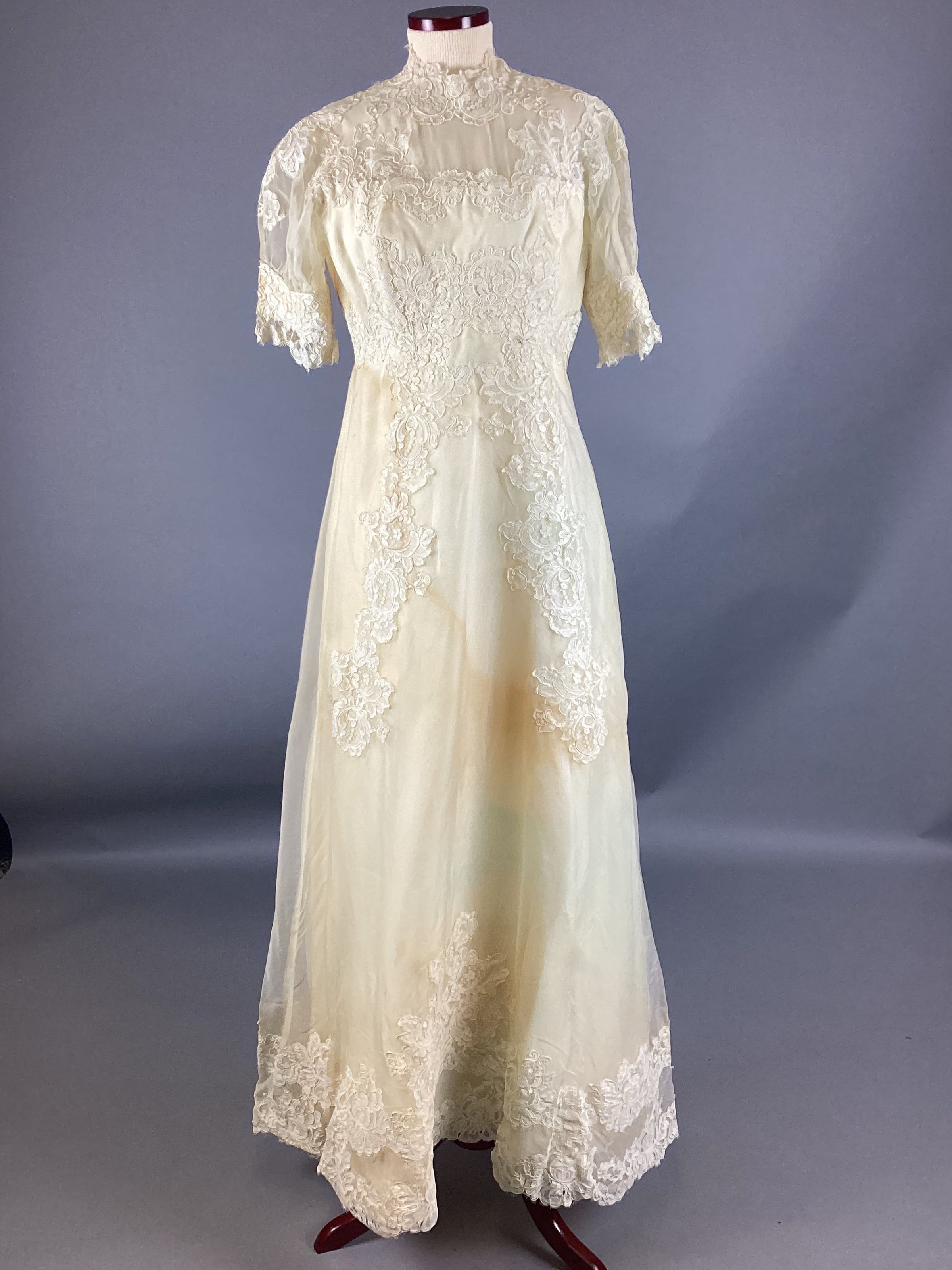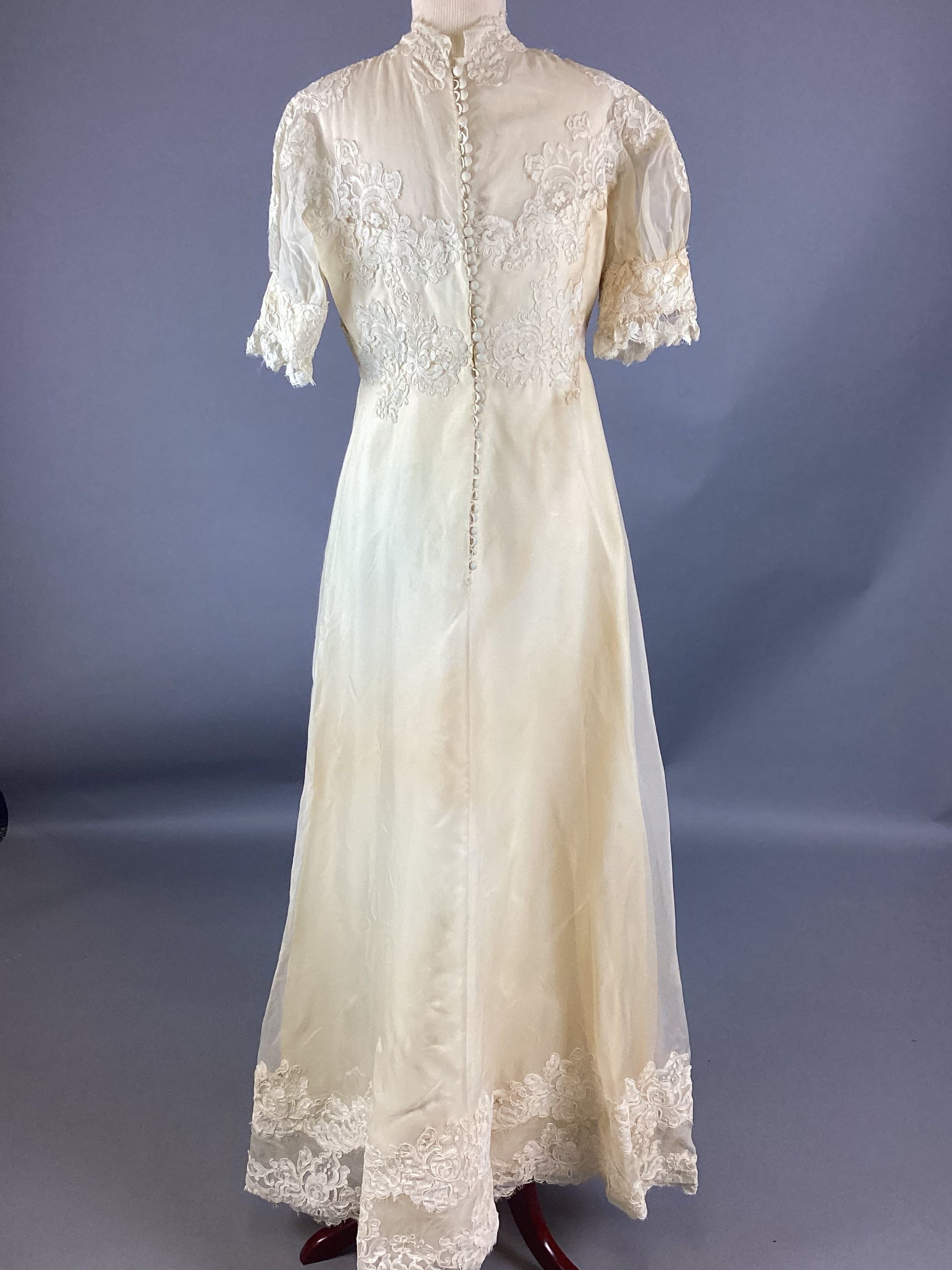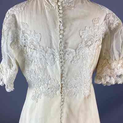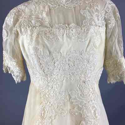 A wedding dress is made of taffeta and has lace detailing on the bodice as well as the skirt. Typical of many dresses from this period, it does not have a train. The dress has numerous satin buttons down the back of the bodice. The dress has short sleeves.Use
