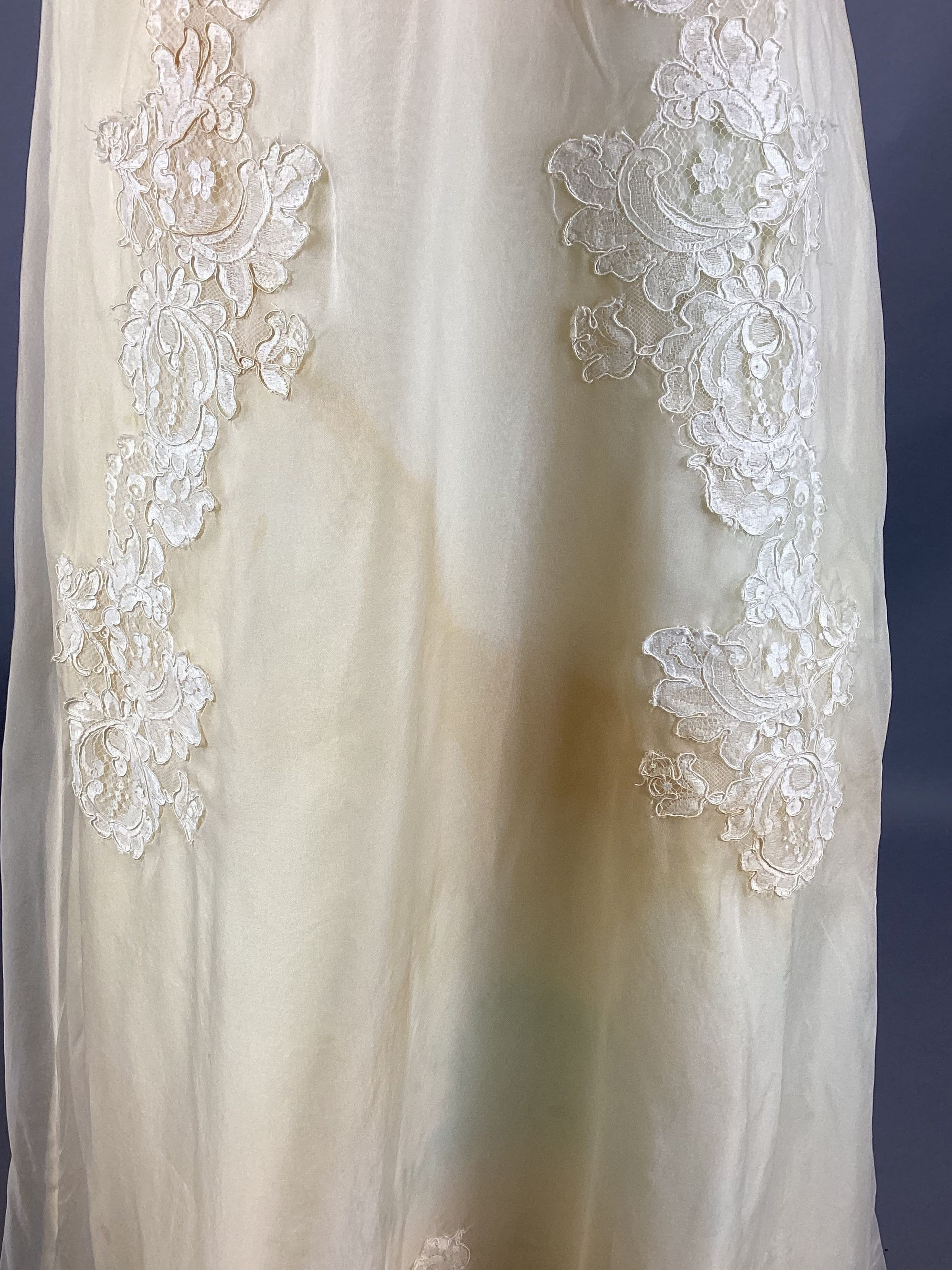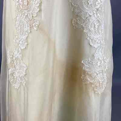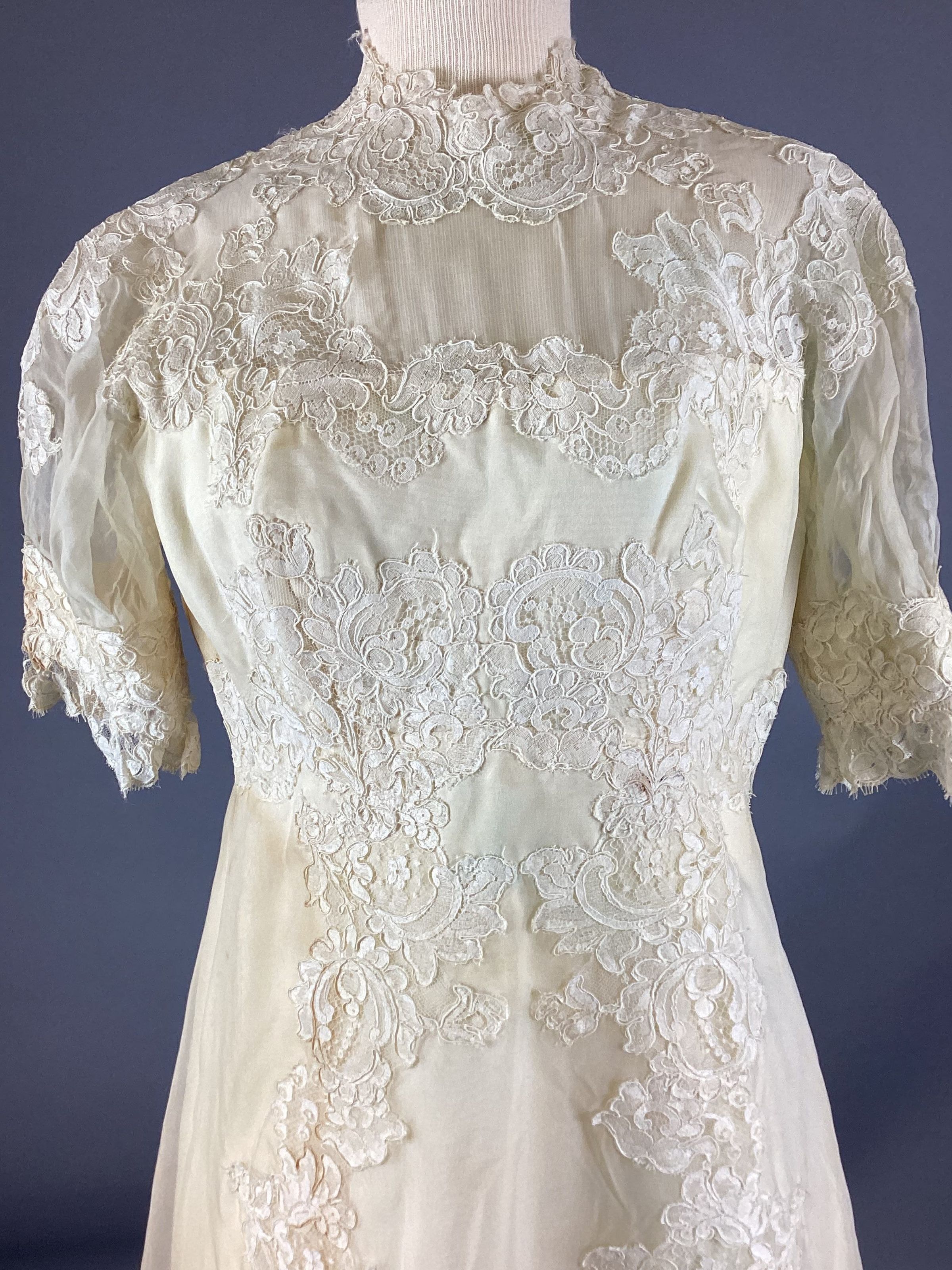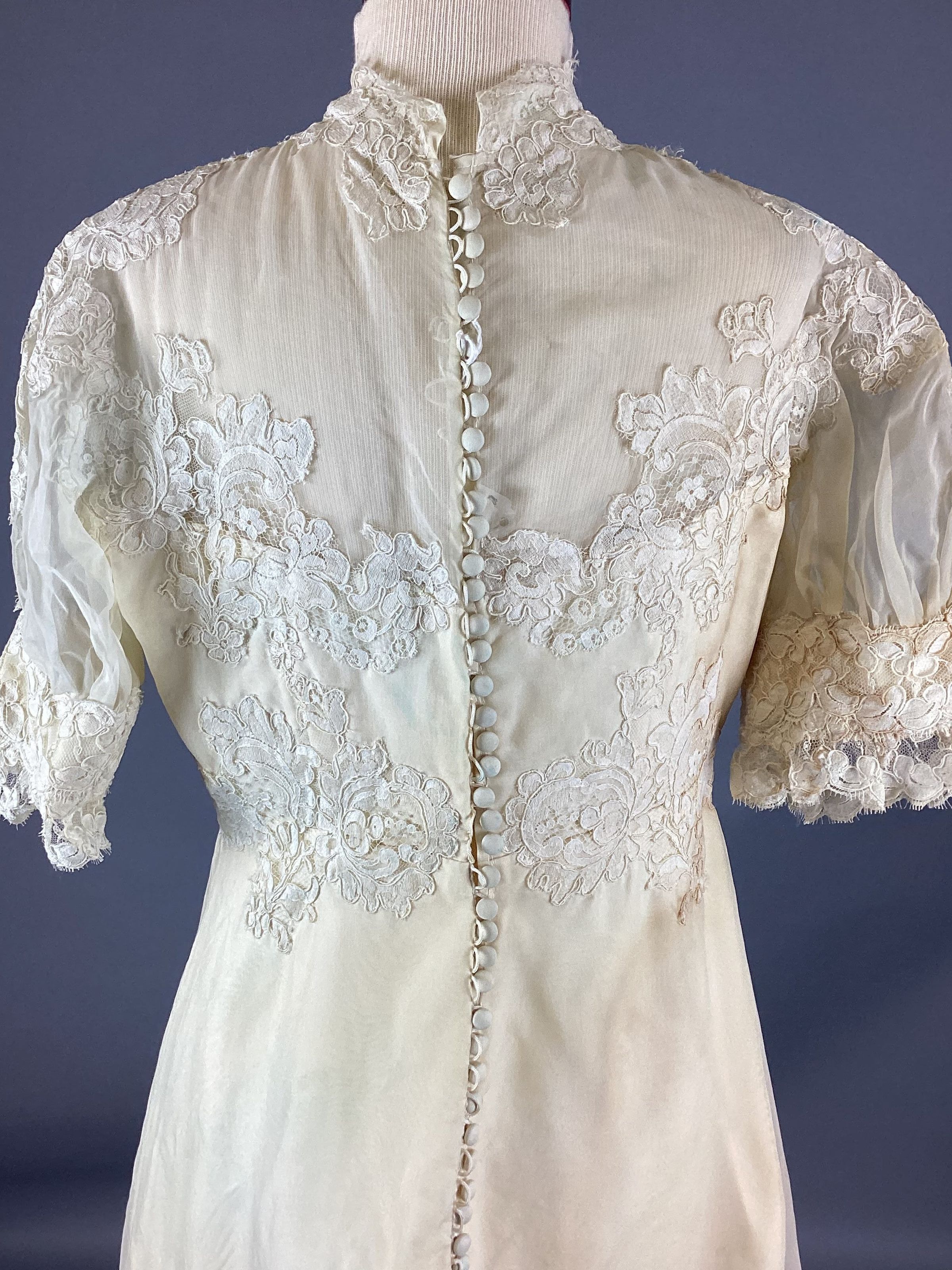 A wedding dress is made of taffeta and has lace detailing on the bodice as well as the skirt. Typical of many dresses from this period, it does not have a train. The dress has numerous satin buttons down the back of the bodice. The dress has short sleeves.Use