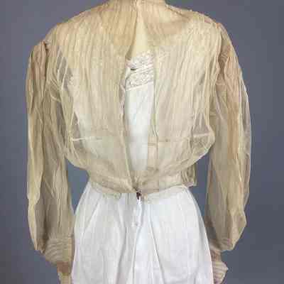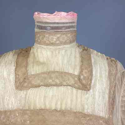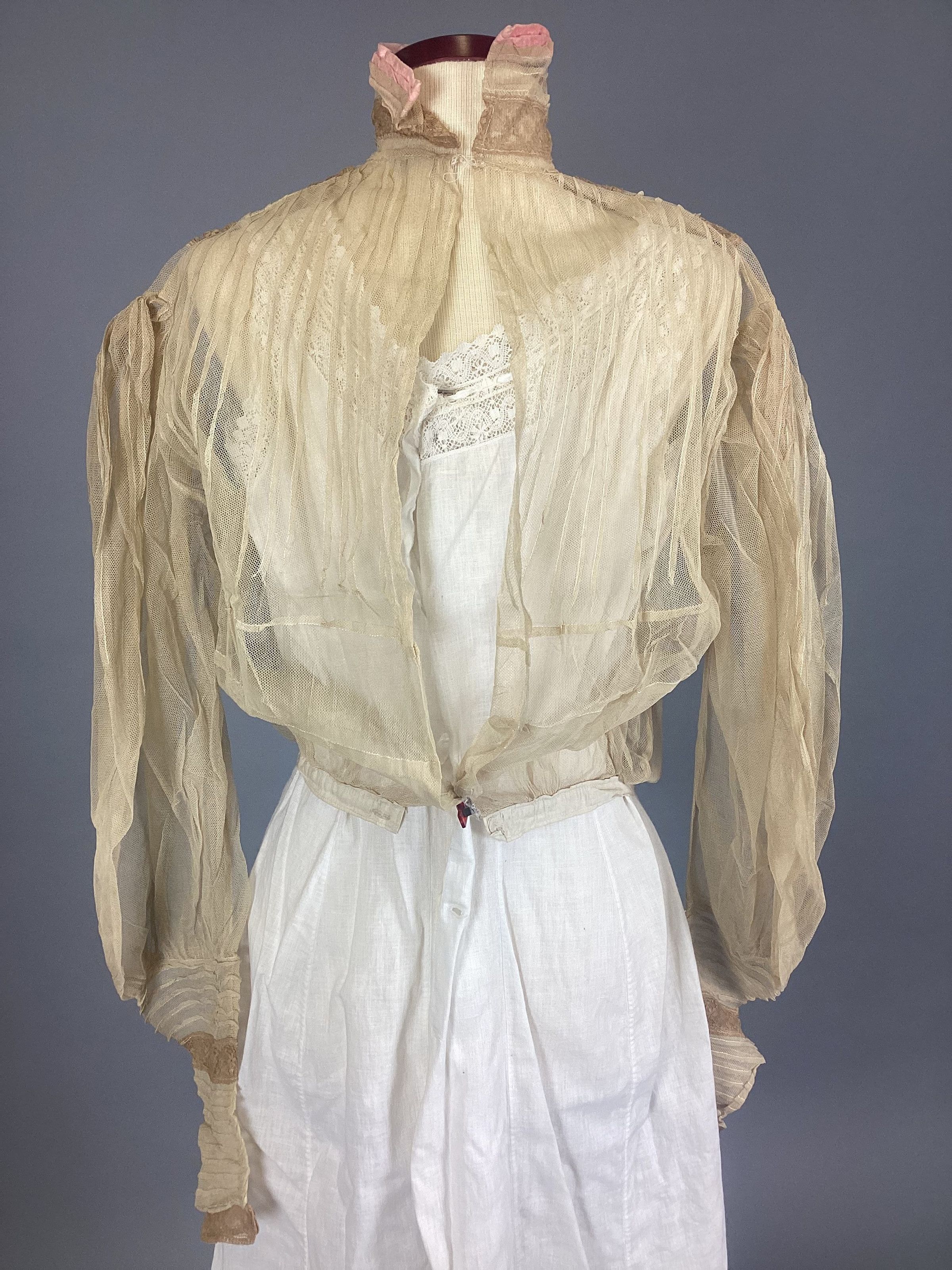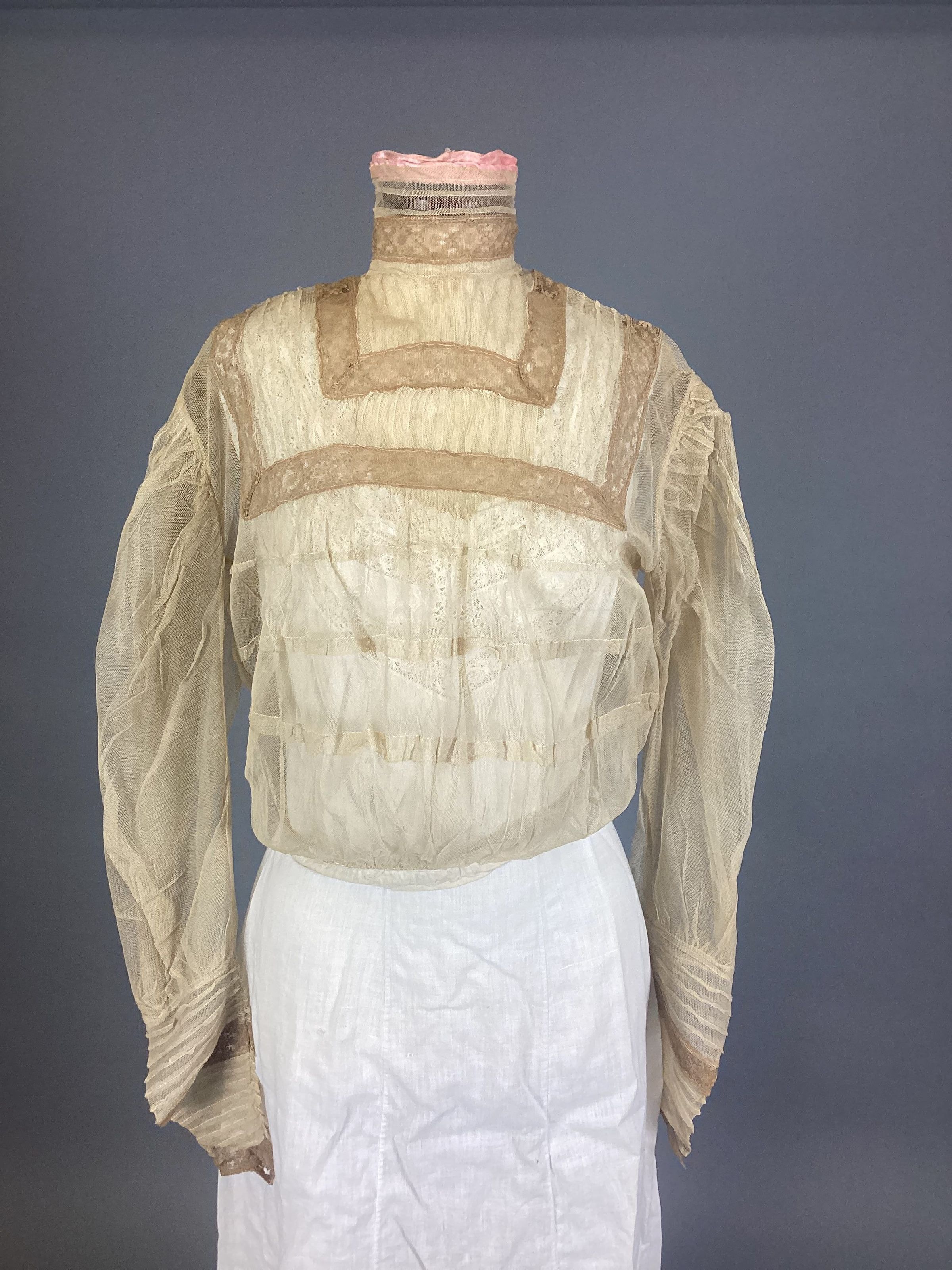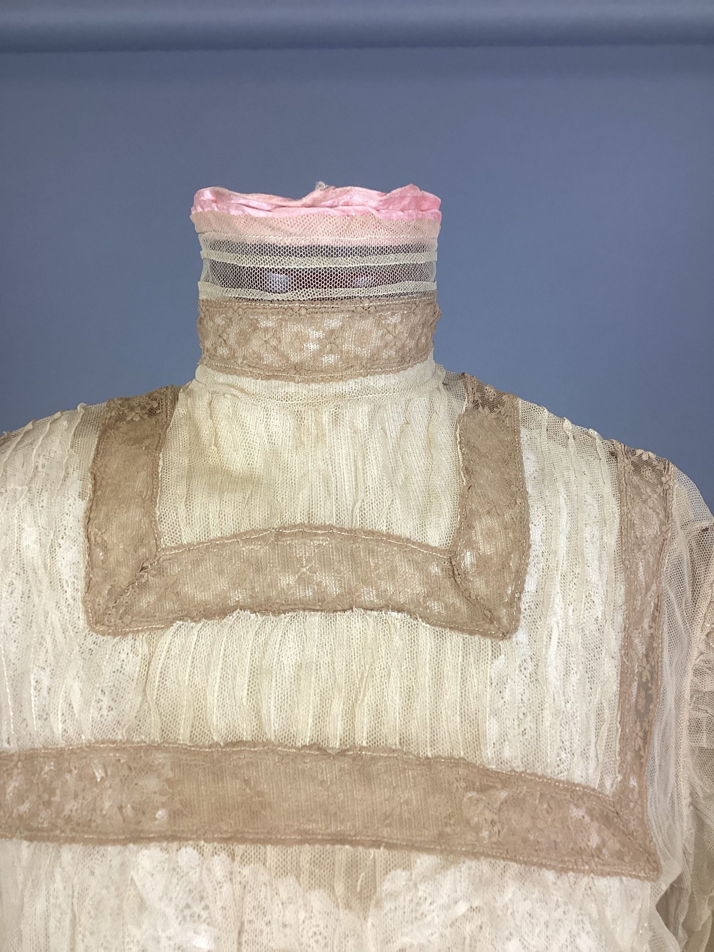 Tan net blouse; brown lace insertion on yoke, collar and cuff. Collar edged with pink satin.Collection