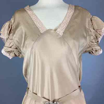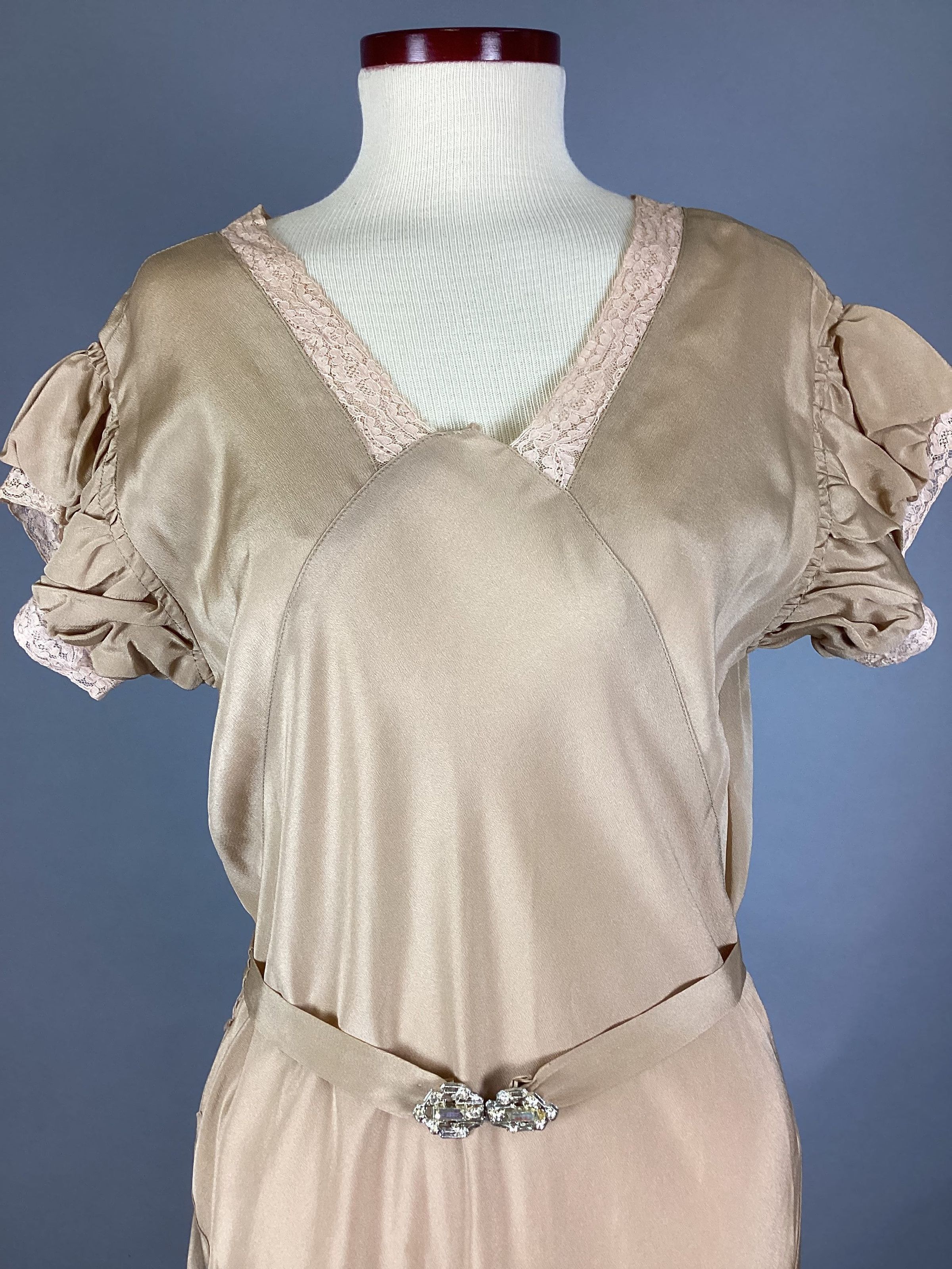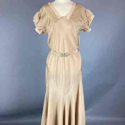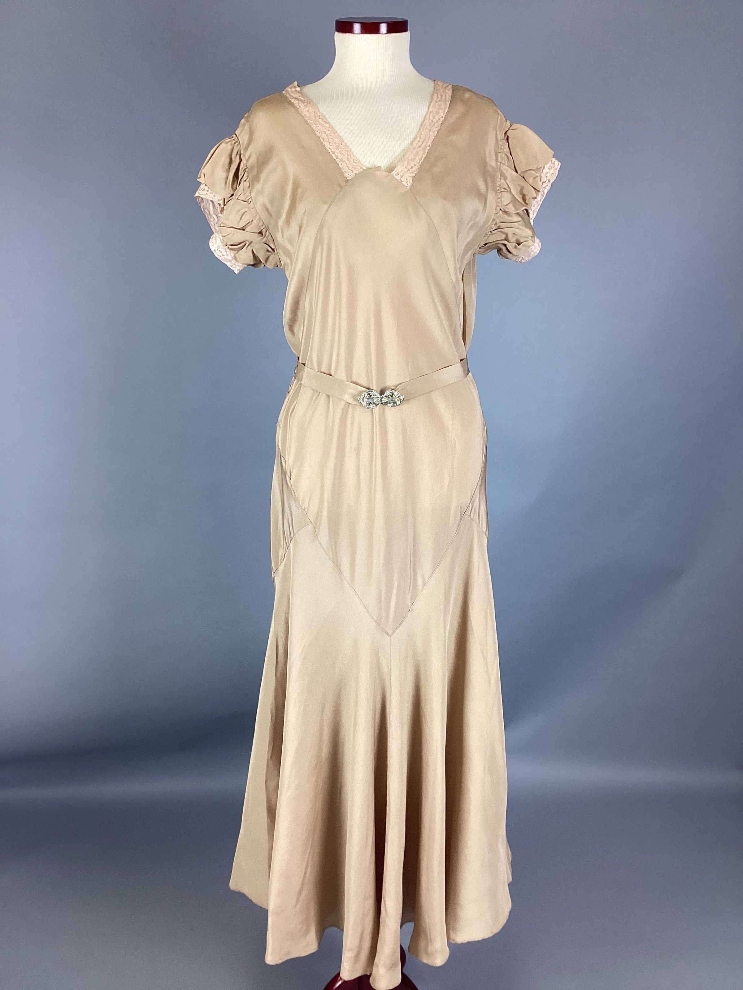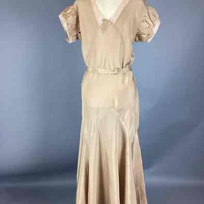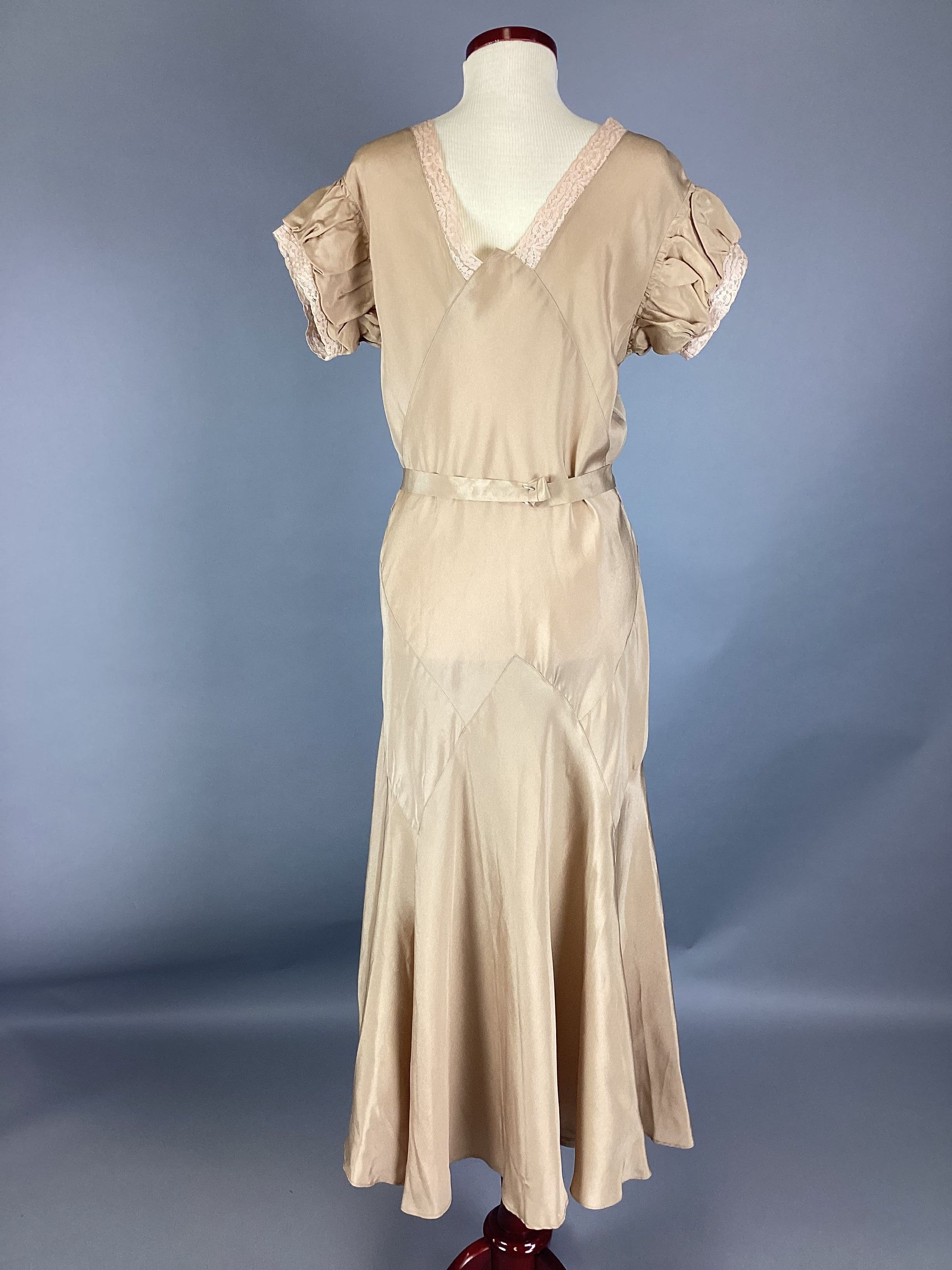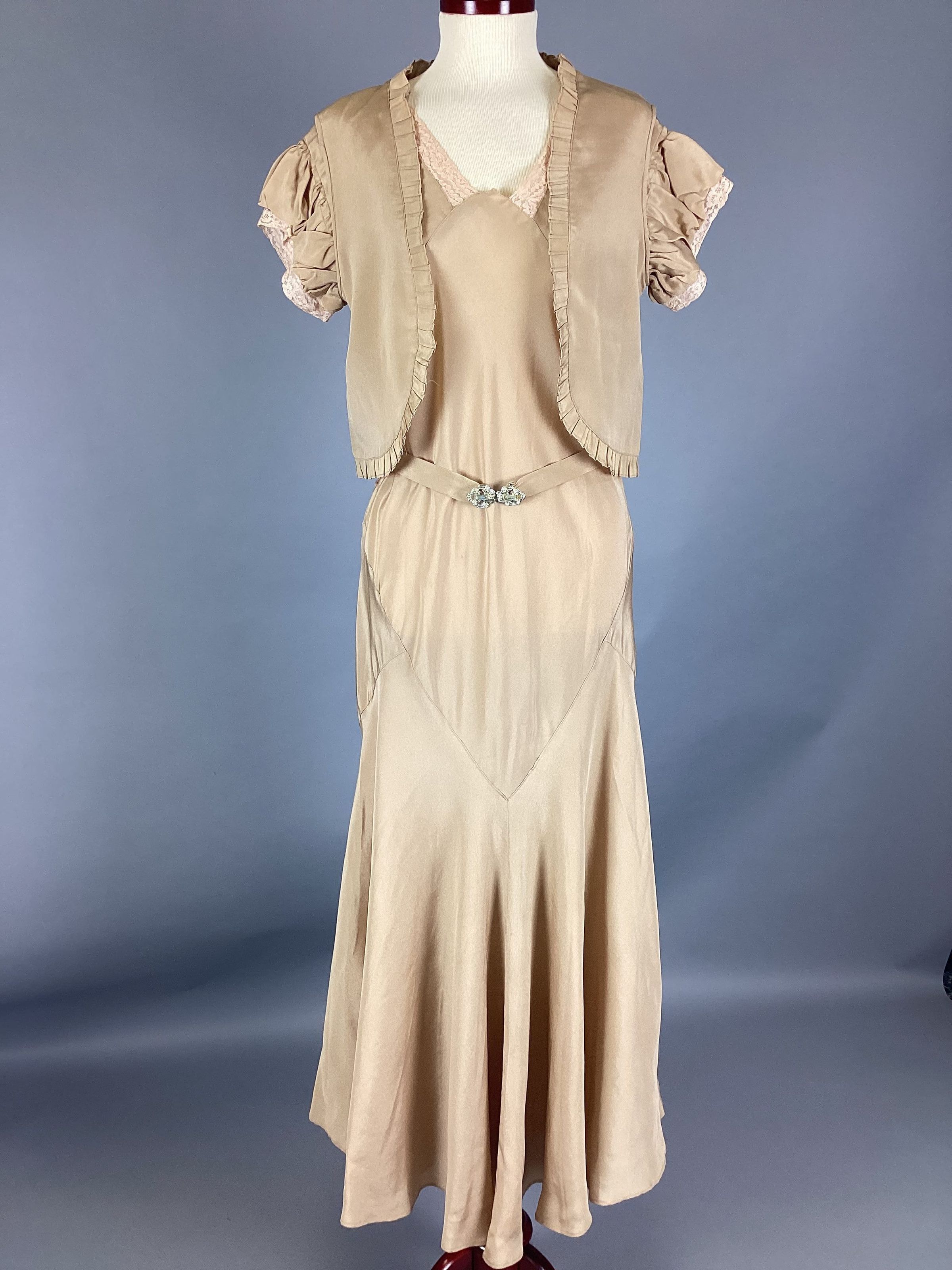 A: tan-faille wedding dress, U-neck front & back, lace around neck & short sleeves, Skirt has a flared gore across the bottom. B: Sleeveless bolero jacket w/ a pleated ruffle around front & bottom.