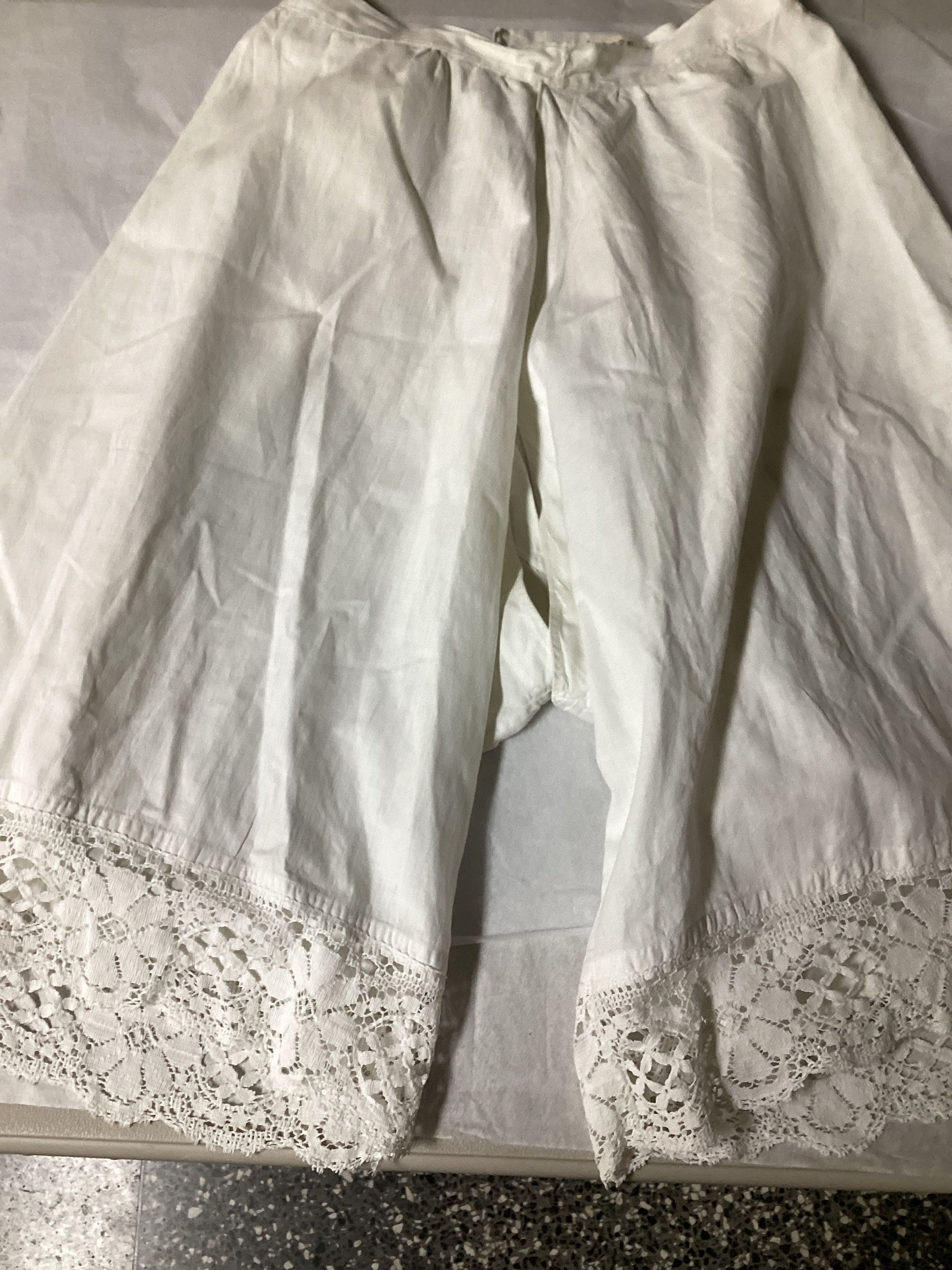 White cotton women’s drawers, open on both inner legs. Lace trim at bottom hems.Clothing/Dress/Costume Details