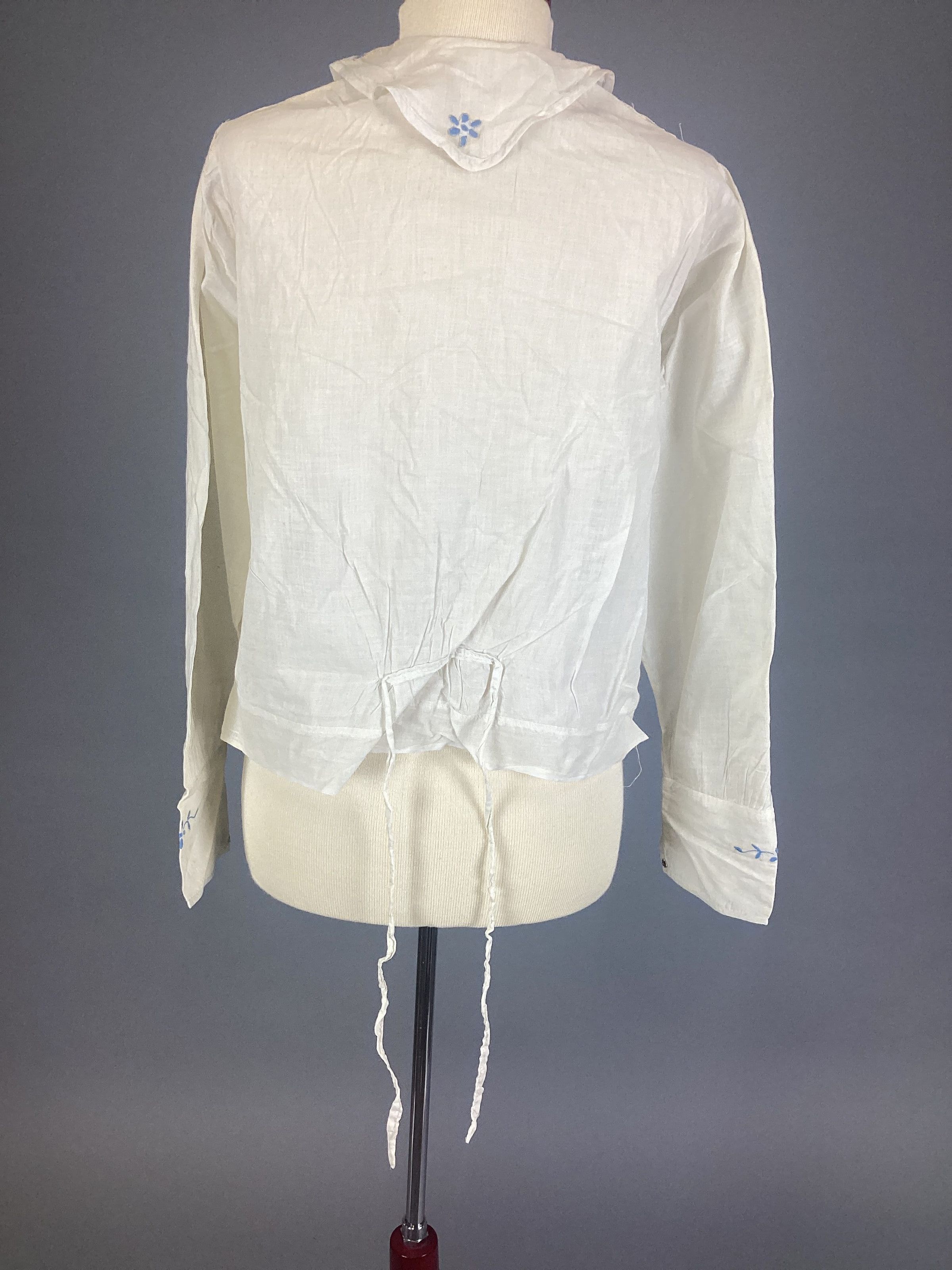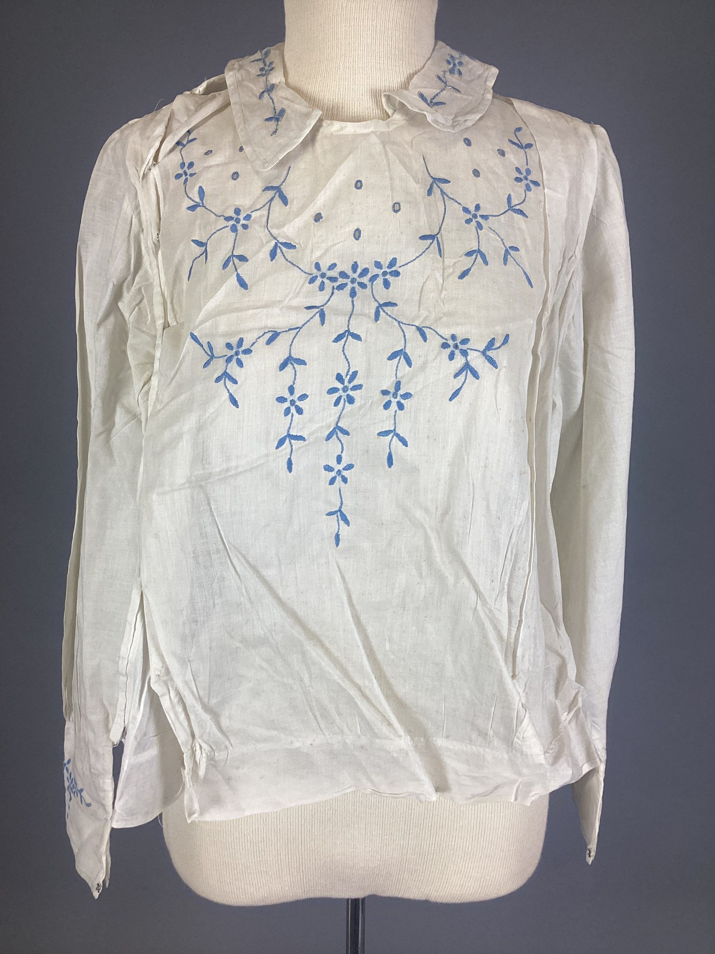 White cotton blouse; blue embroidery on front, collar and cuffs; side closing.Collection
