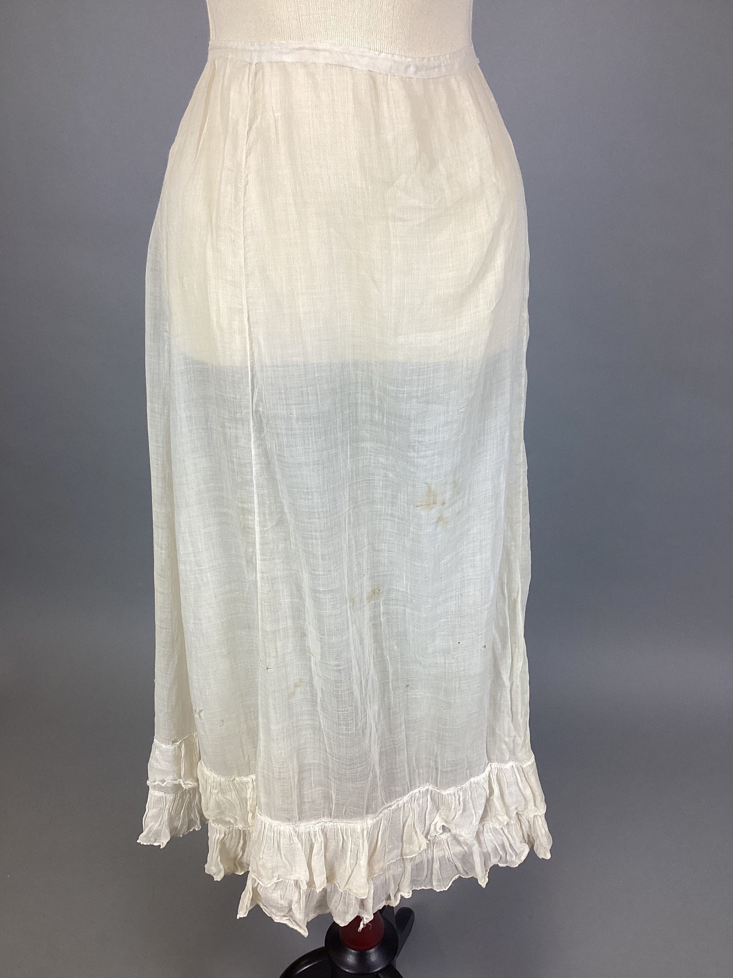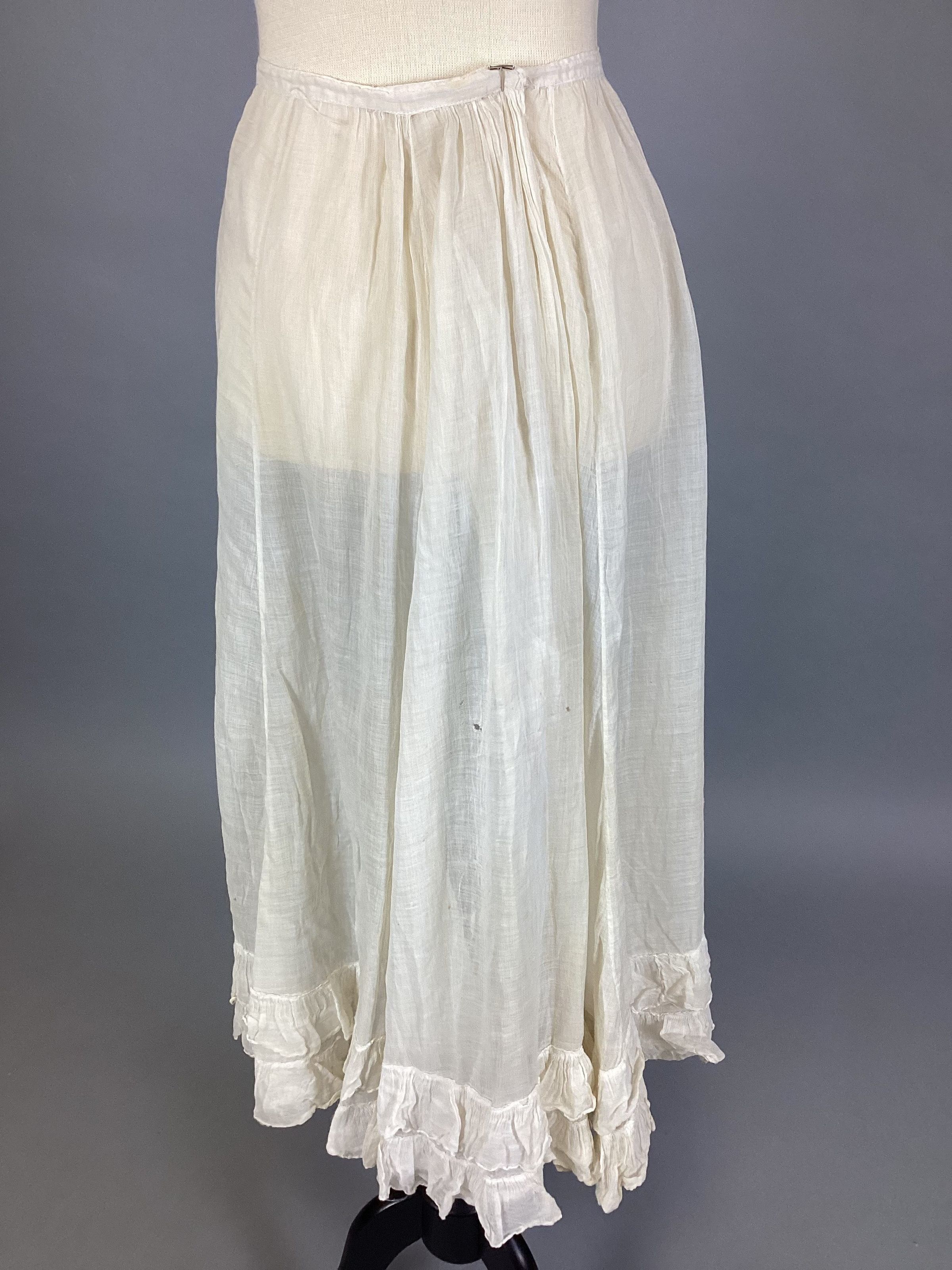 A sheer white cotton lawn over skirt, worn as part of a dress. The skirt has seven panels and a banded waistband with a button fastener in the back. There are two tiers of gathered fabric which create a ruffle at the bottom of the skirt. See also: 2009.016.002, .004, .005.