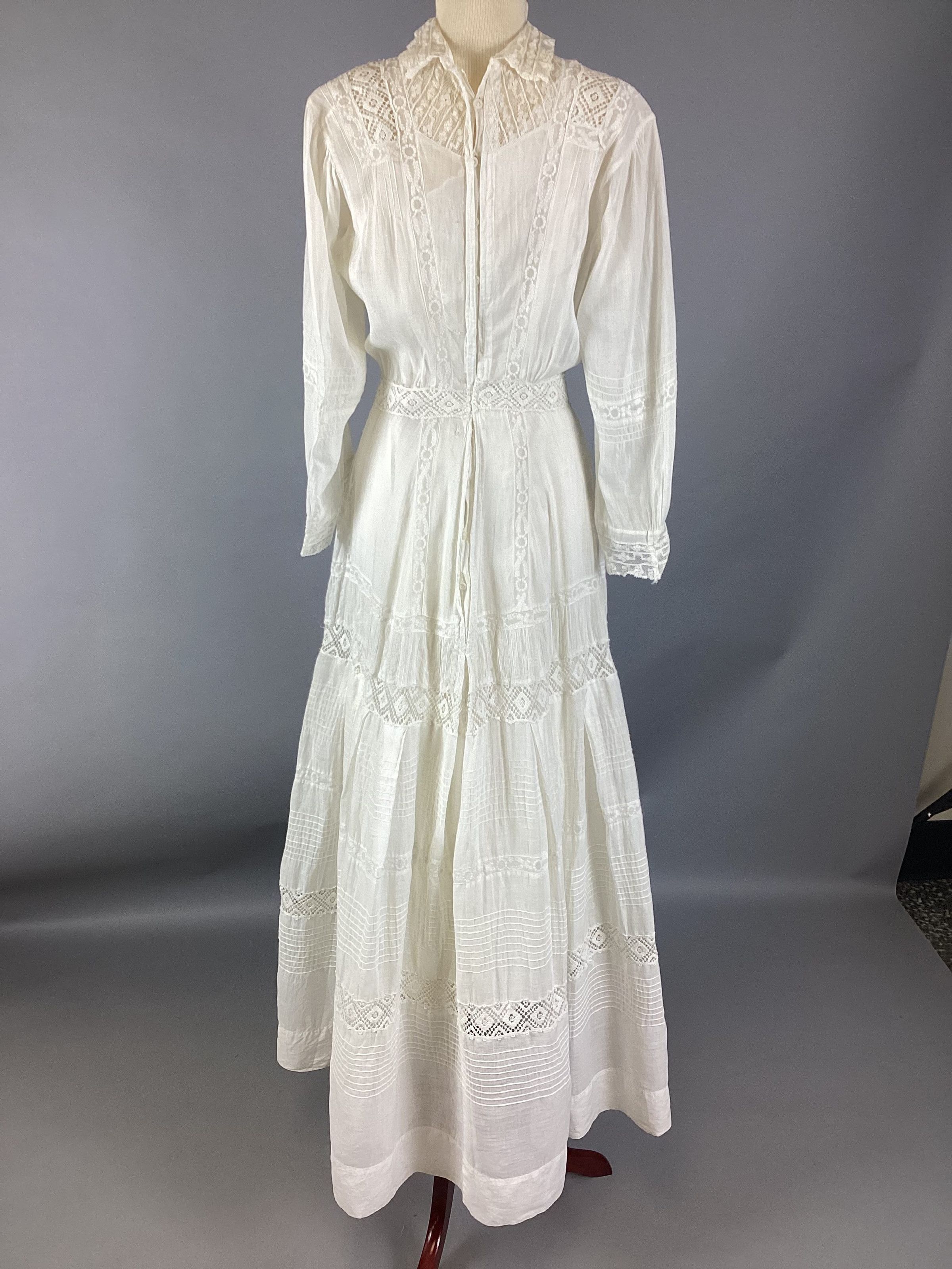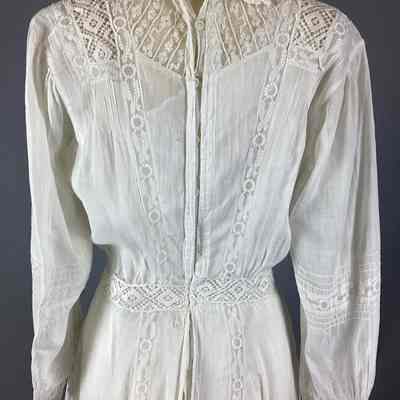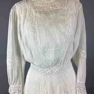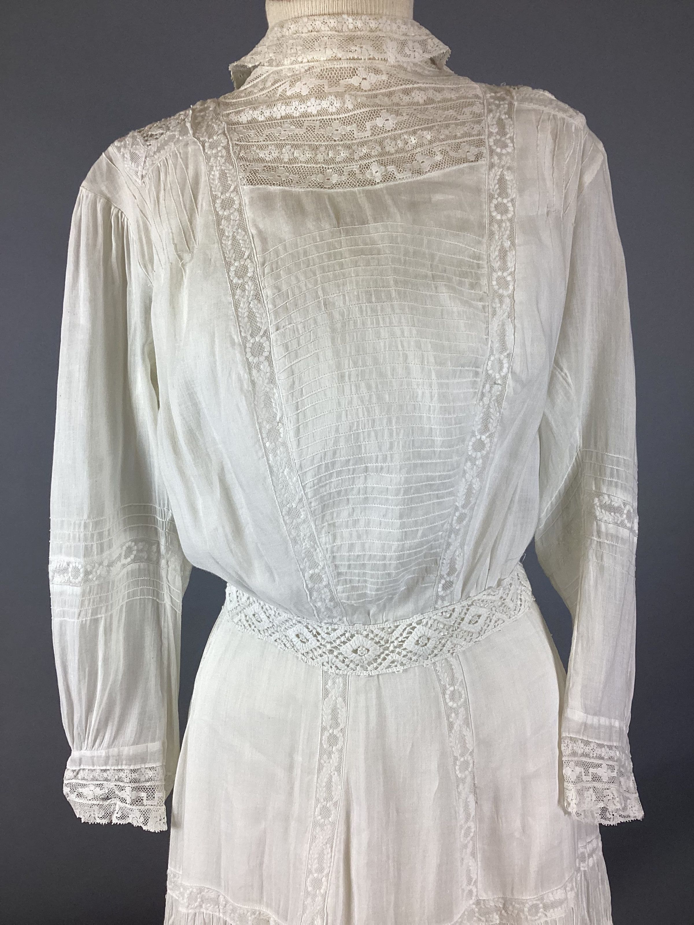 Tons of lace and tucks in the skirt waist. Blouse had lace collar and yoke inset. Very find tuck on front of blouse. Blouse buttons down back and buttons are on inside making a hidden placket. Long sleeves with lace and tucks.