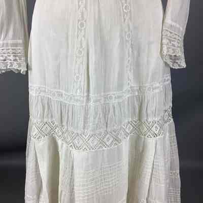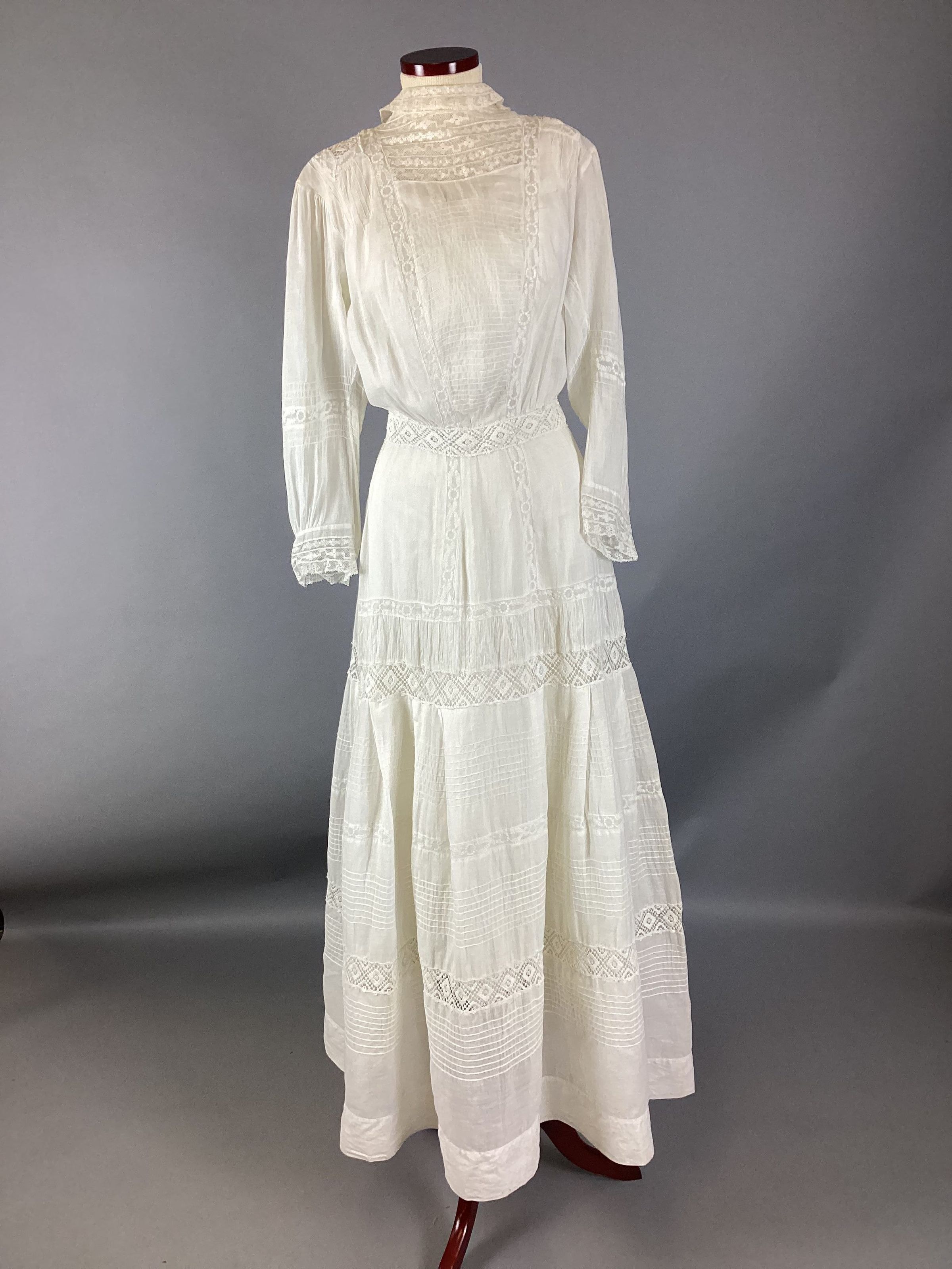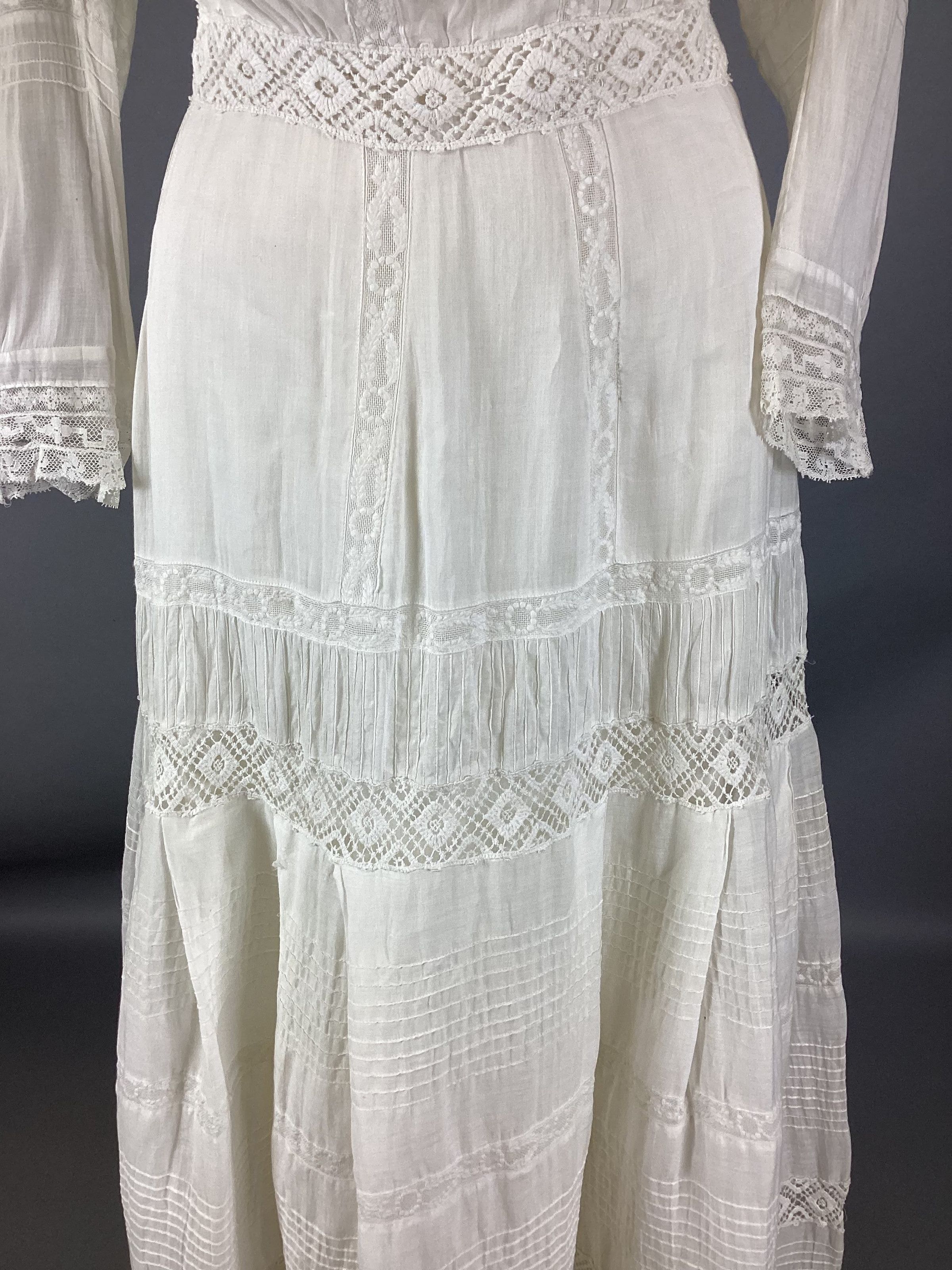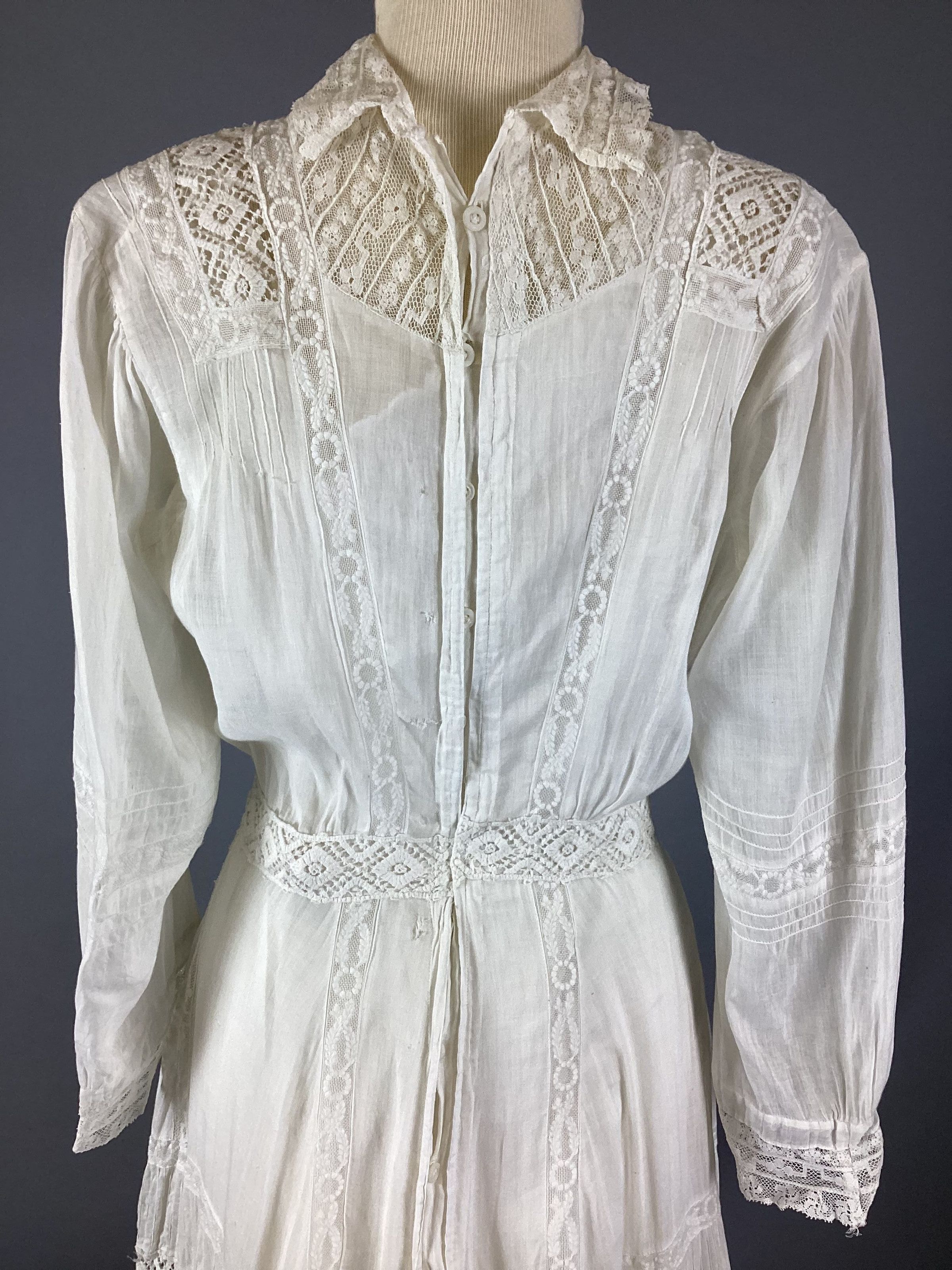 Tons of lace and tucks in the skirt waist. Blouse had lace collar and yoke inset. Very find tuck on front of blouse. Blouse buttons down back and buttons are on inside making a hidden placket. Long sleeves with lace and tucks.