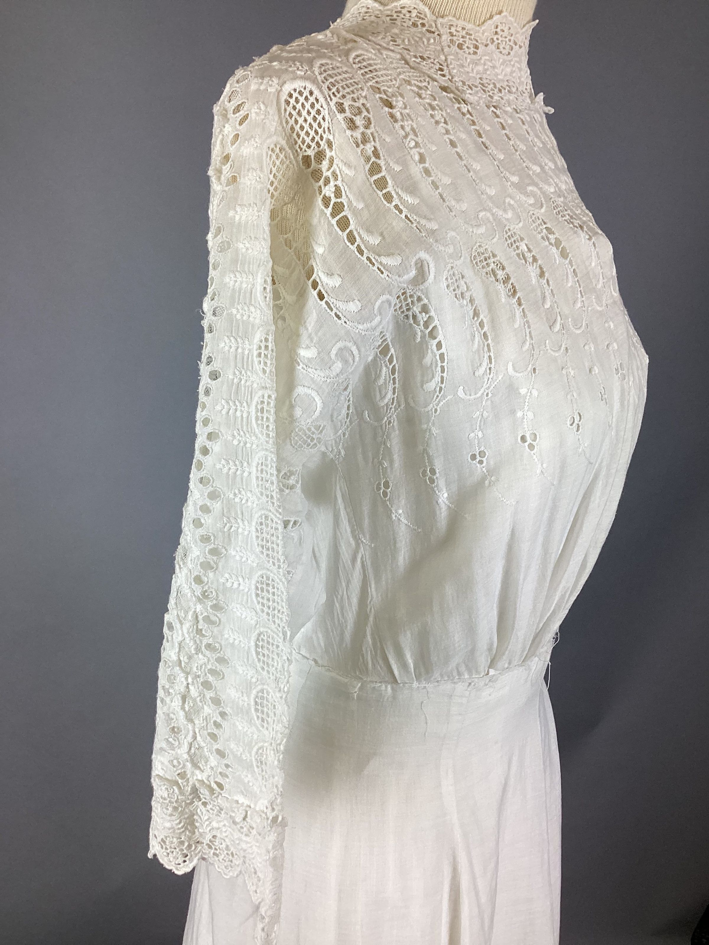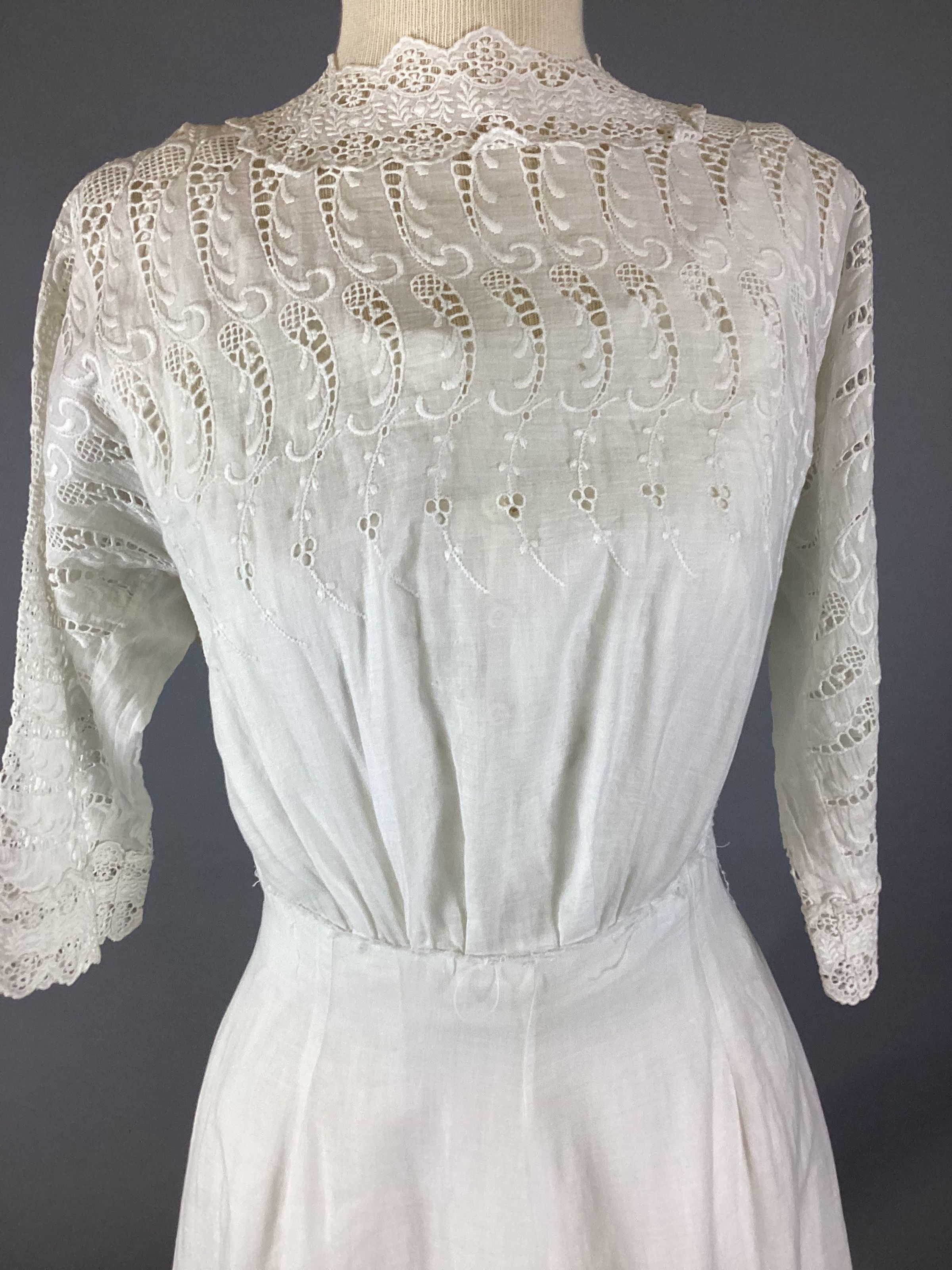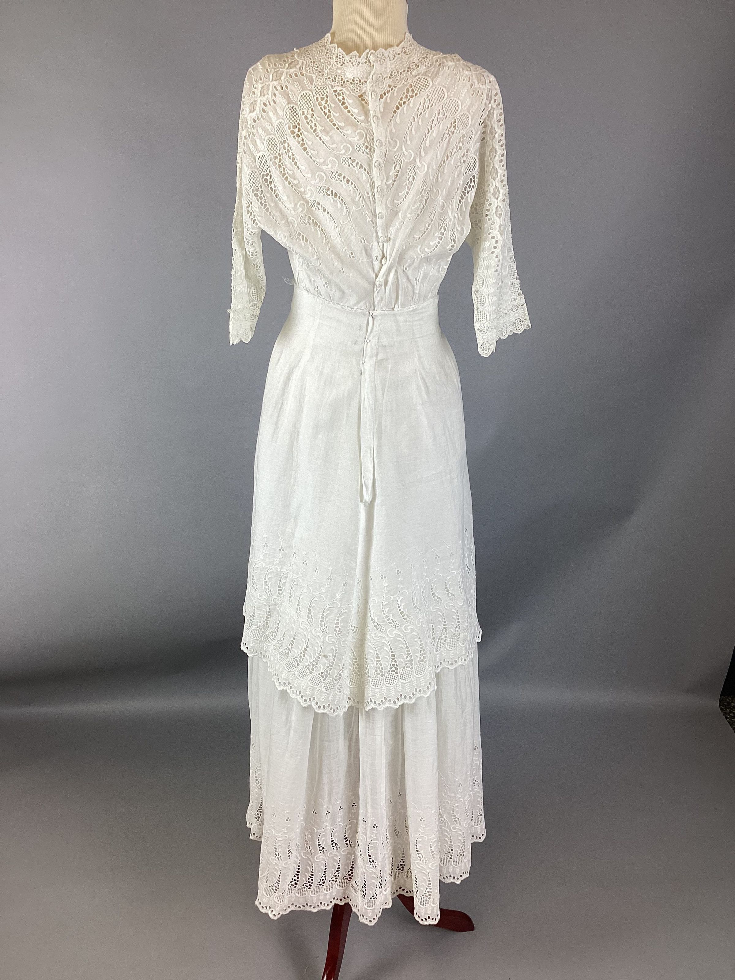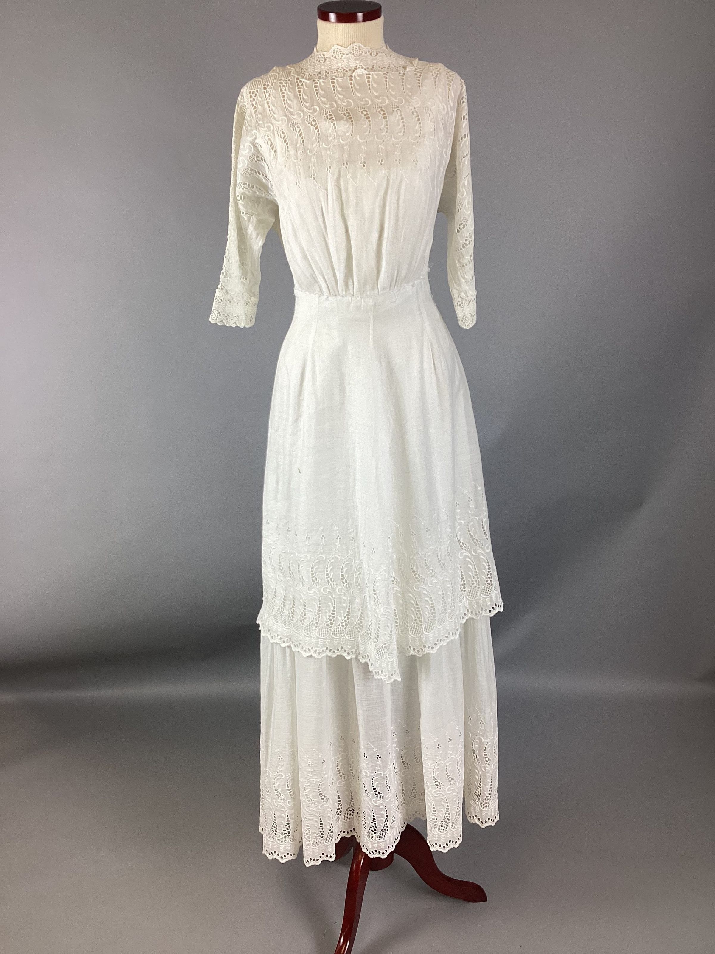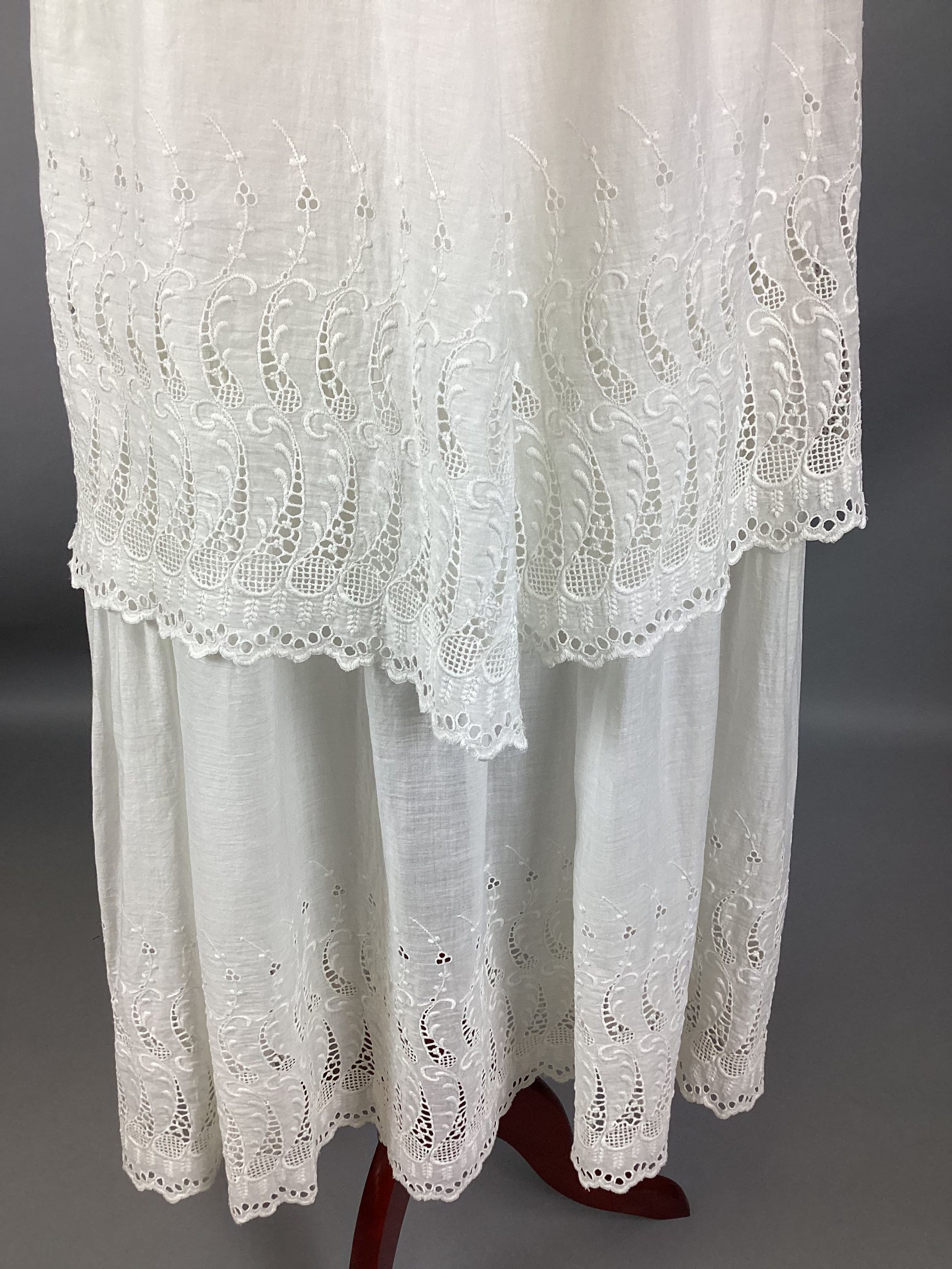 Lingerie-type white lawn with lace yoke, dog collar neck w/silk rucking around top of cap sleeve and yoke. B: Skirt is lingerie type of whte lawn material. Front made of 3 gores, back gathered w/ cartridge pleats, ruffle w/lace insertion in tucks and edging, a slight train in back. Small double-ruffle edging at top of large ruffle at bottom. C: Petticoat is lawn material same as skirt with plain ruffle at bottom and tucks at top of ruffle.Use