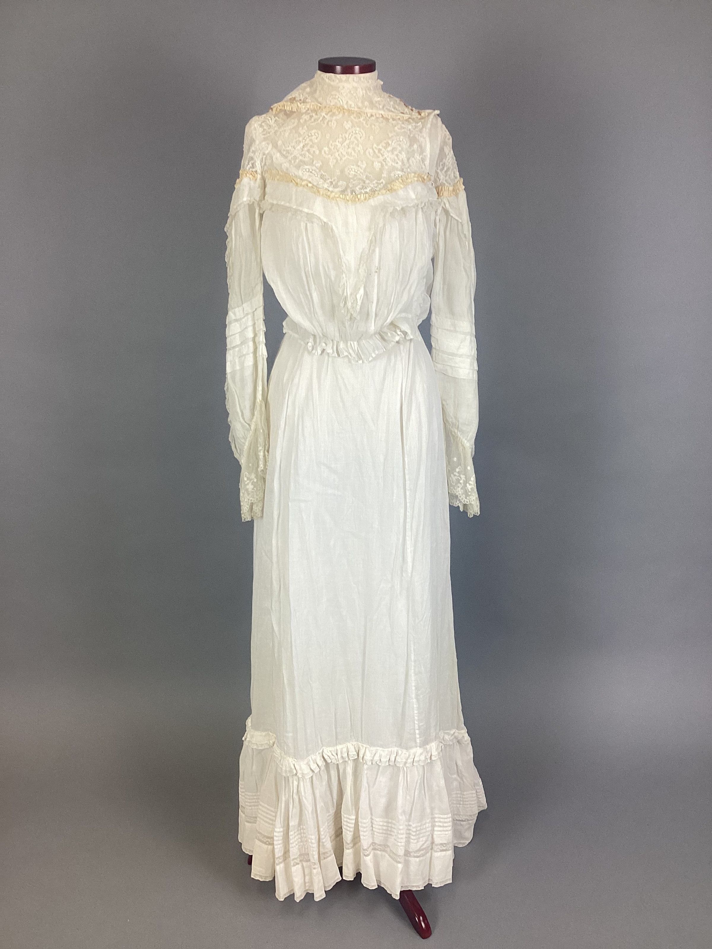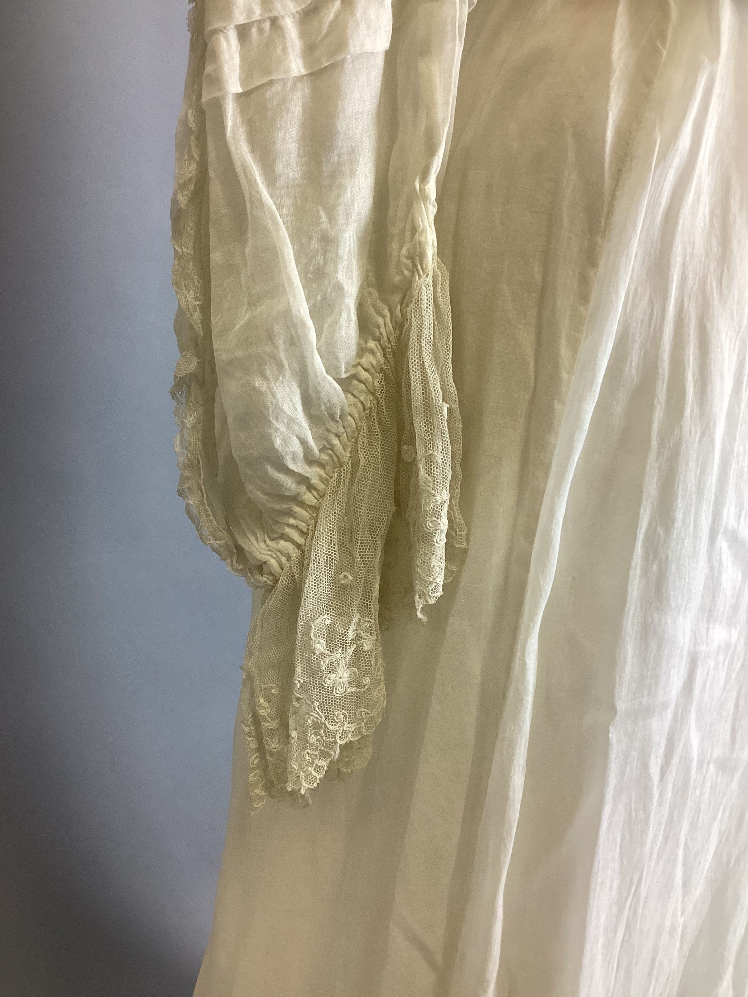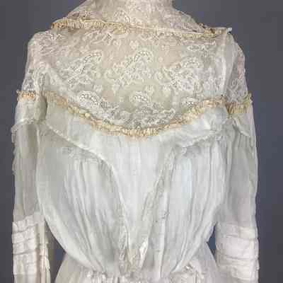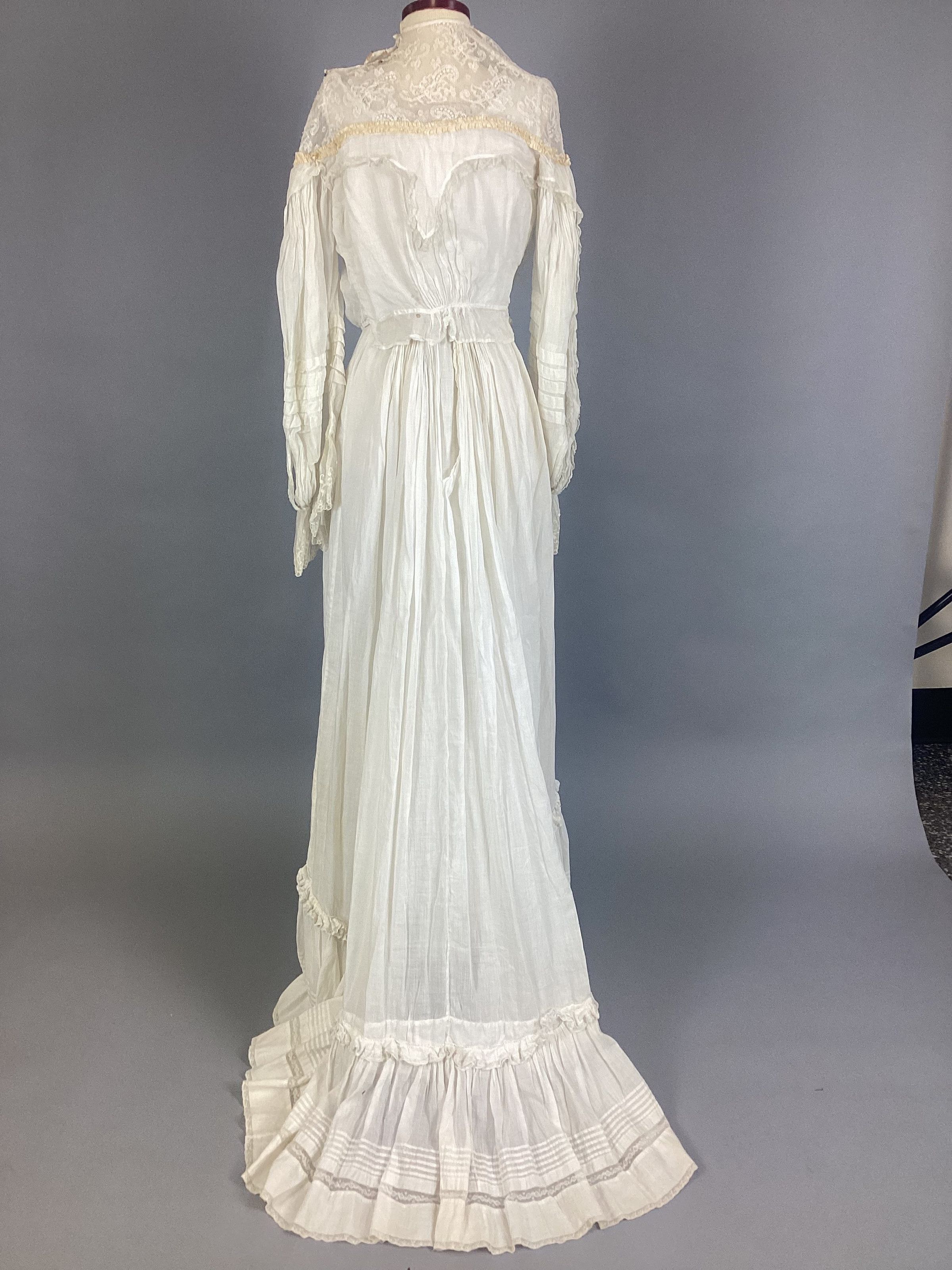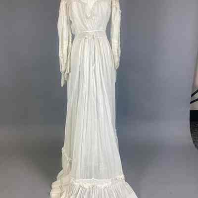 A lingerie-type white sheer muslin with eyelet embroidery, kimono sleeves, empire-style with bodice in one piece, elbow-length sleeve. Two-tiered skirt with eyelet embroidery, overdress made of the same material, buttons up back with small crocheted buttons. Sub-numbered A-C.Collection