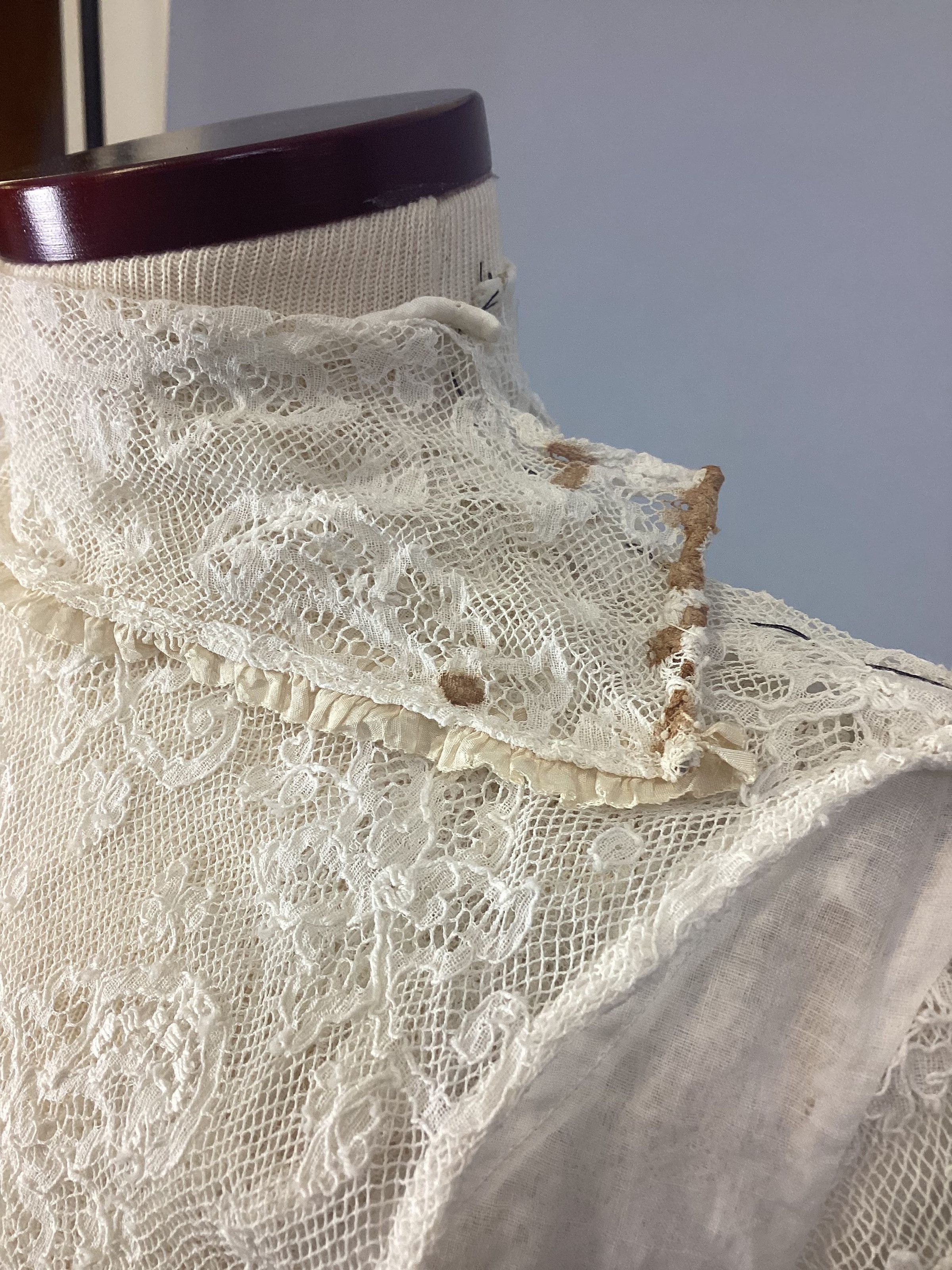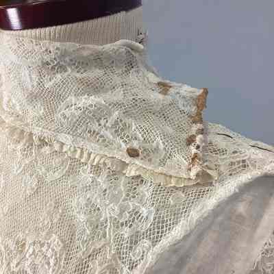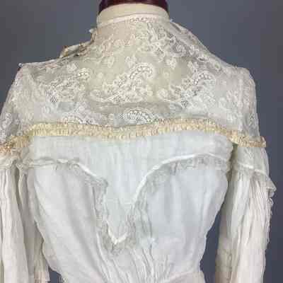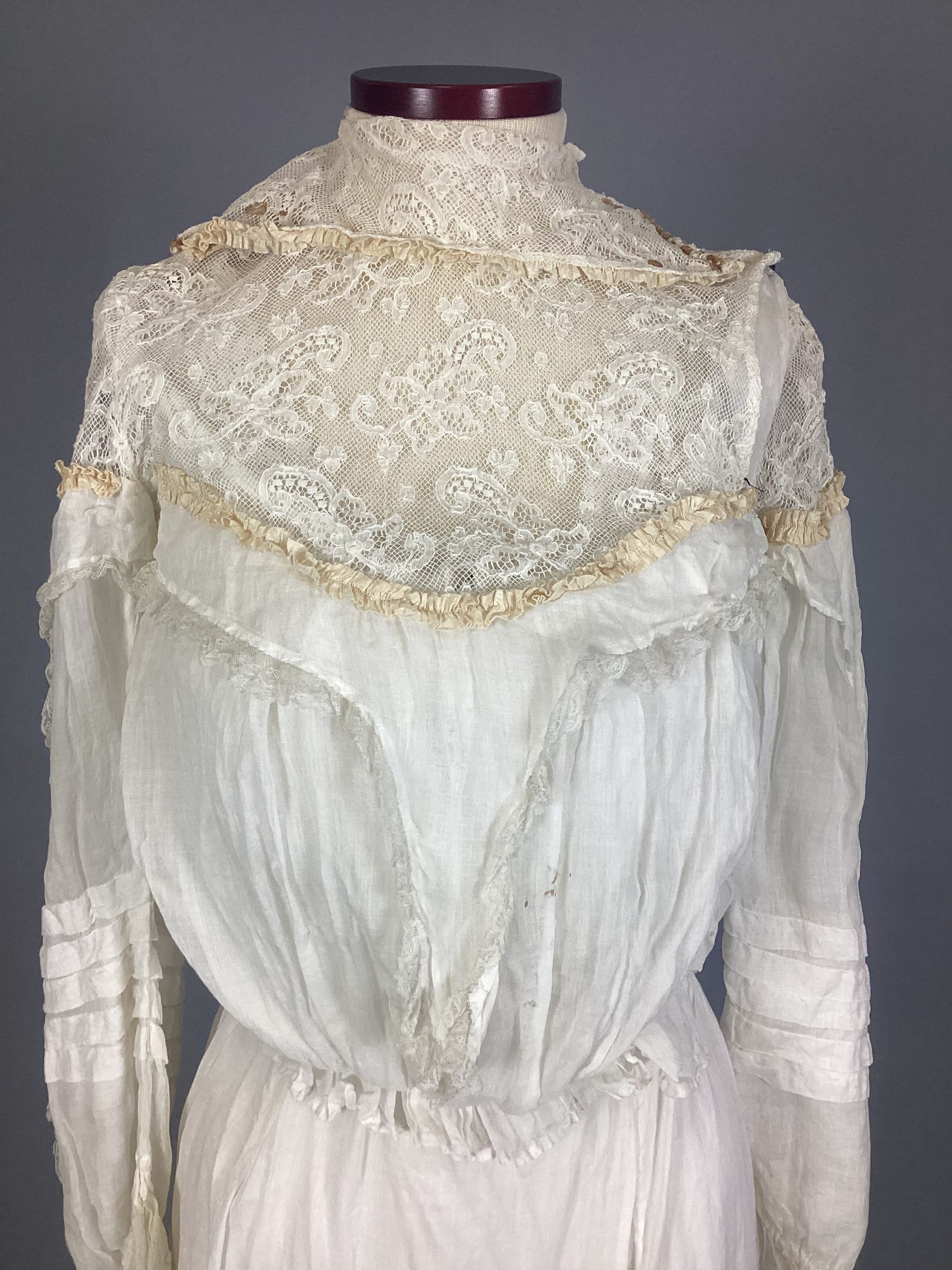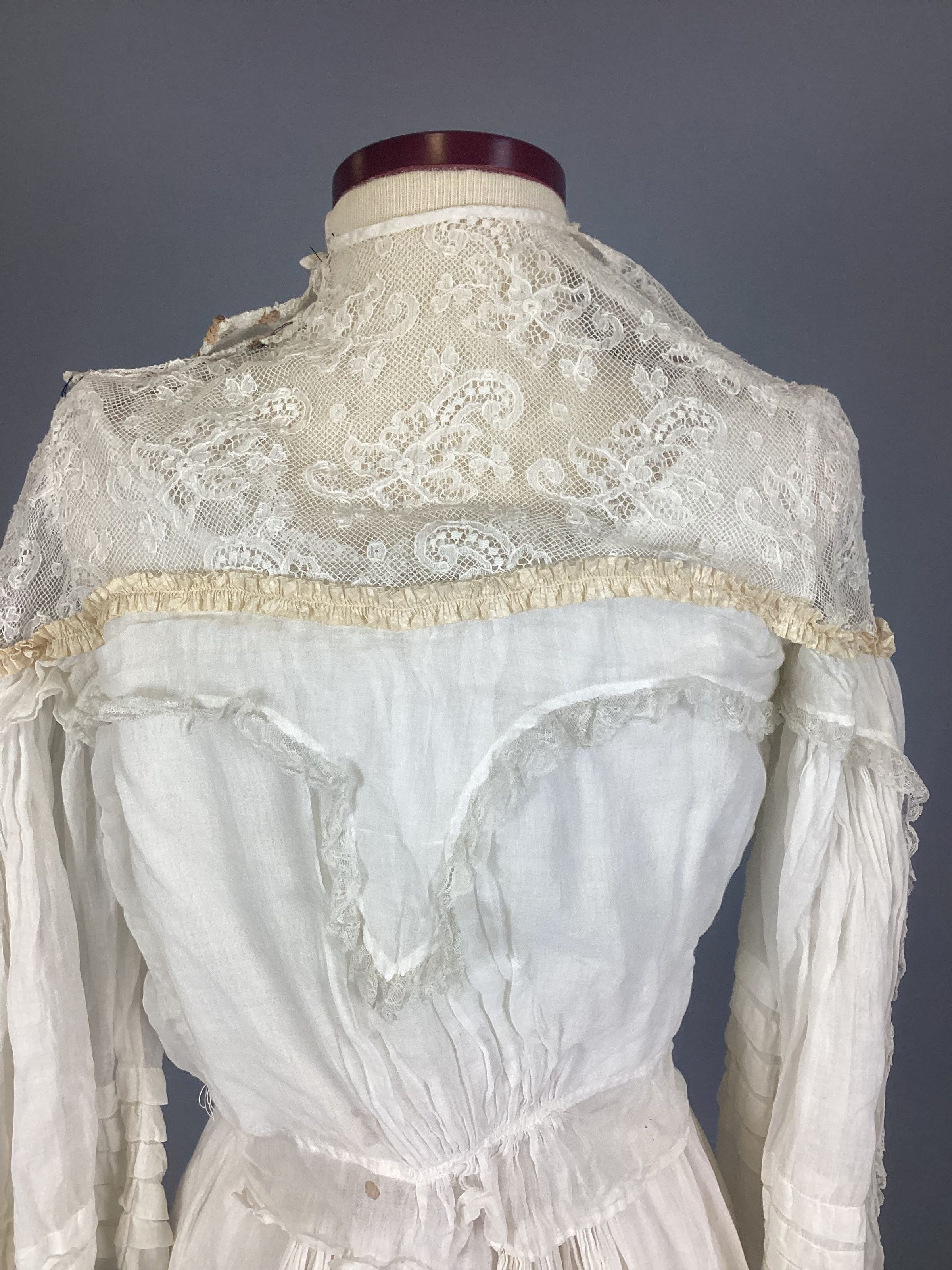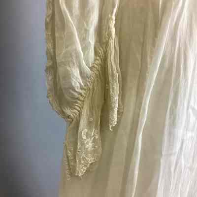 A lingerie-type white sheer muslin with eyelet embroidery, kimono sleeves, empire-style with bodice in one piece, elbow-length sleeve. Two-tiered skirt with eyelet embroidery, overdress made of the same material, buttons up back with small crocheted buttons. Sub-numbered A-C.Collection