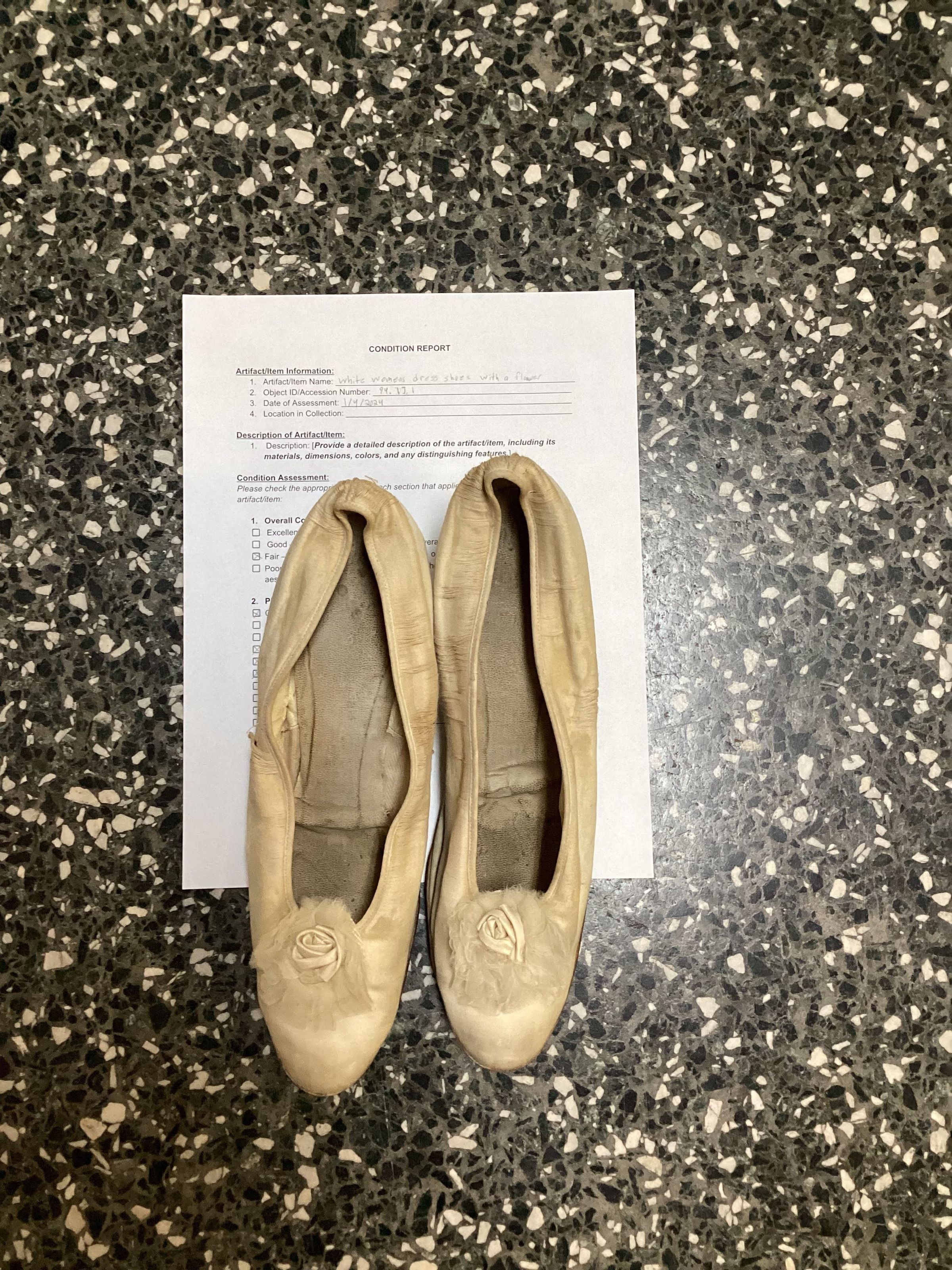A pair of women's white silk wedding shoes. Each shoe has a white organza flower on top of the toe.Clothing/Dress/Costume Details