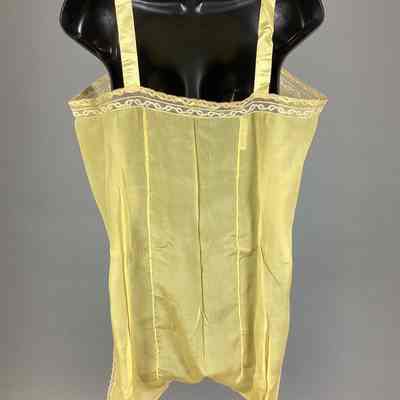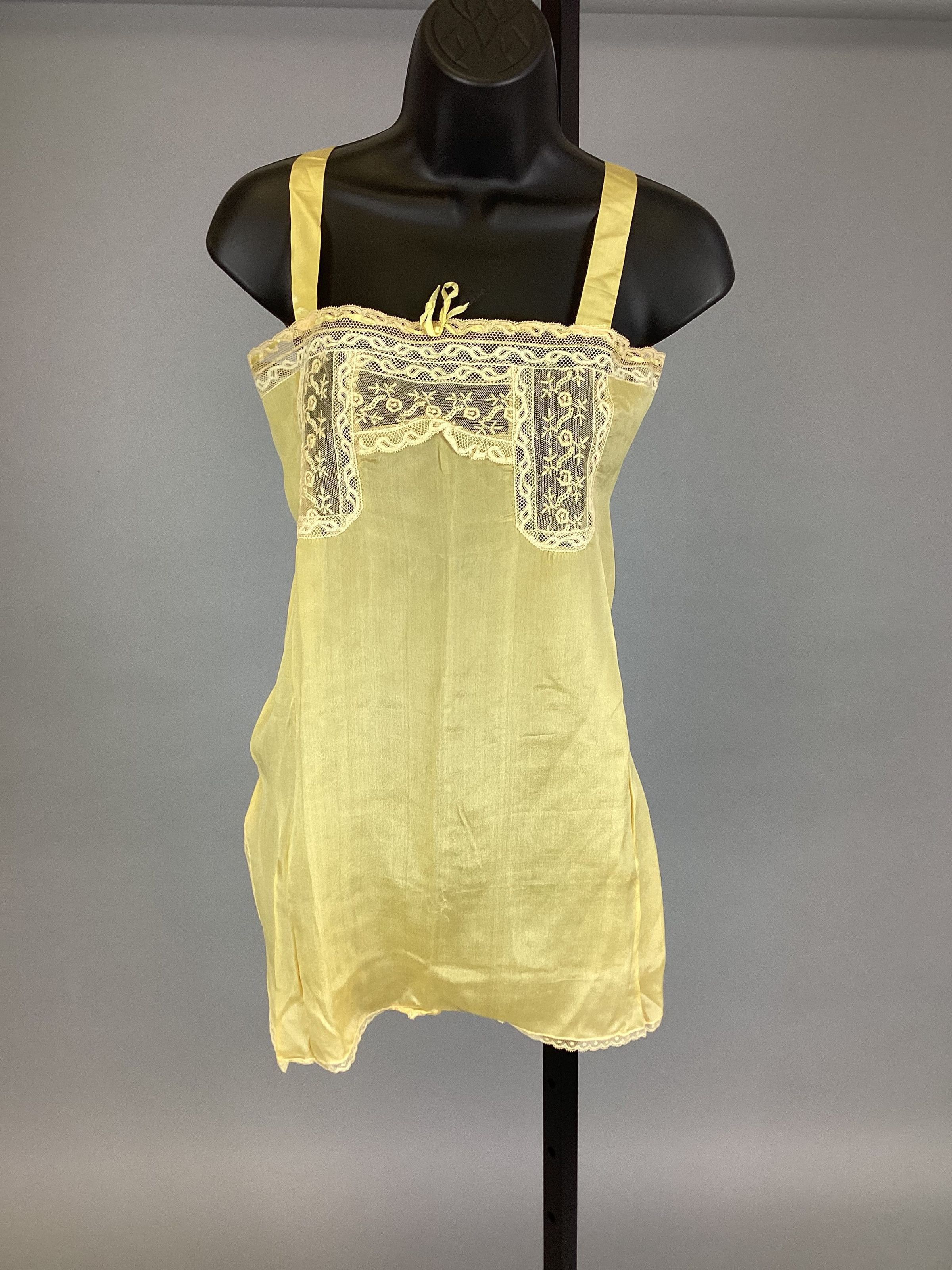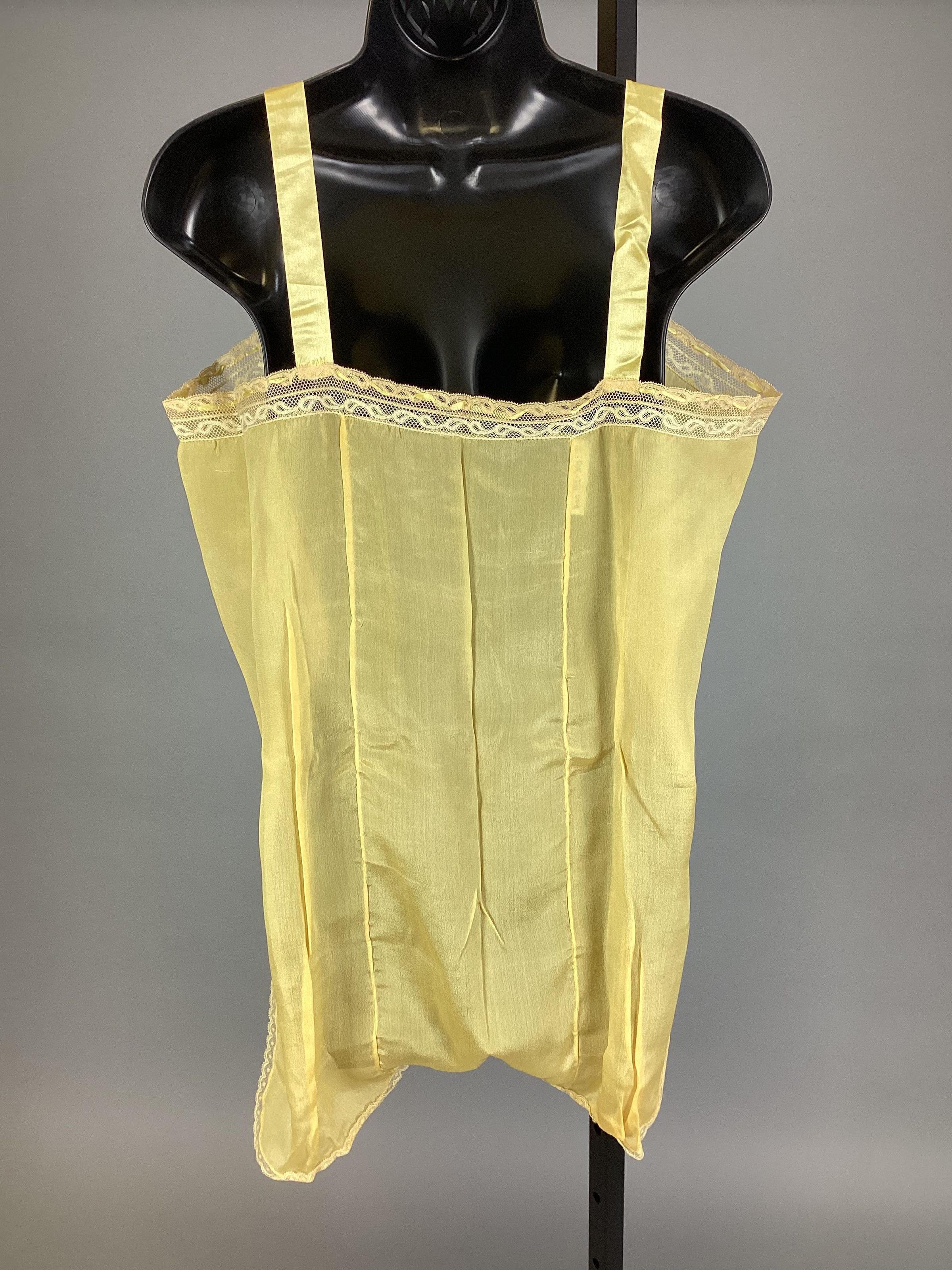 Teddy romper, yellow, elaborate lace trim in front, lace on back. Small yellow drawstring ribbon to fit to size. Wide yellow ribbon for straps.Collection