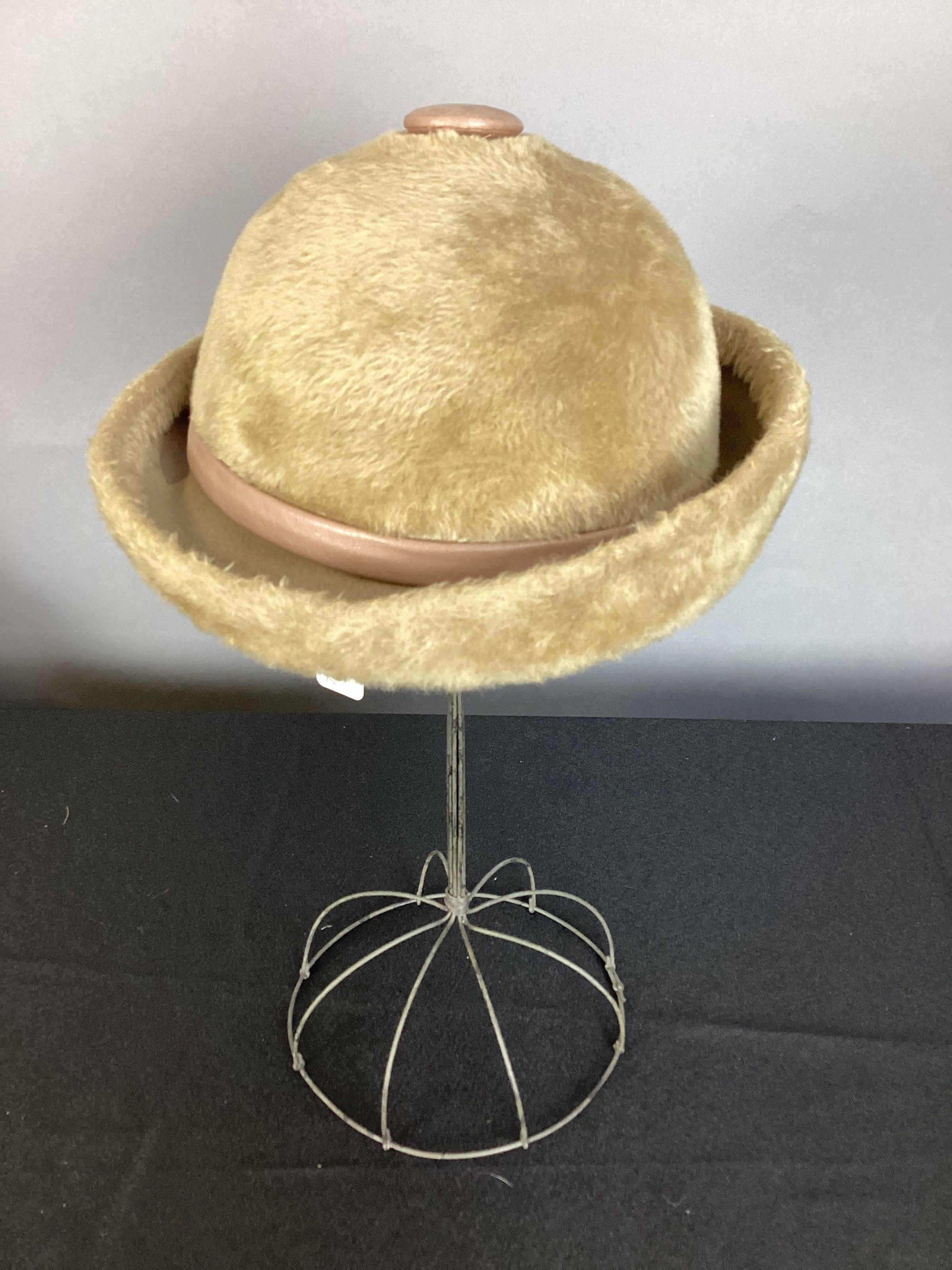 Beige imitation fur, brown plastic button on top, brown plastic band. Body of hat was made in Italy.Collection