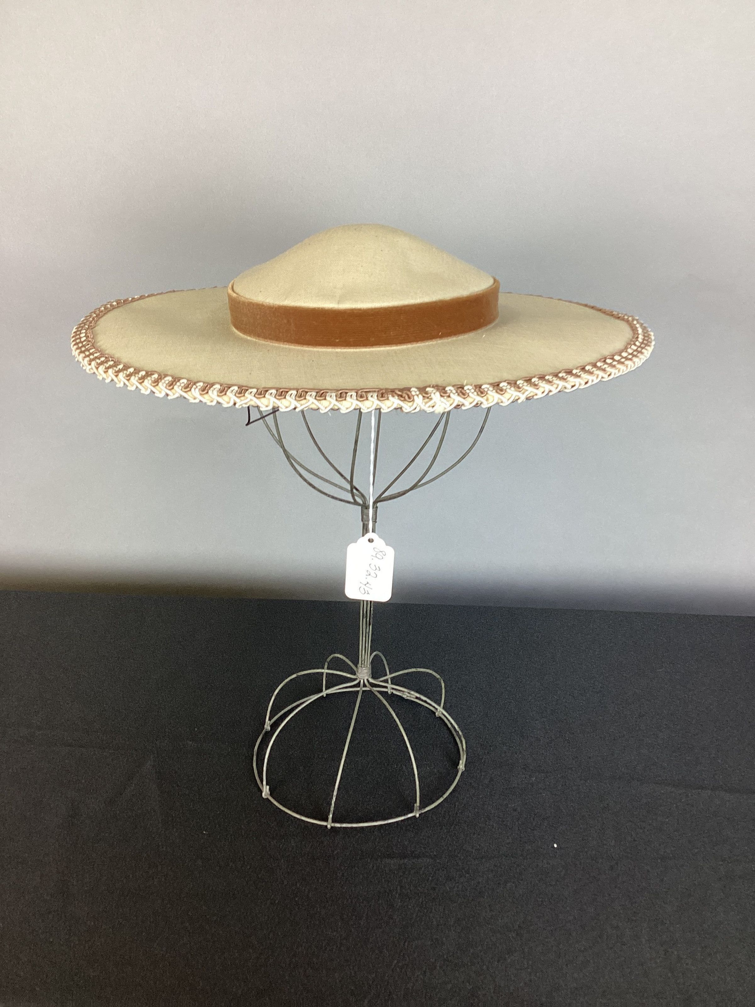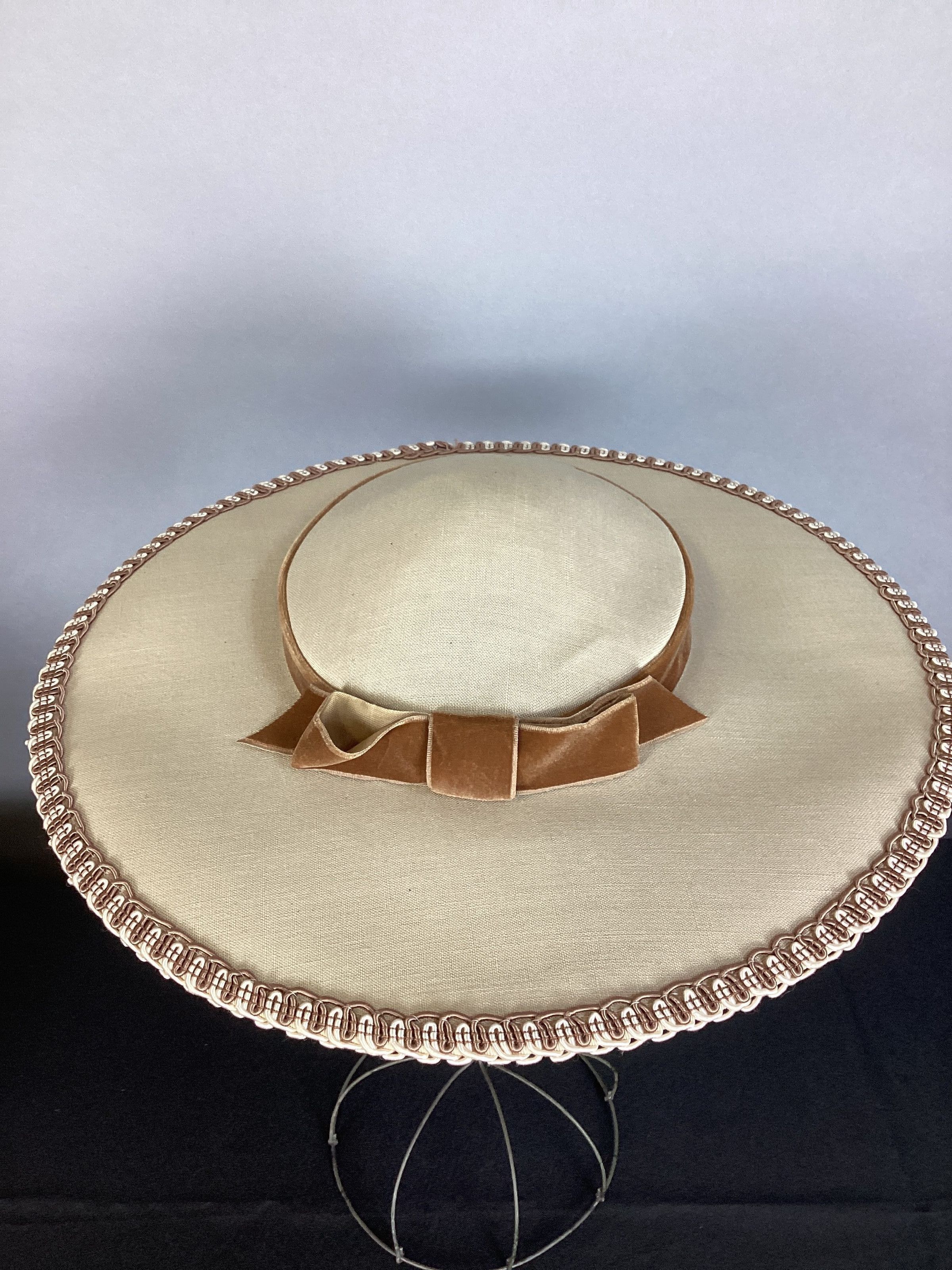 Beige linen brim and crown with 1" brown velvet ribbon around crown, a velvet bow in front, brown and ecru braid around outside of brim; small head huggers on each side of inside on hat to hold it on. A black elastic cord has been added to help hold the hat on.Collection
