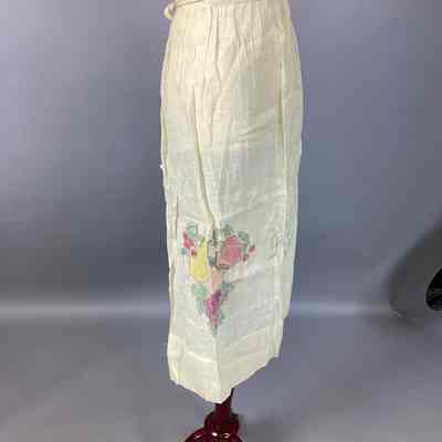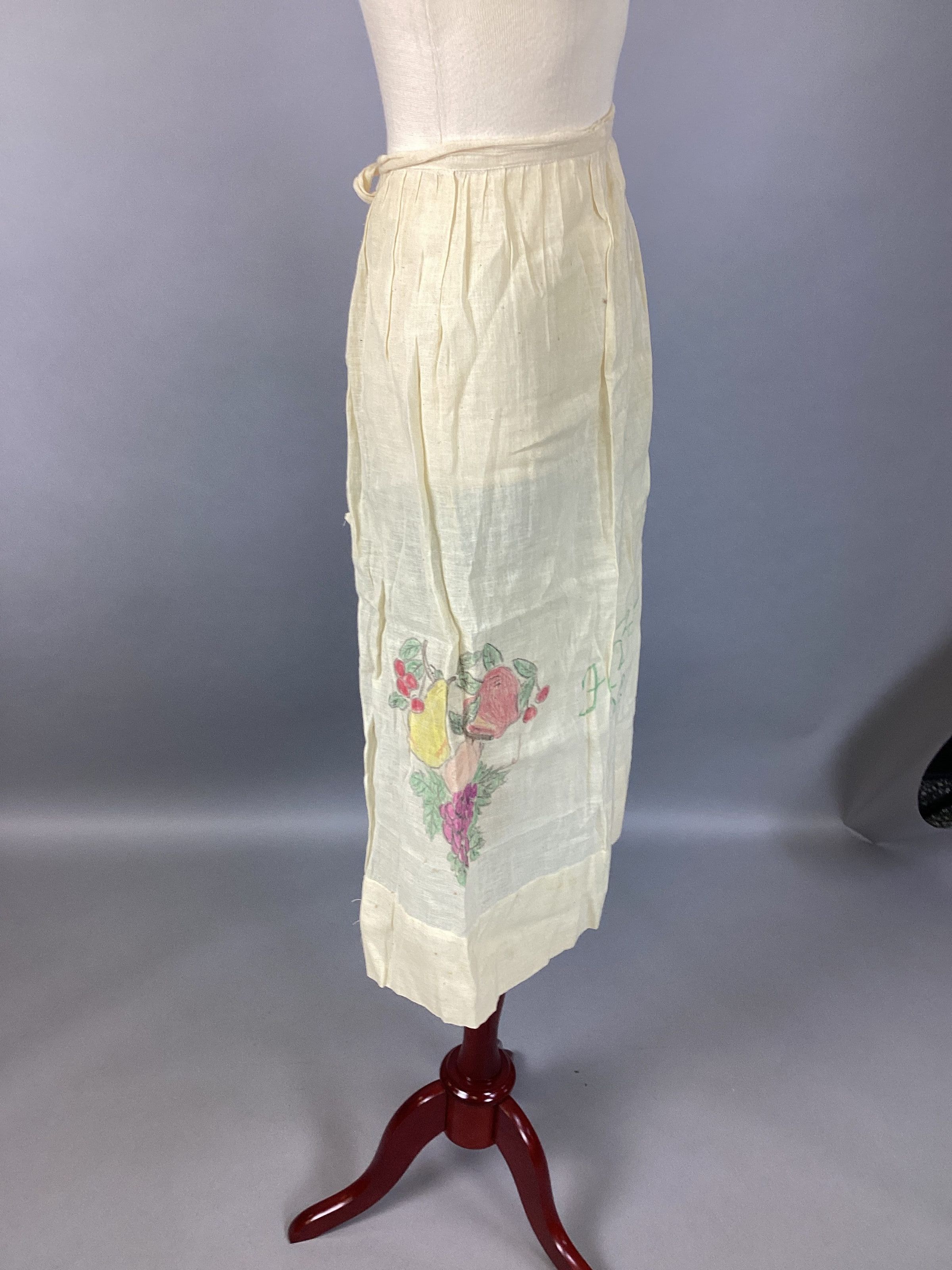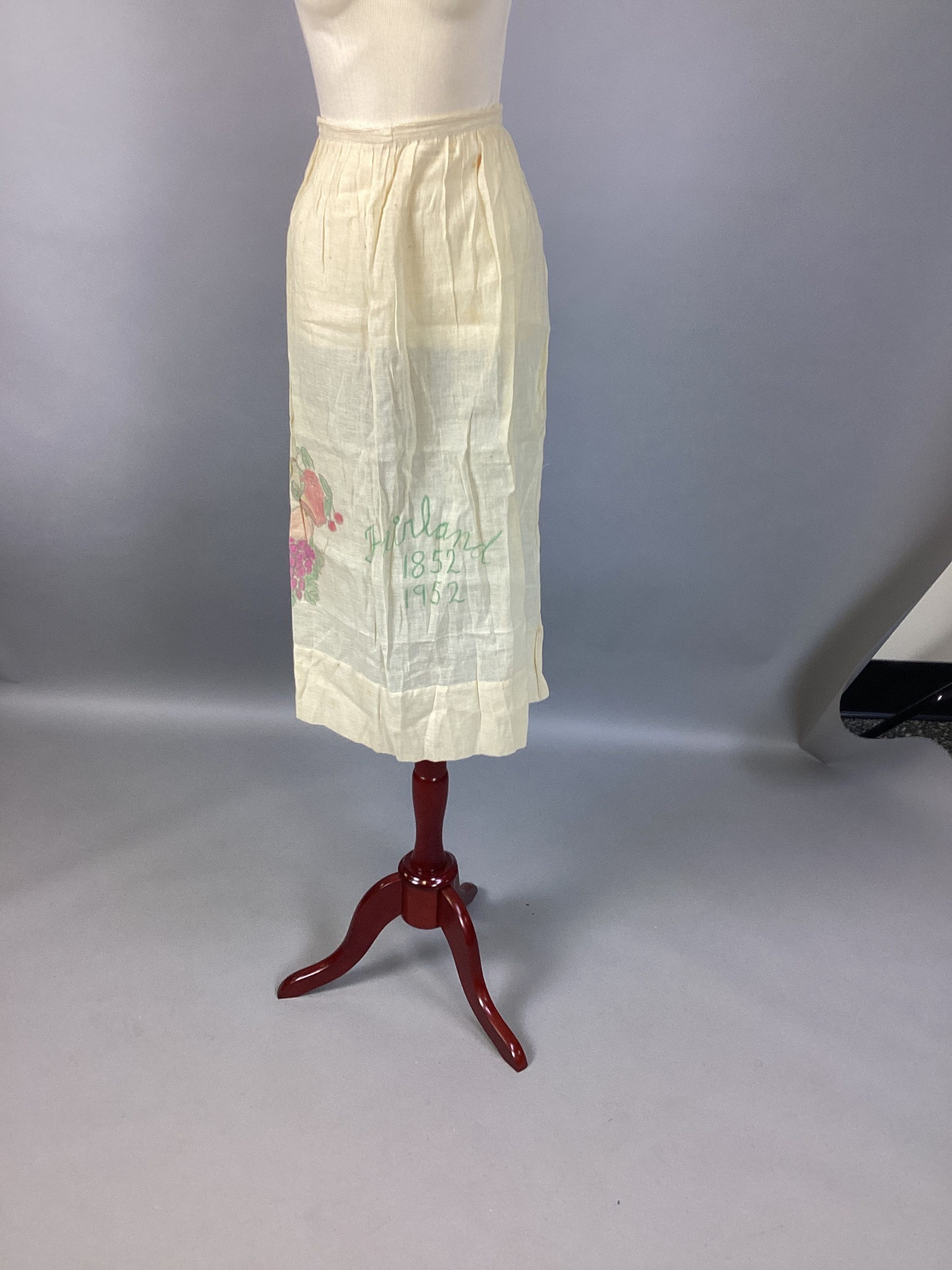 Apron is baige and made of unbleached muslin. Hand decorated with fruit on wearers lower right side. Fruit includes an apple, grapes, a pear, and cherries. To the left of the fruit hand written in green "Fairland 1852 1952."Use