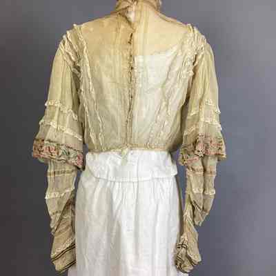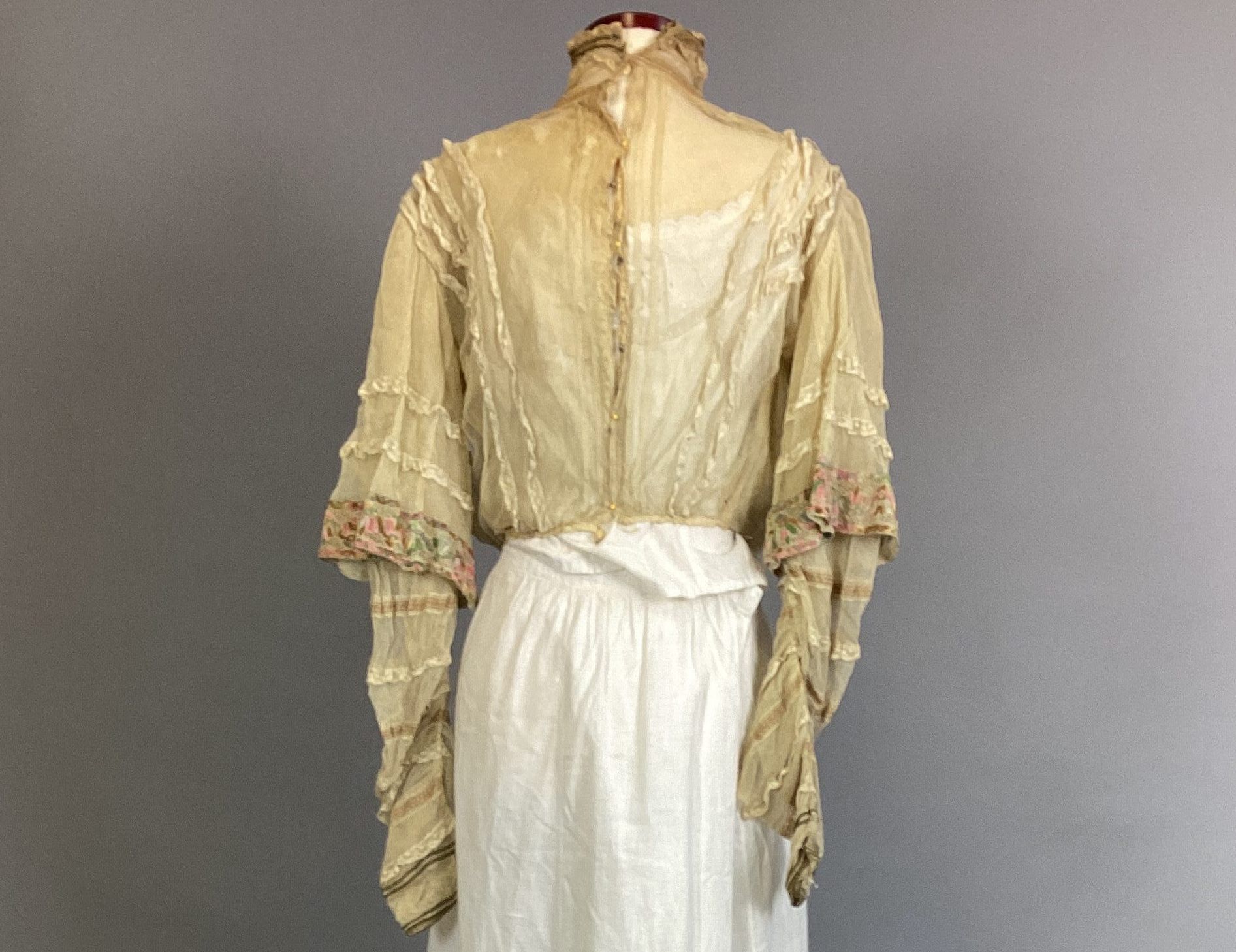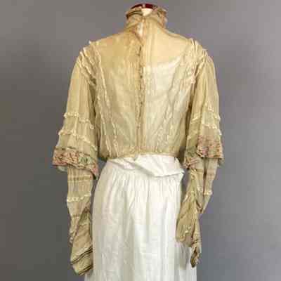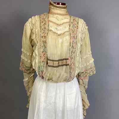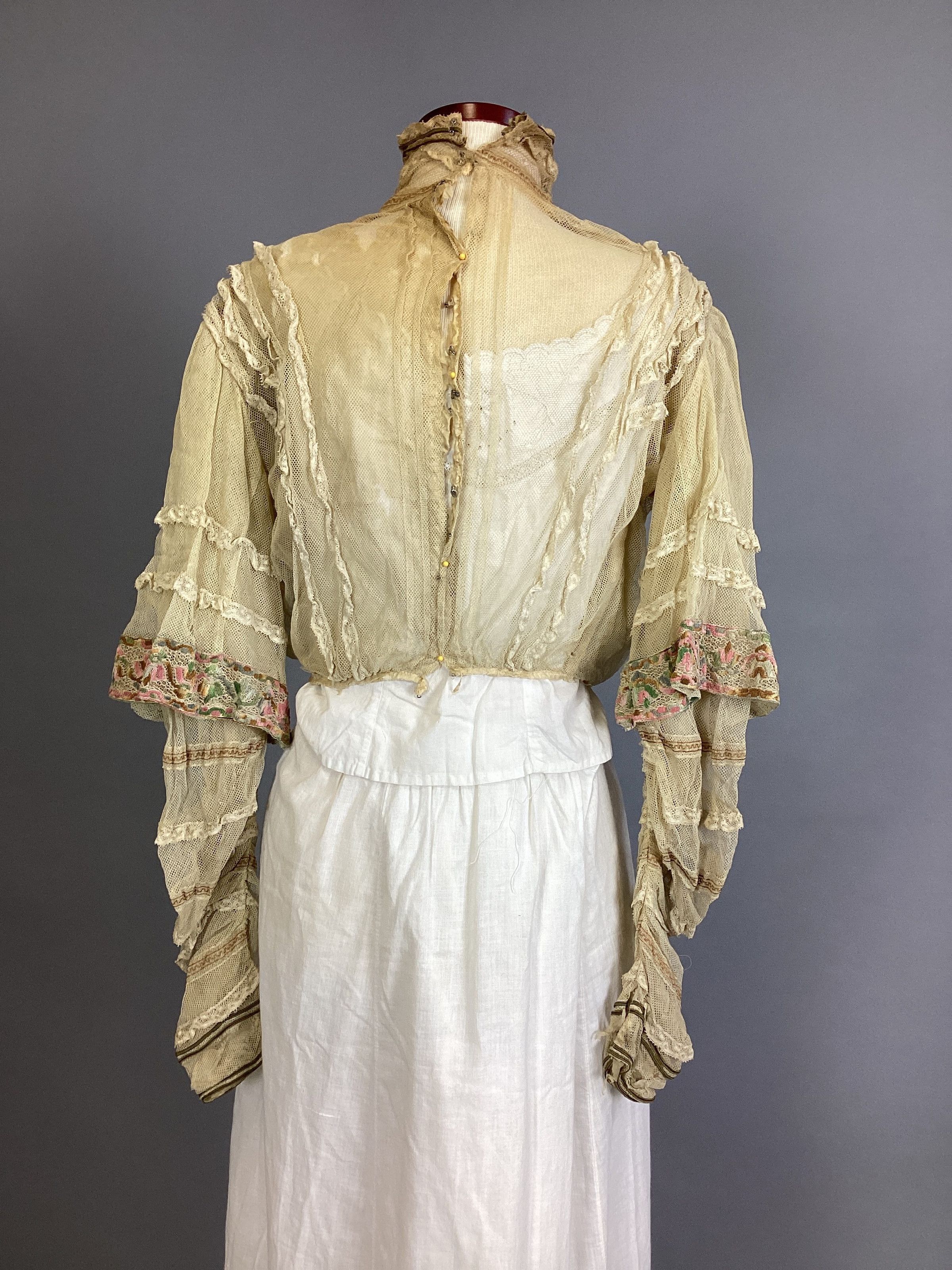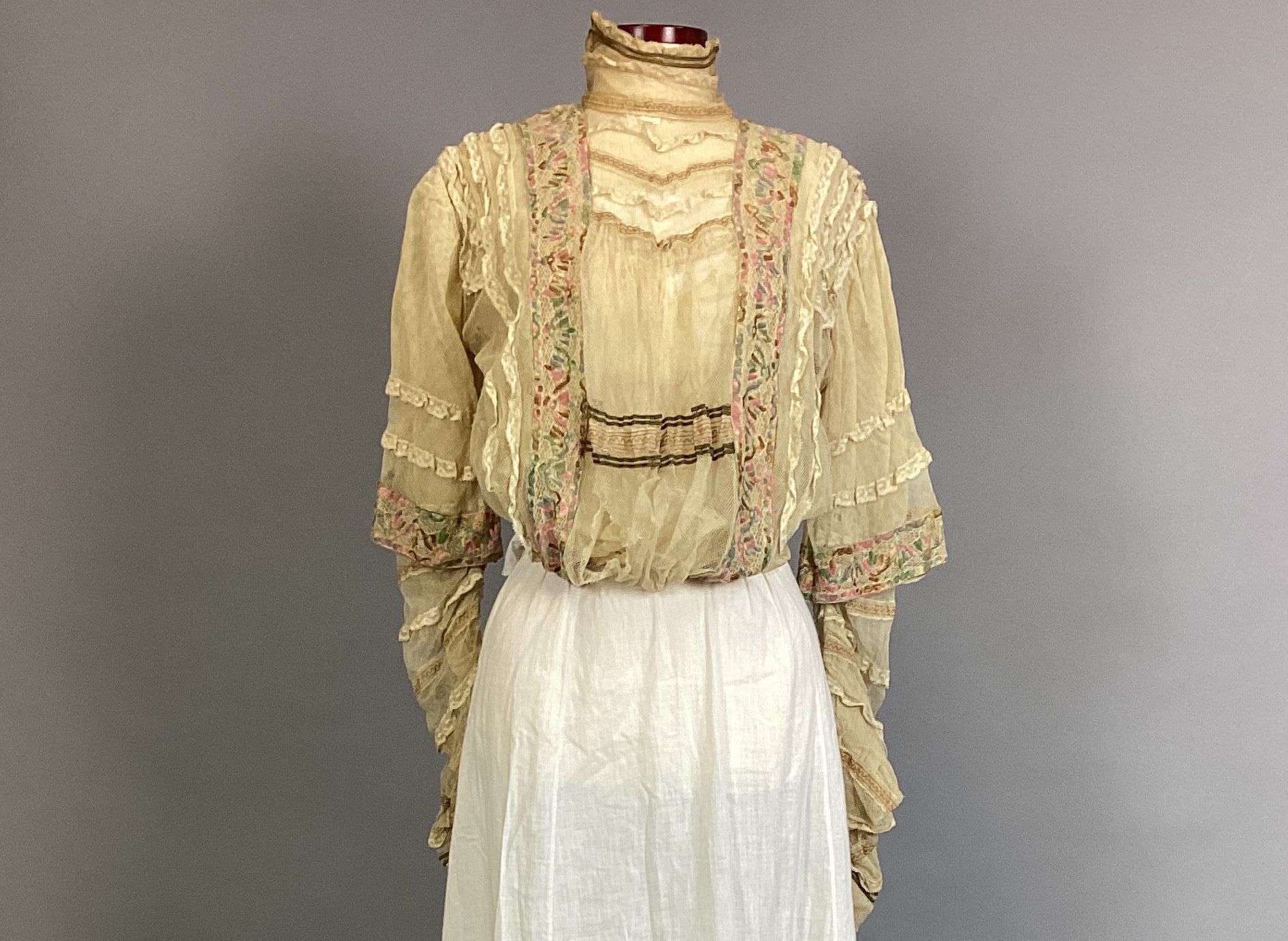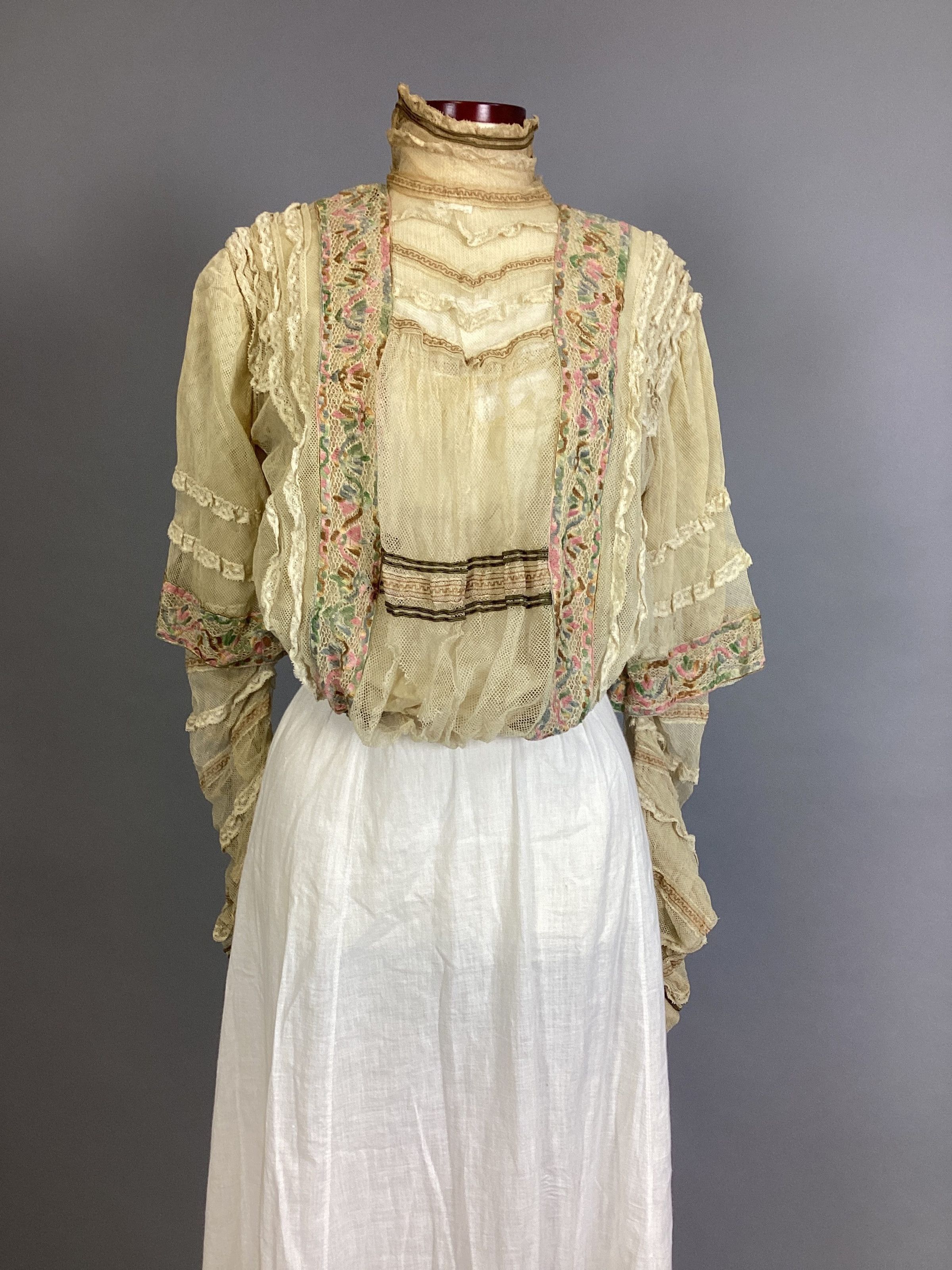 Blouse of beige net trimmed with beige lace and braid in green and rose embroidery; high neck edged with brown cord.Collection