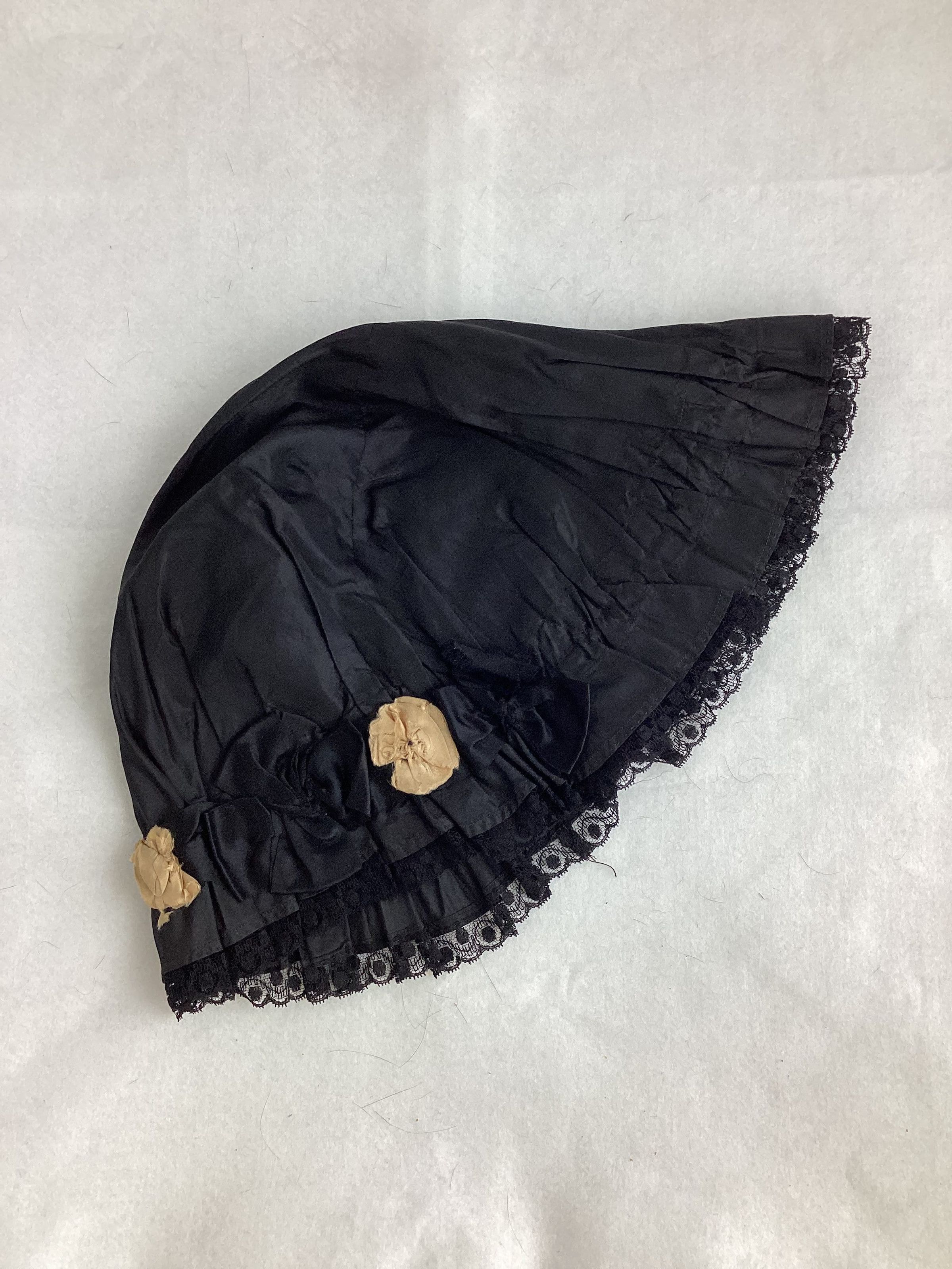 Black circle cap with lace around edge. Black ribbon bow and two gold flower type bows in front. A draw string in casing draws cap up to fit.Collection