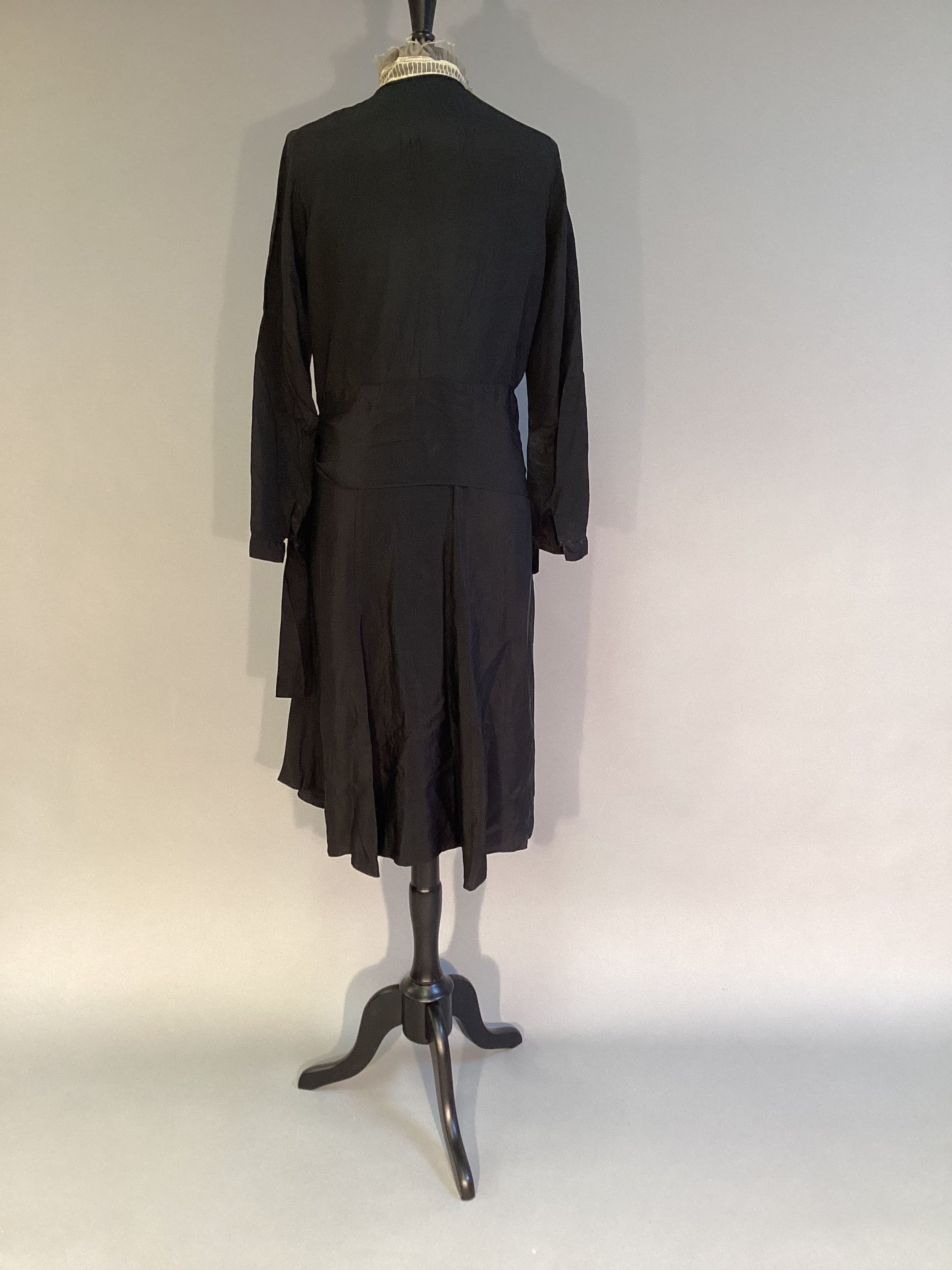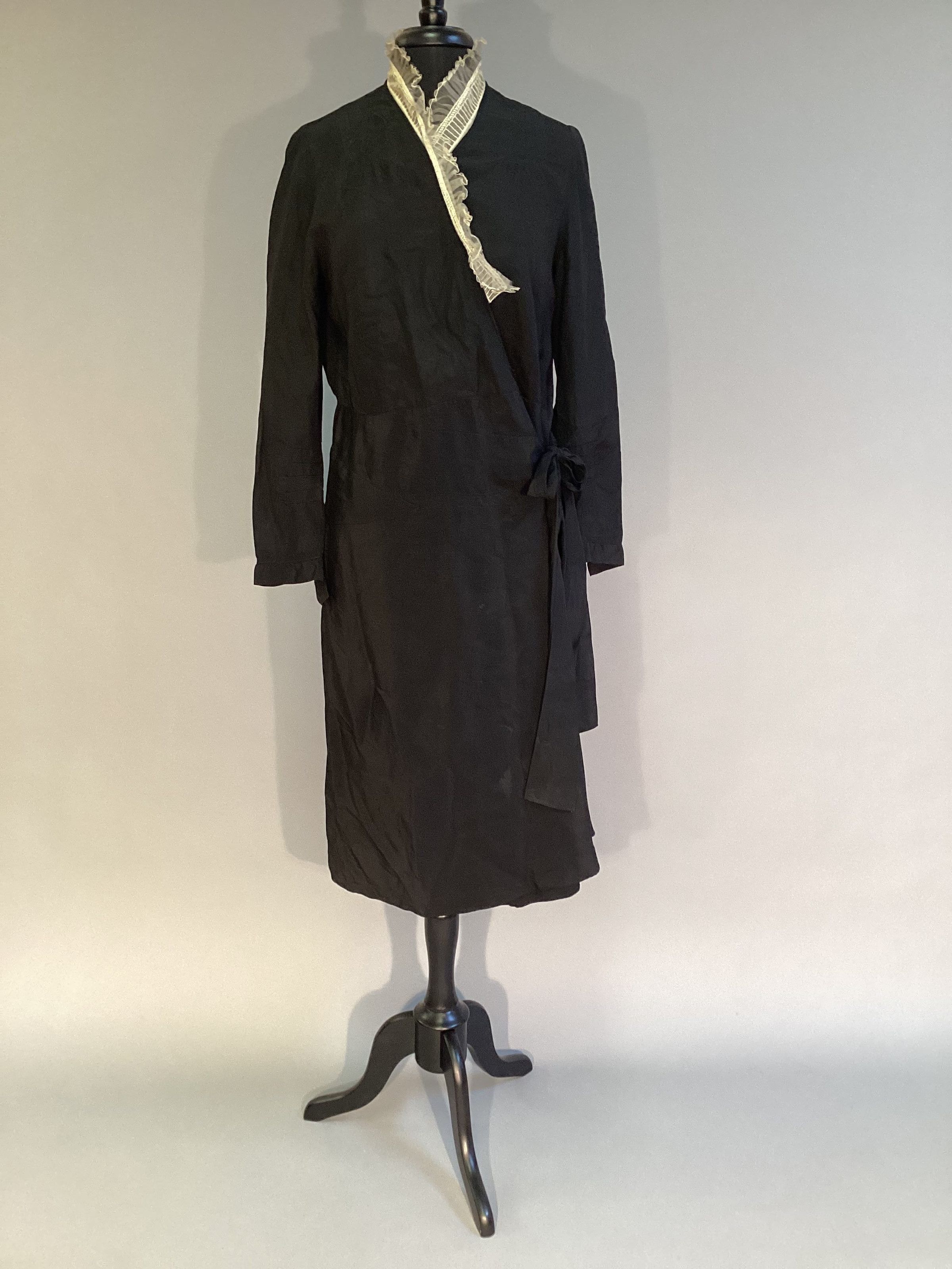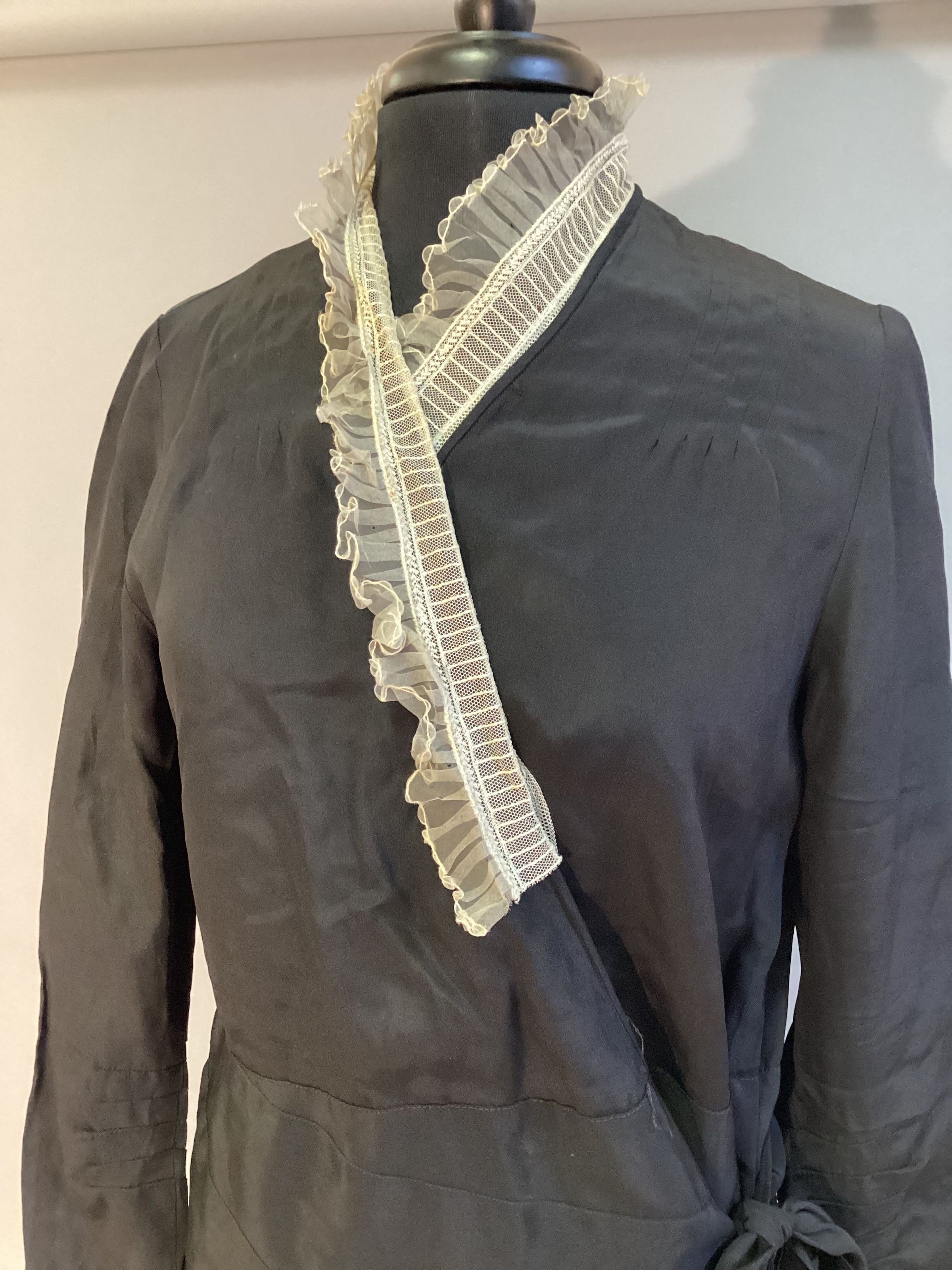 Dress, black crepe, v-neck w/ lace-wrap bodice. Side opening w/ 4 snaps. 5 pleats on left side of skirt w/ a sash to tie. Long sleeves w/ small cuffs that snap & a loop bow. White lining across shoulders. 5 tucks at front shoulder seam.Collection