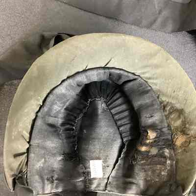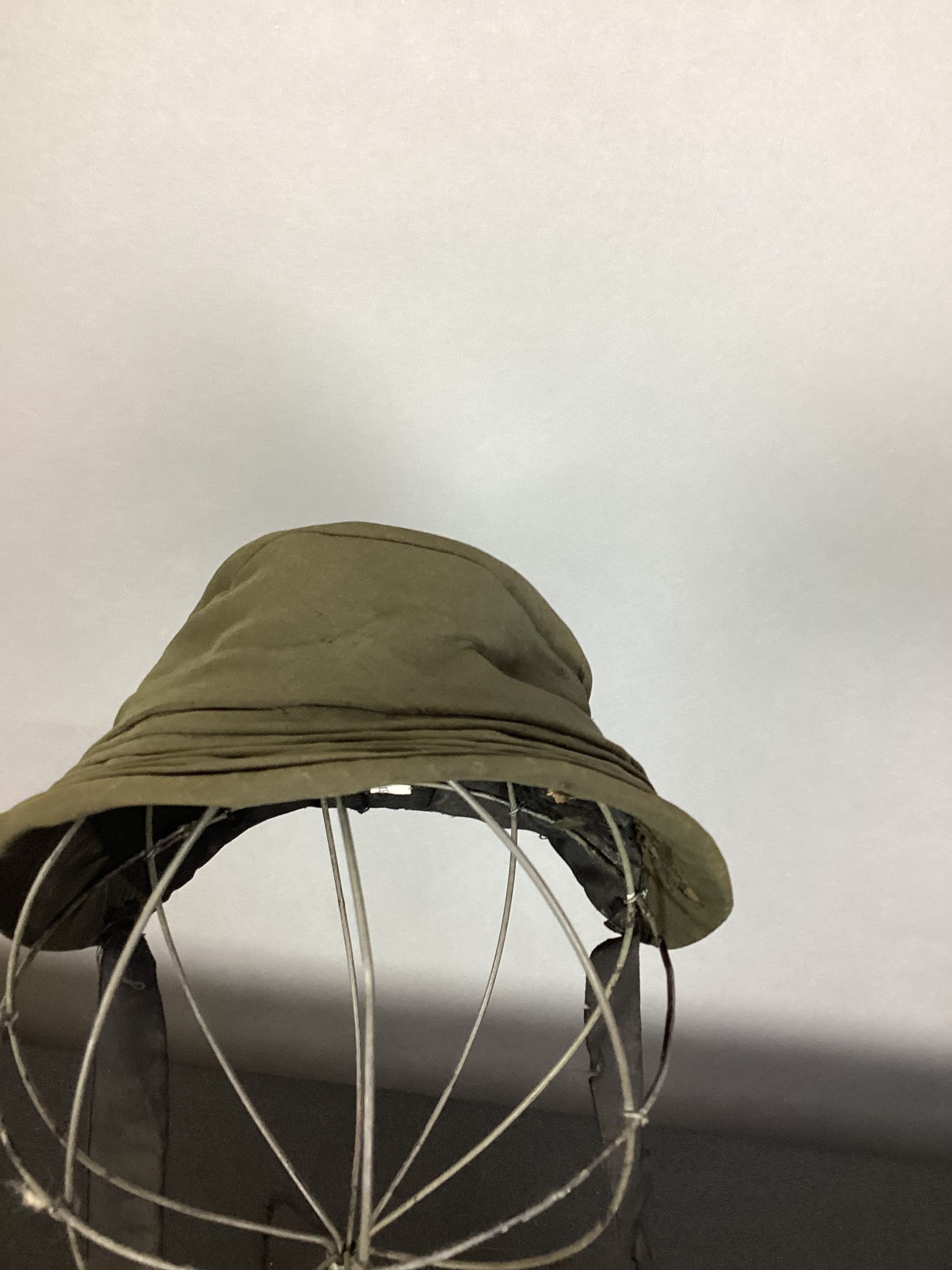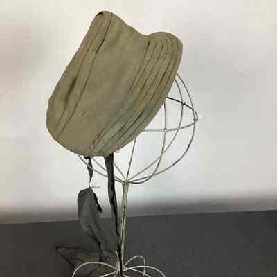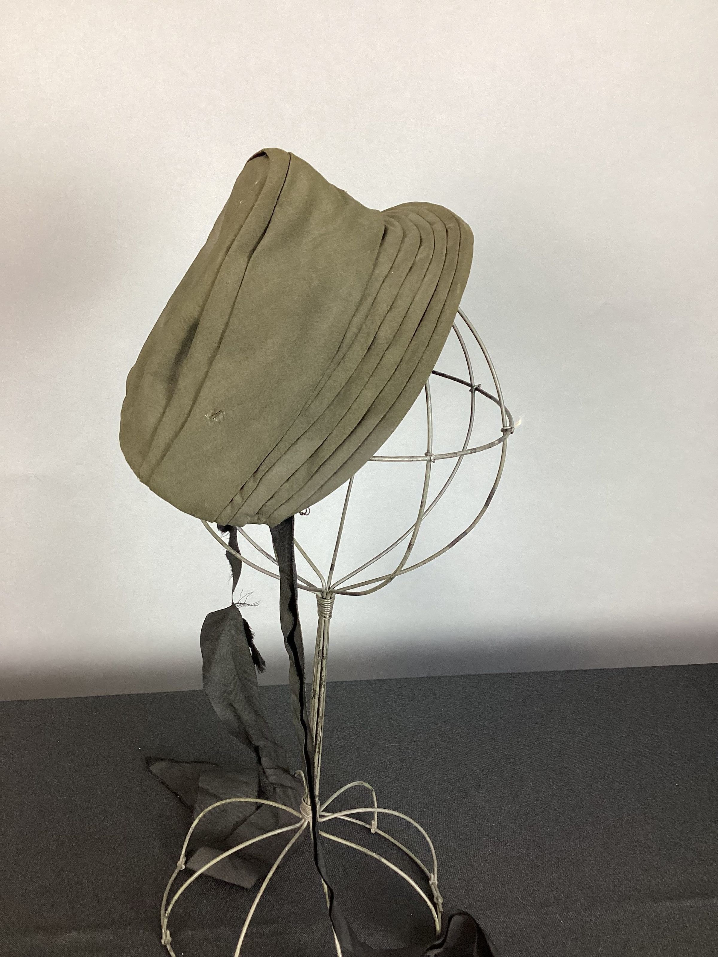 Woman's hat; black faille; small bonnet shape; folds of material on edge of brim; black grosgrain ribbonUse
