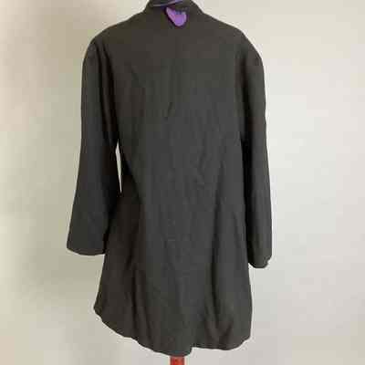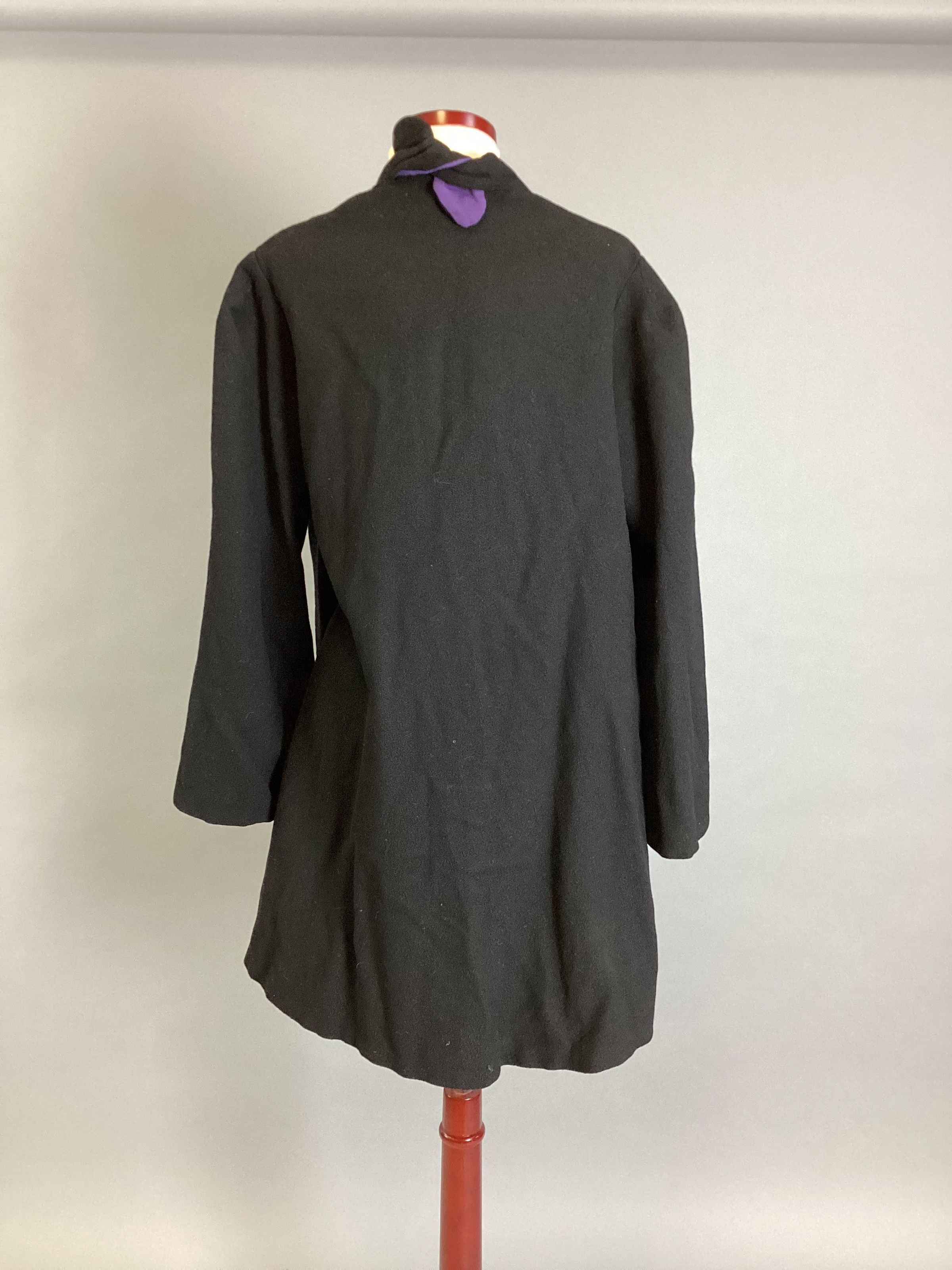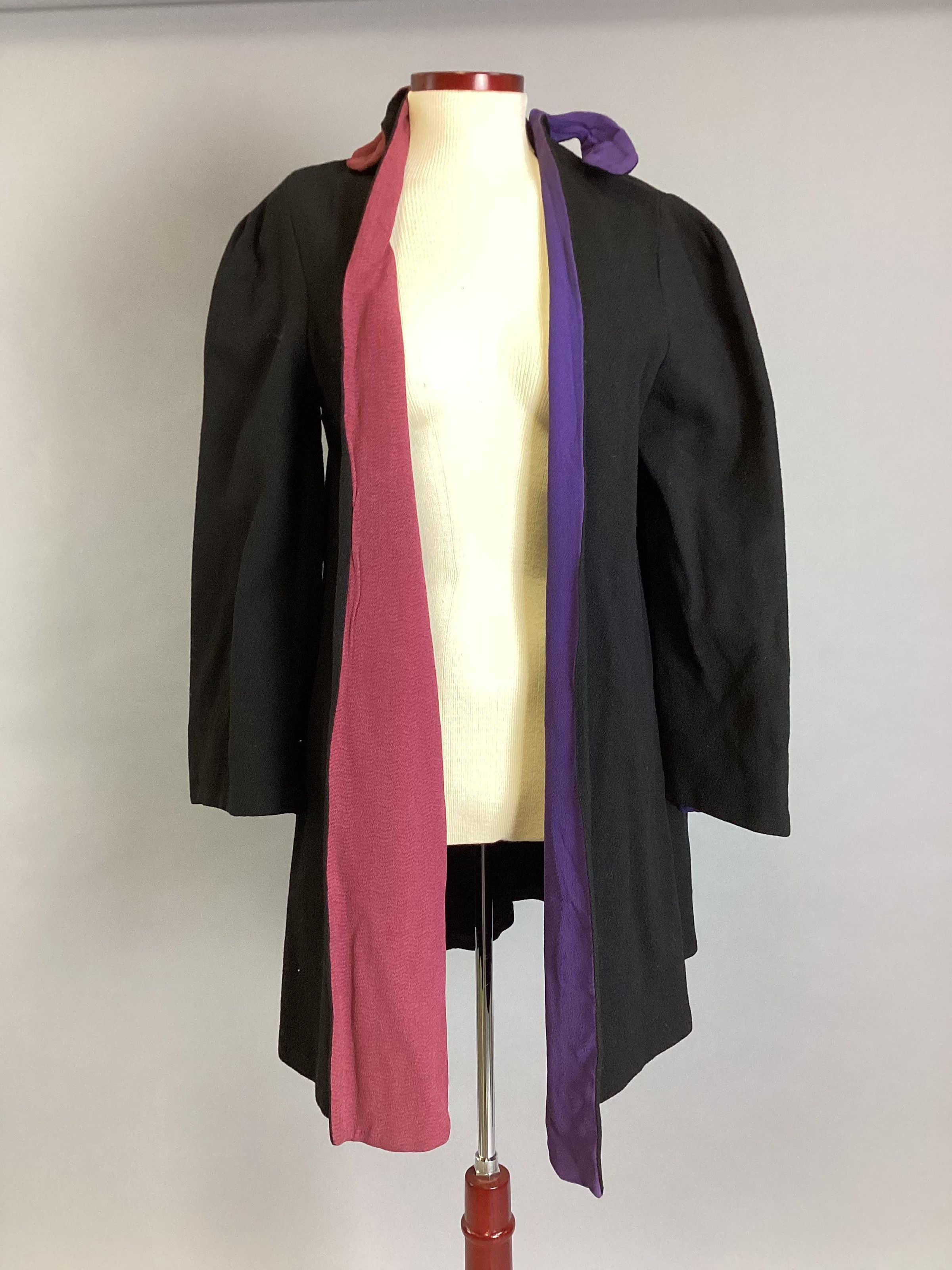 Black jacket, cuffs are lined w/ purple, fronts lined w/ rose color on one side, purple on the other, with 5" tabs at neckline. No buttons. Size small.Collection