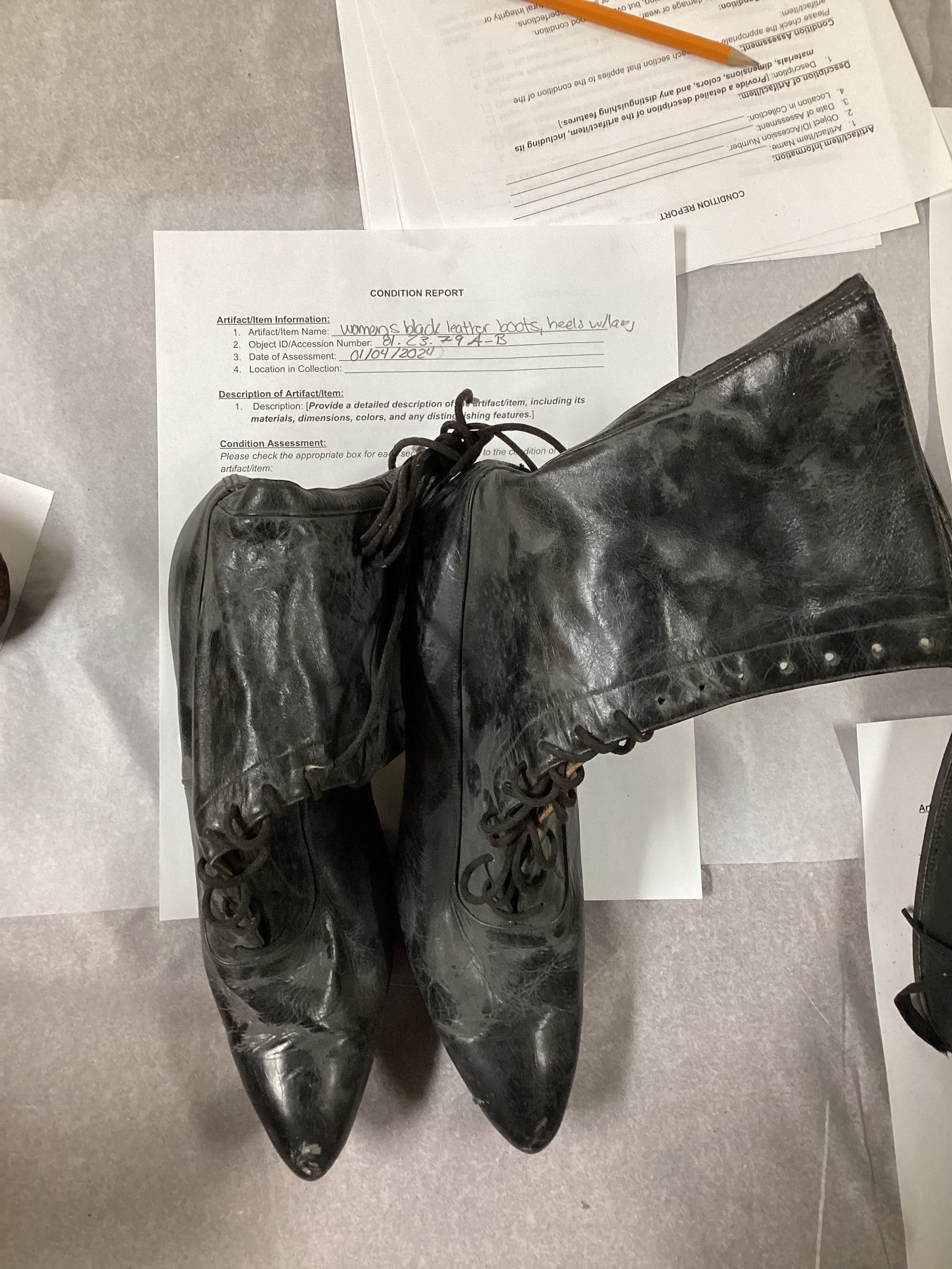 A pair of women's black leather Balmoral boots. These late Edwardian walking boots are high-laced with black silk cord, pointed toes, and Cuban heels.Collection