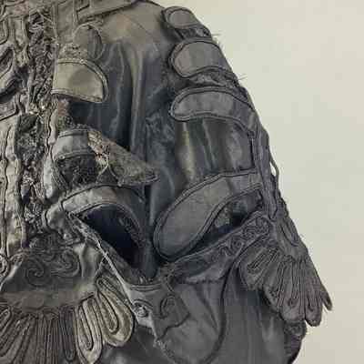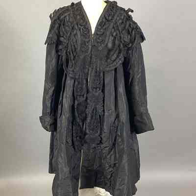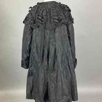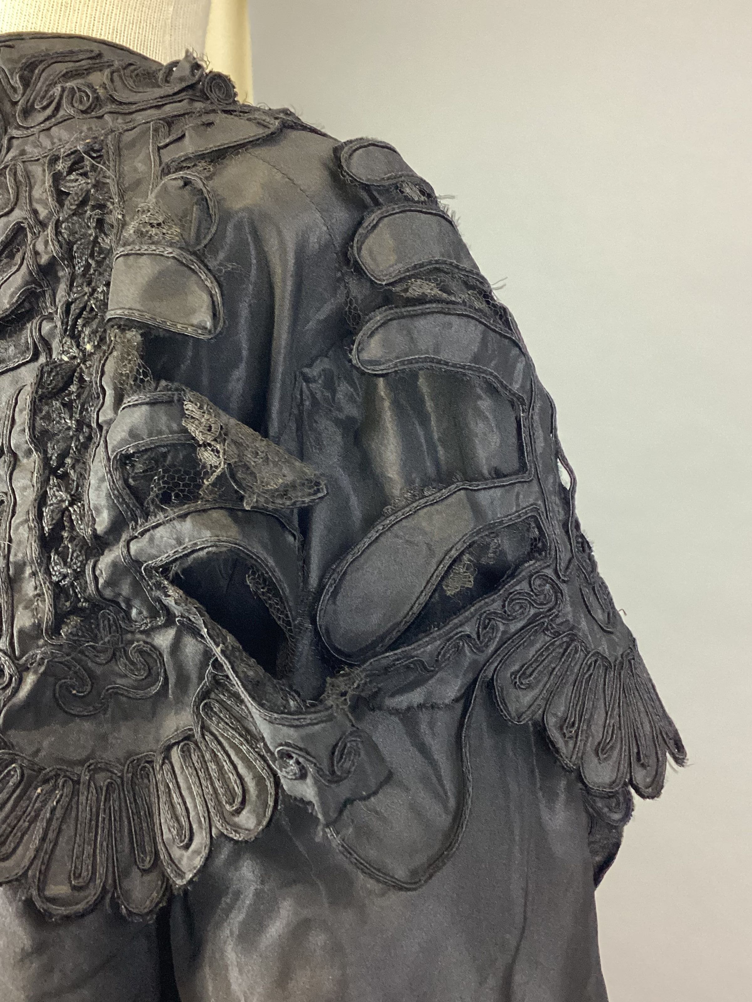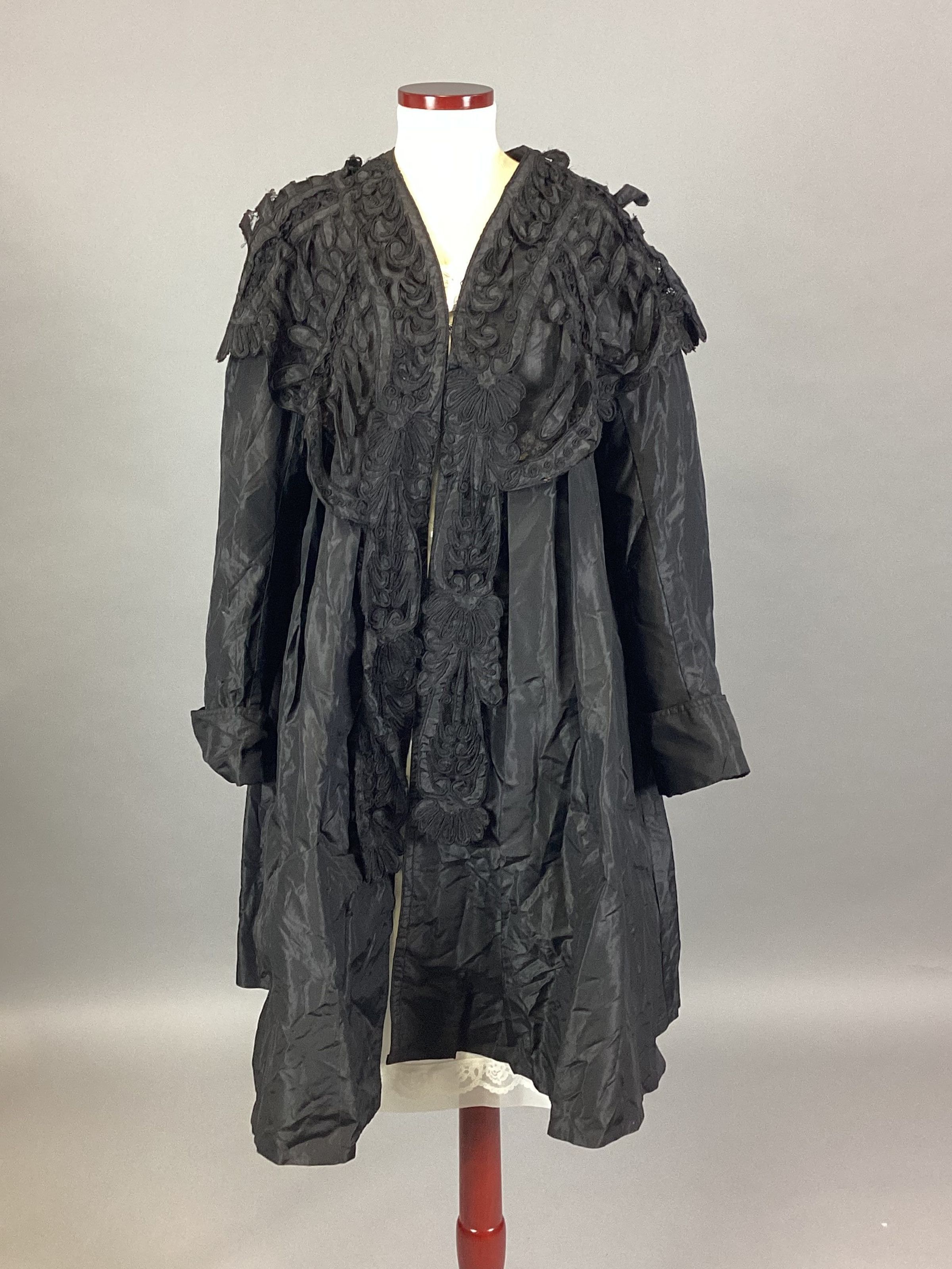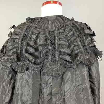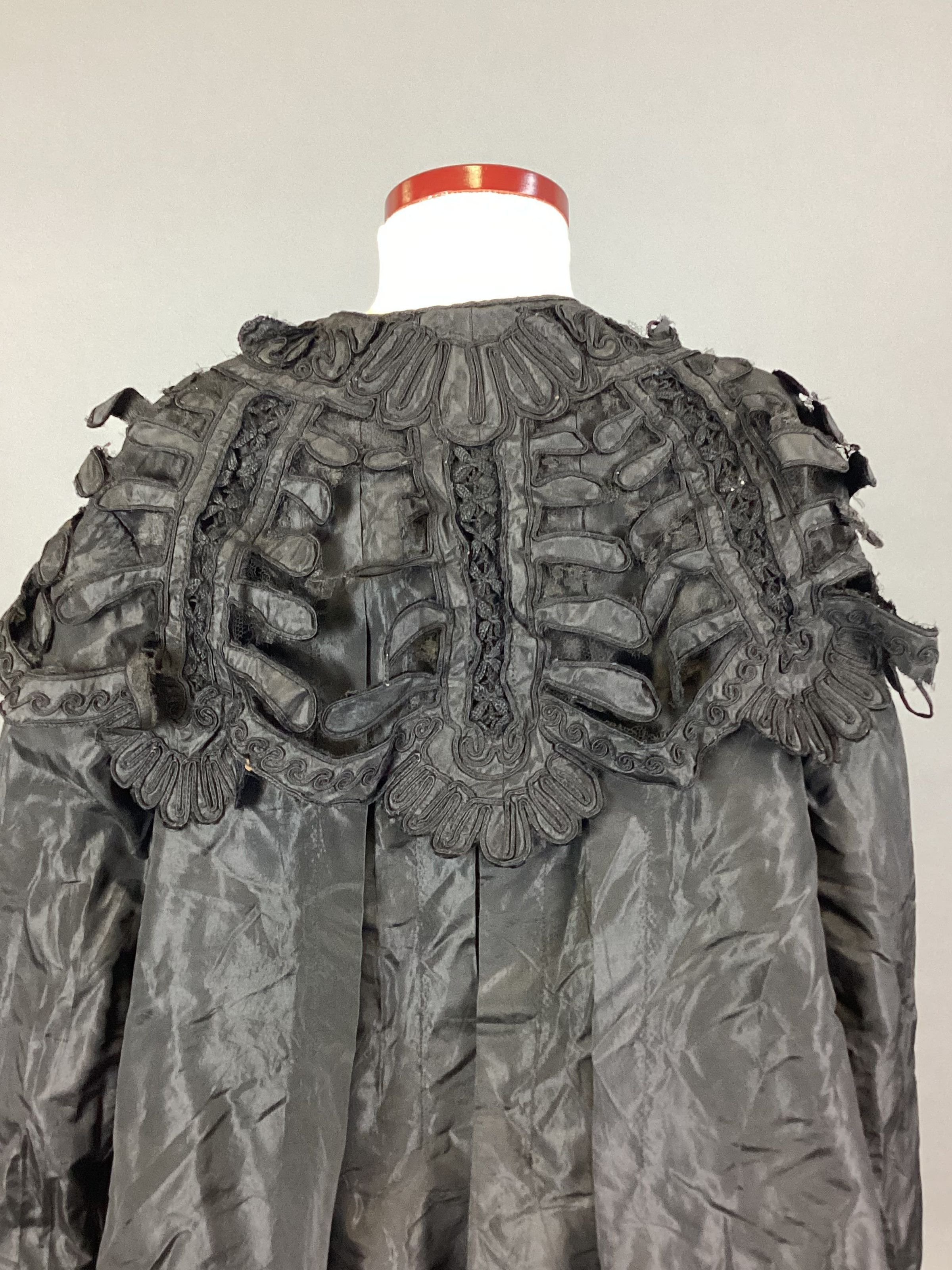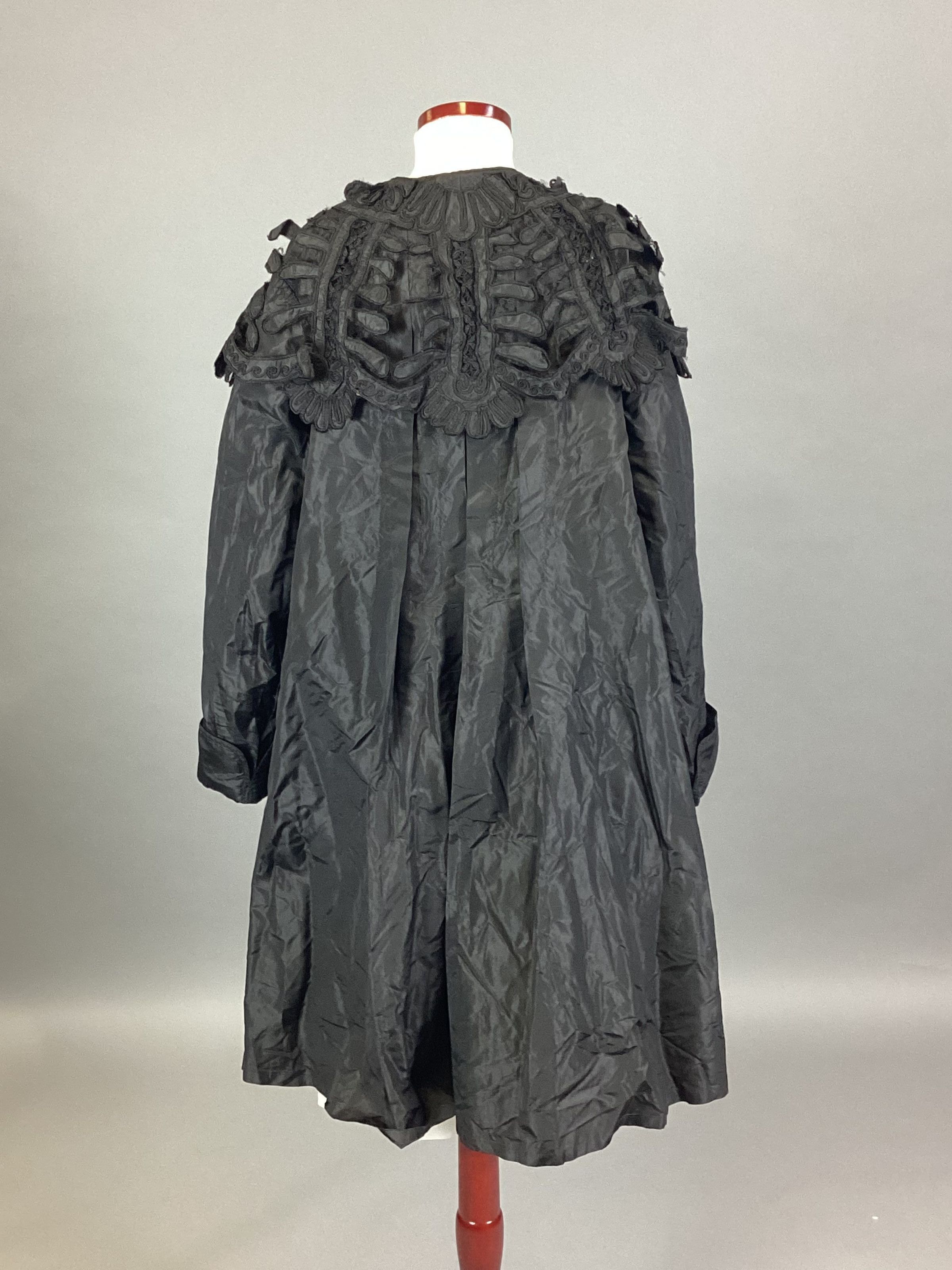 Cloak with inverted pleat down back, 1 pleat on each side of inverted pleat, lined yoke. Lace, braid, and taffeta decorative shawl type collar with extended decoration down the front. Set on sleeves have 4" turn up cuff. Two inverted pleats on each front side. Fastened with 3 hook and eyes on the front yoke.Collection