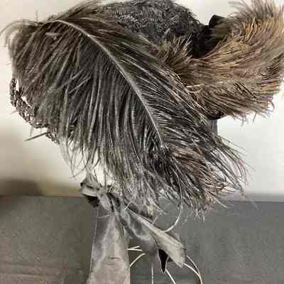 Women's Black Net Velvet Hat w/ Jet Beads, Feathers, & Taffeta TiesDescription