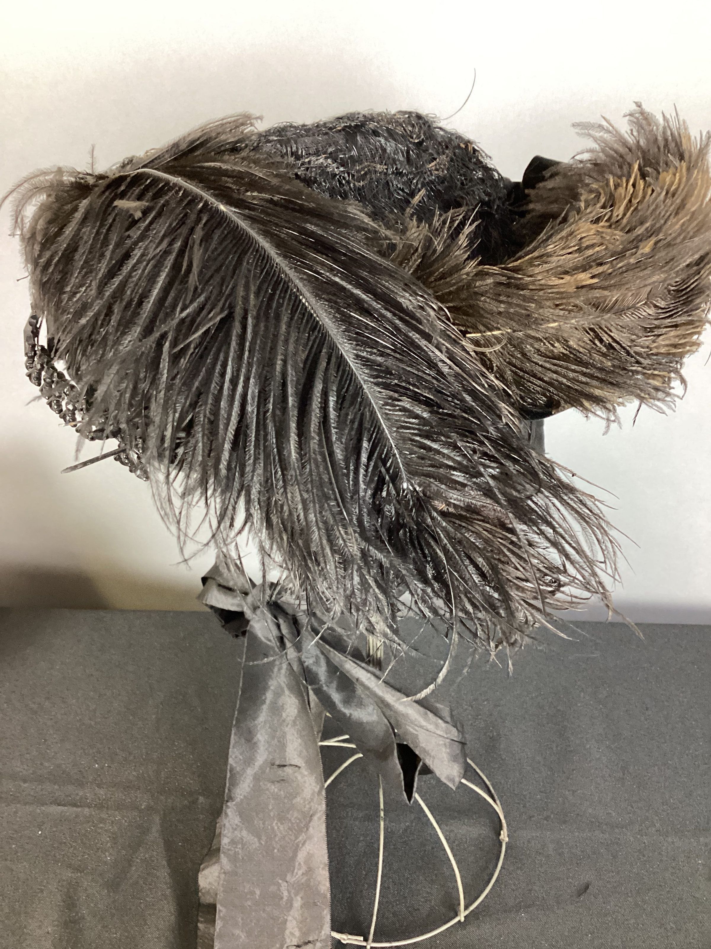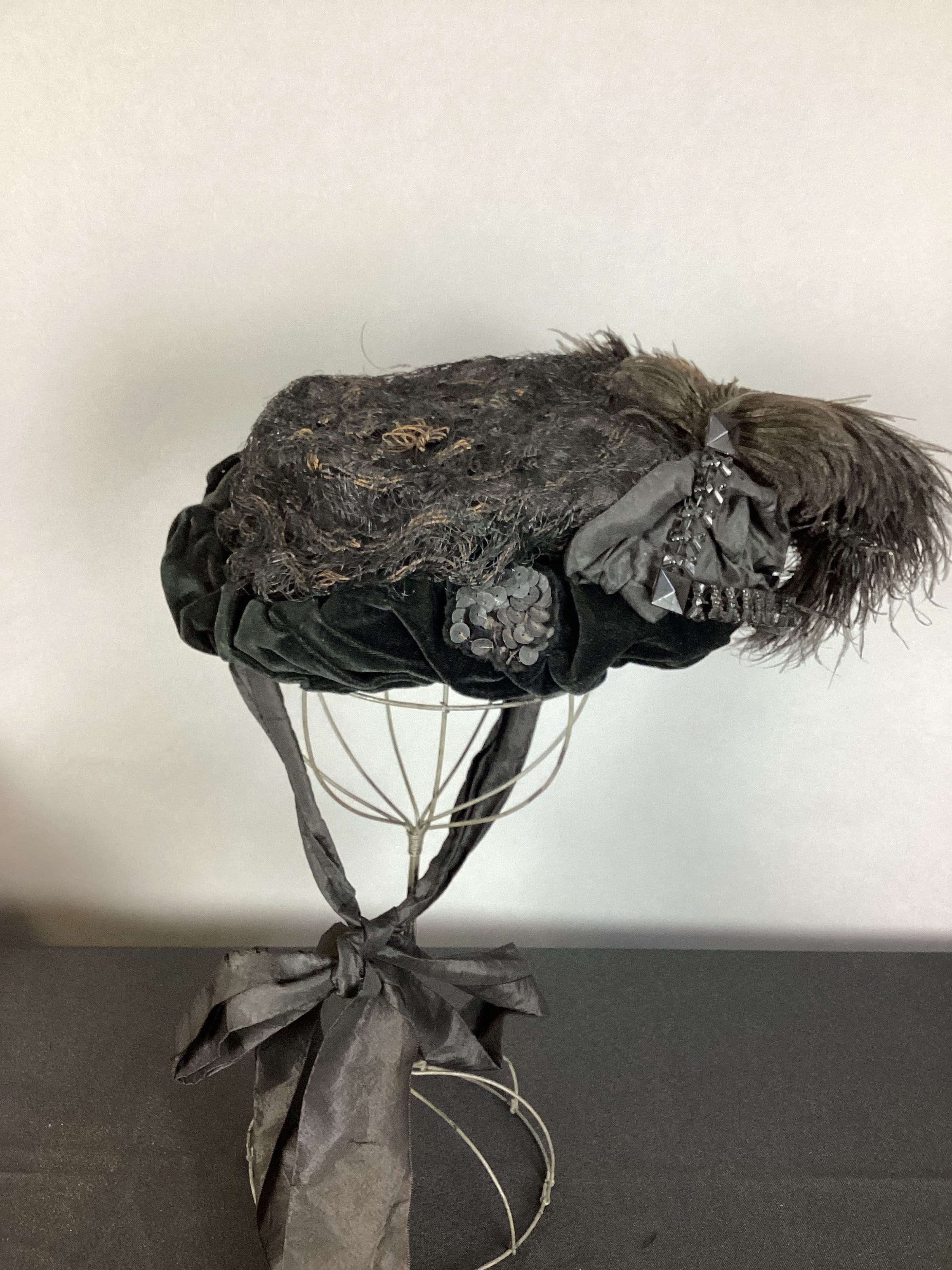 Black net and velvet hat; trimmed with jet beads and fethers; wide black taffeta ties; 2 hat pinsCollection
