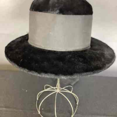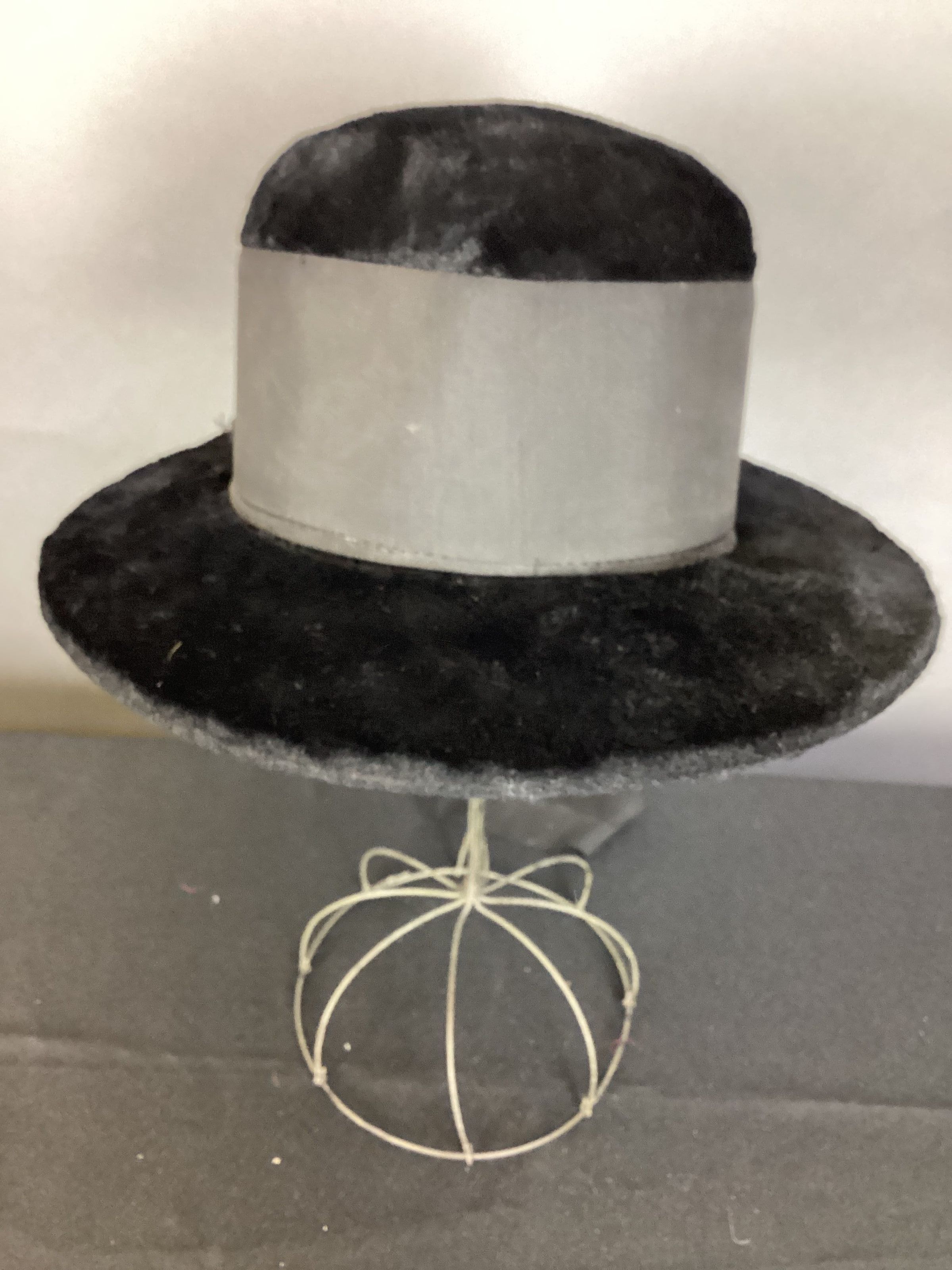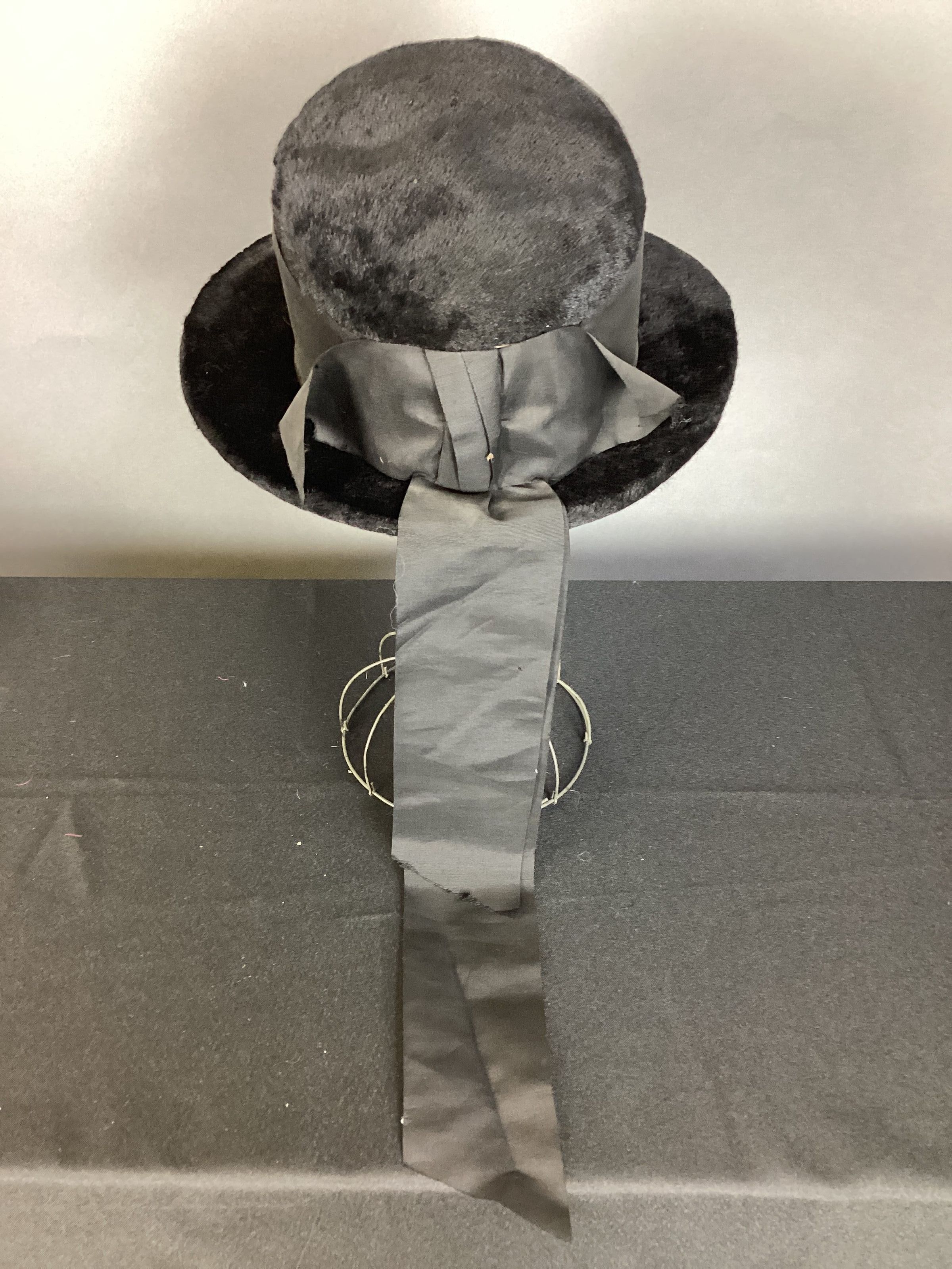 black plush hat; stiff brim is 2 3/4" in front a 1" in back; has 4 1/2" high crown; hat band is 3" black grosgrain ribbon; streamers in back of 11" and 12" . lining is black cambrie.Use