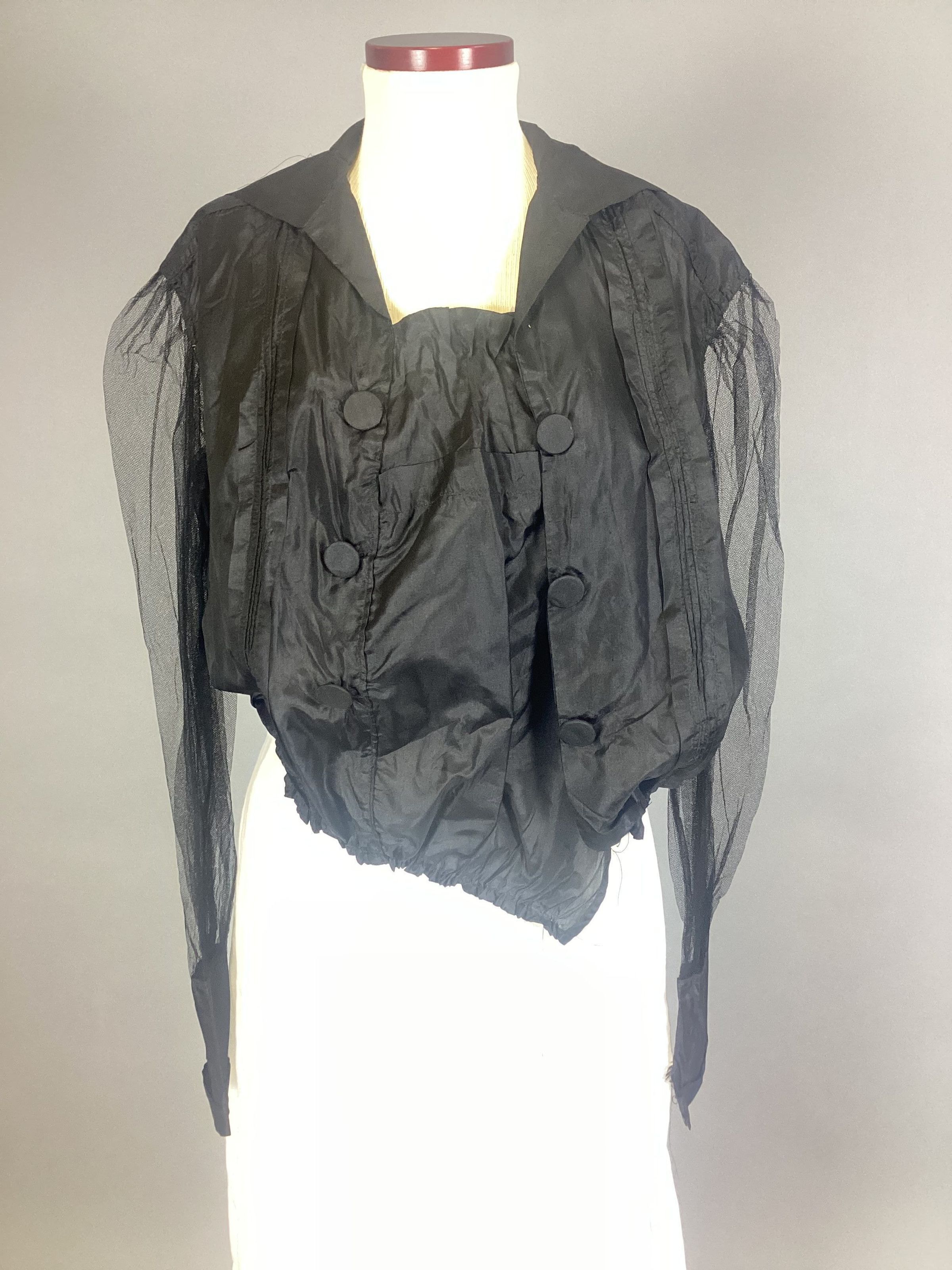 Blouse, black silk with black net sleeves, silk cuffs. A 10" gathered piece down front edge with three self-covered buttons on each side. Large square collar