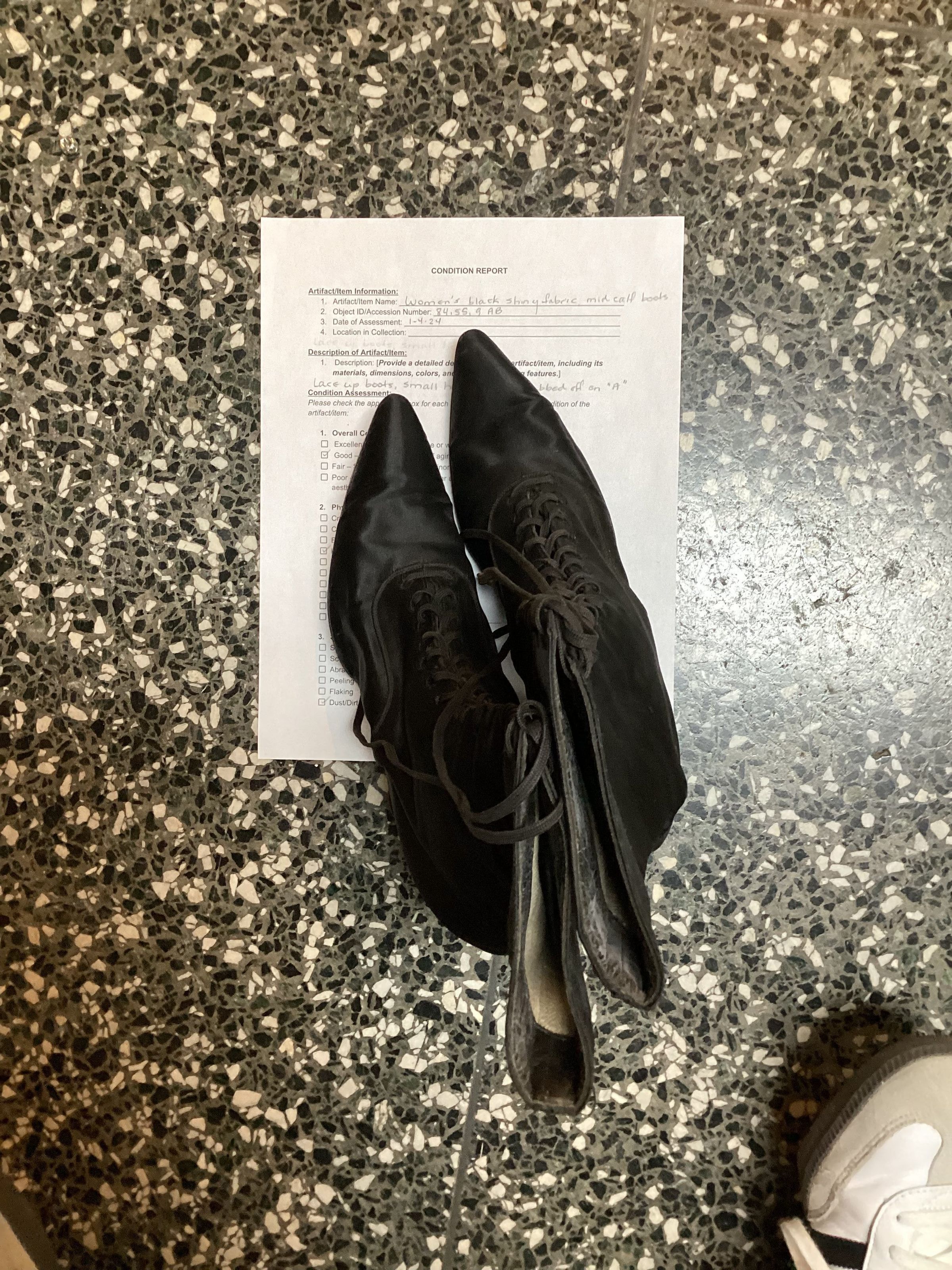 A pair of women's black silk Balmoral boots. These Victorian house boots are high-laced (8-1/2 in) with pointed toes and 2 in heels. Each shoe has 36 eyelets for lacing and uses braided ties. nside the right shoe top reads, "J.C. Hart, Indianapolis" in gold type.Collection