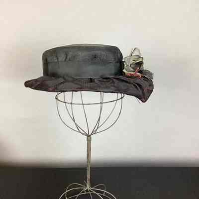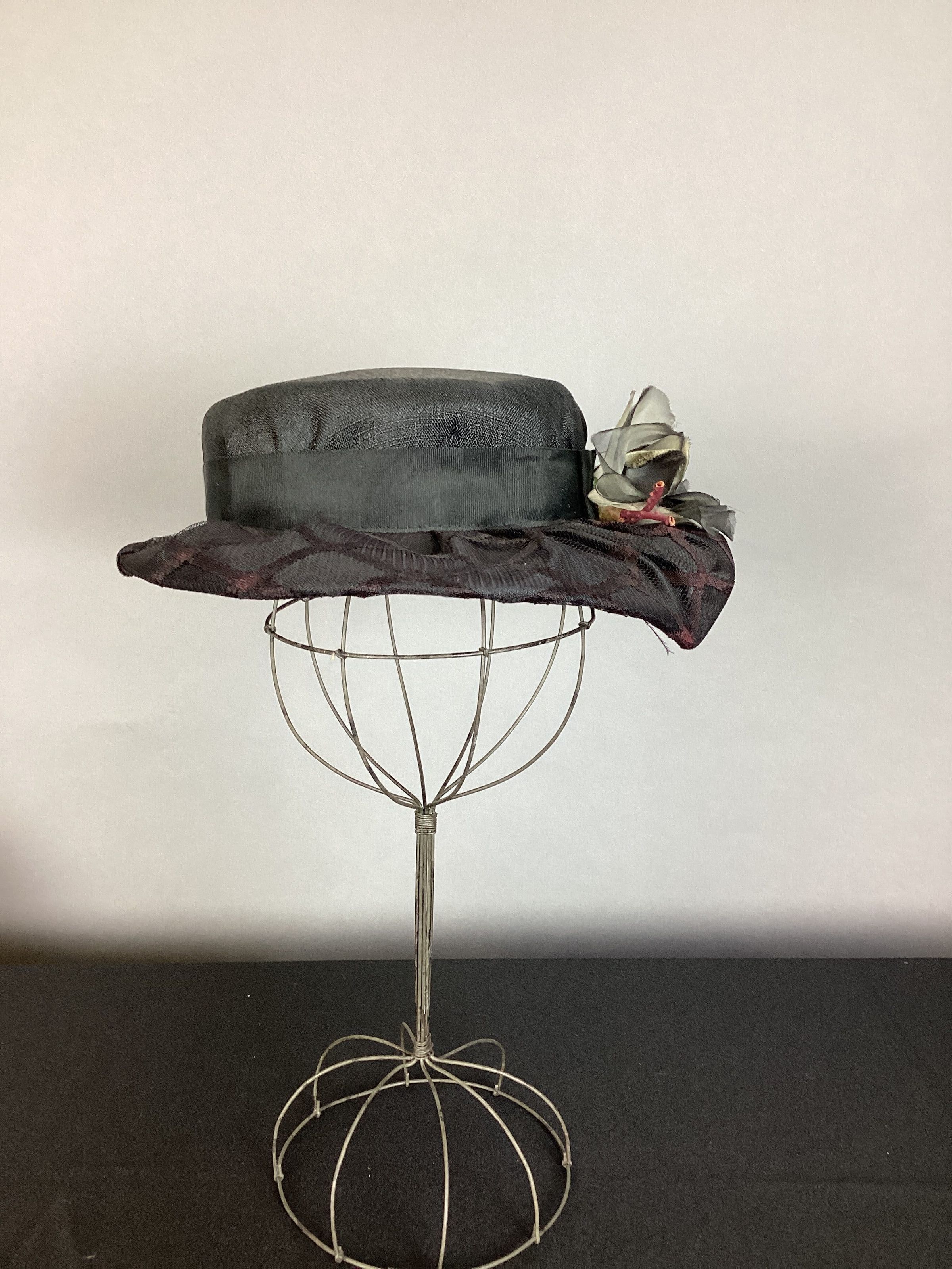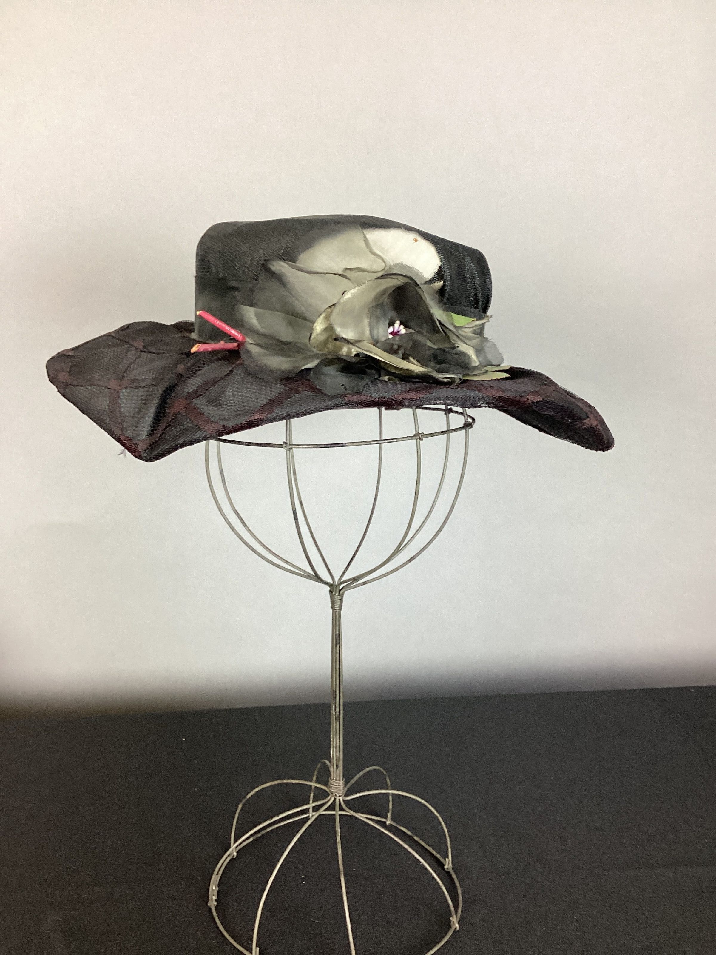 A block fine straw hat, 2 1/2" high crown with flat tip, irregular brim 1 1/2" back 2 12" front and 3 1/2" side, checked design on brim made with fine braid; 1 1/2" black grosgrain ribbon around crown with silk flower in front, flower is shades of gray with green leaf and red stem and clump of white stamen in center of flower.Use
