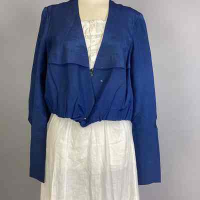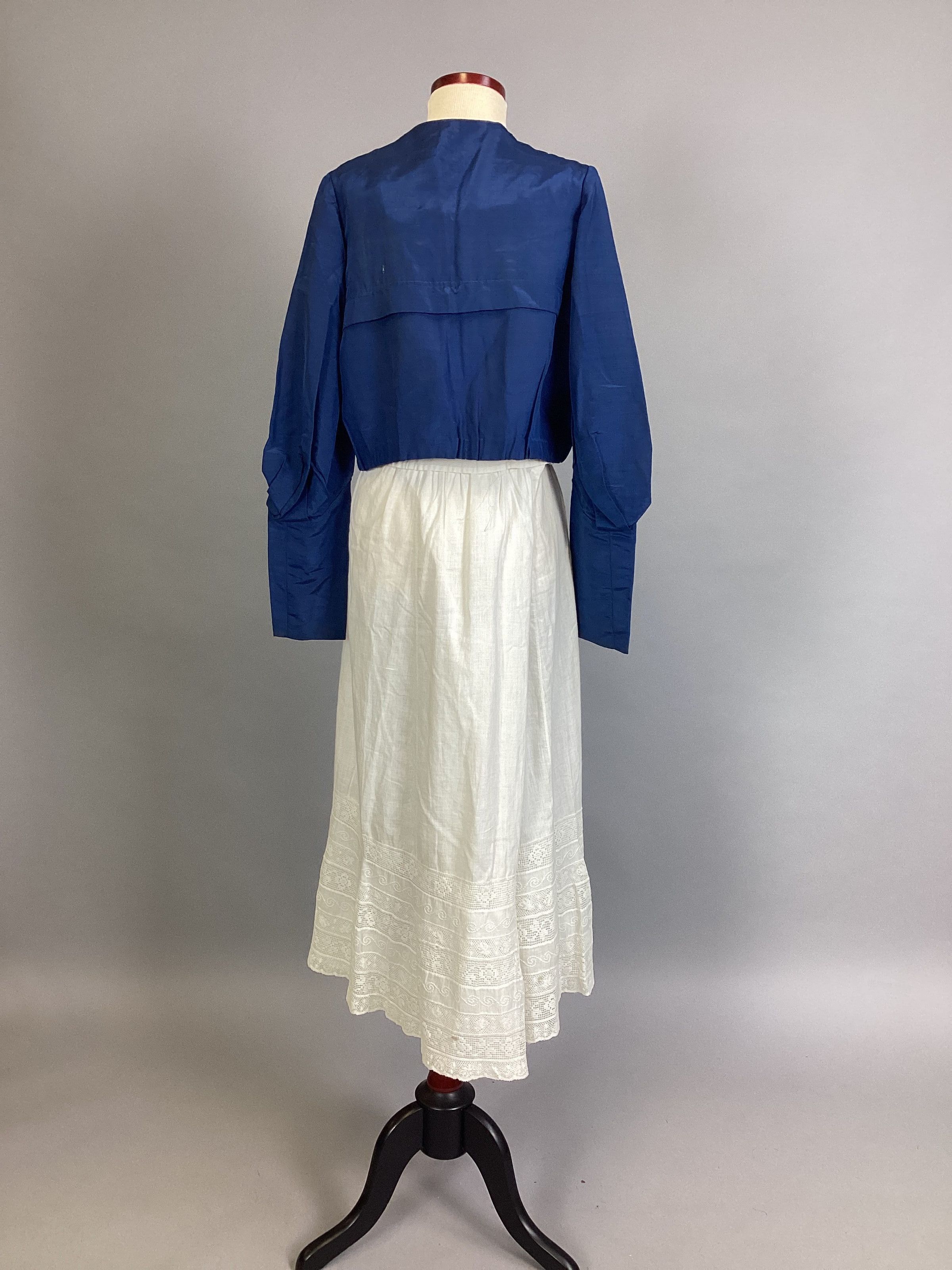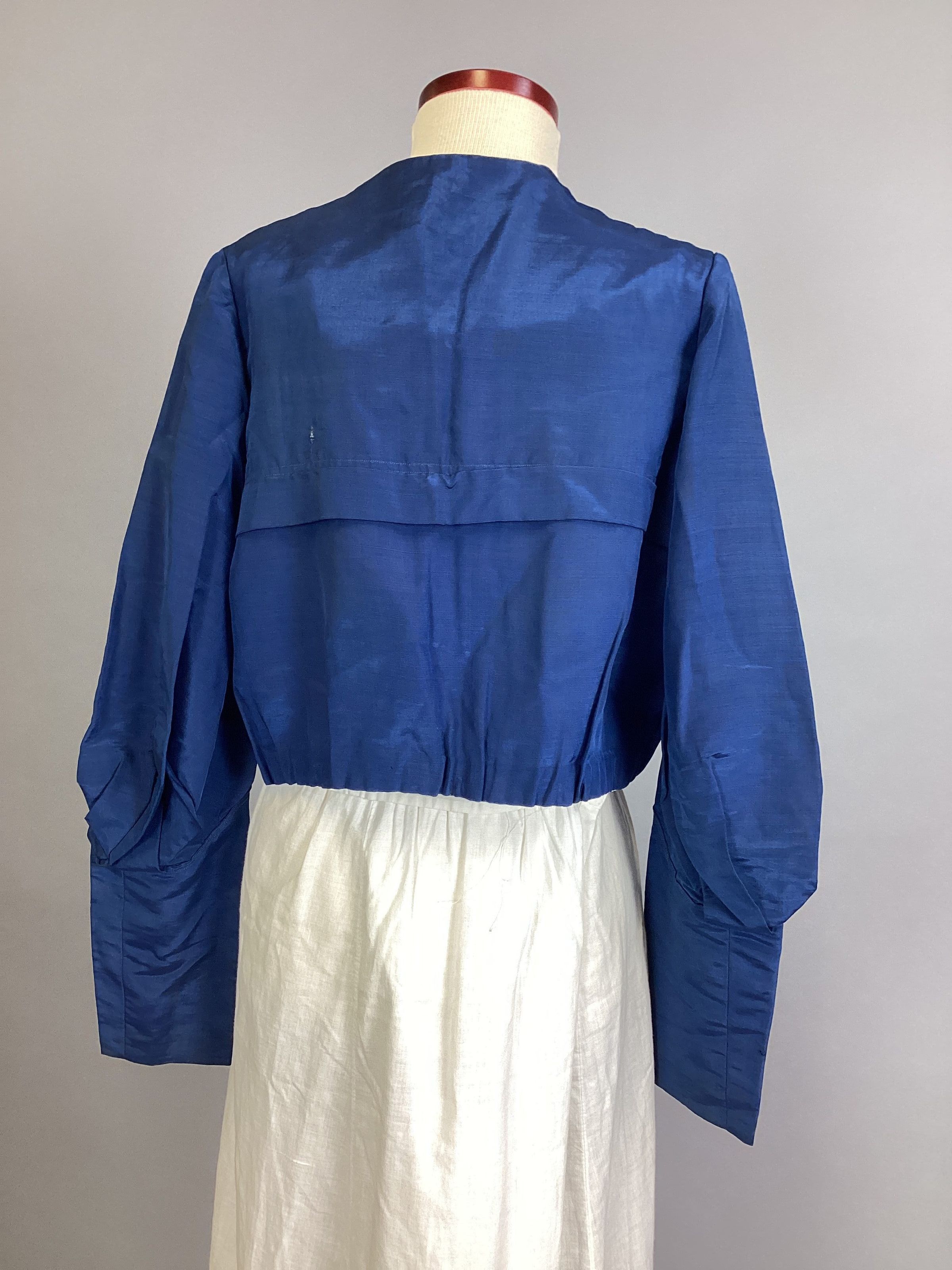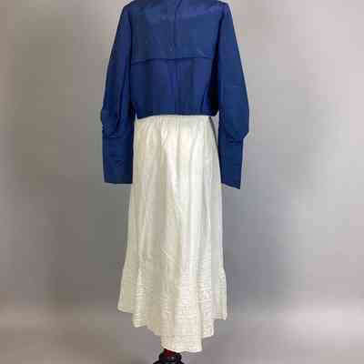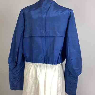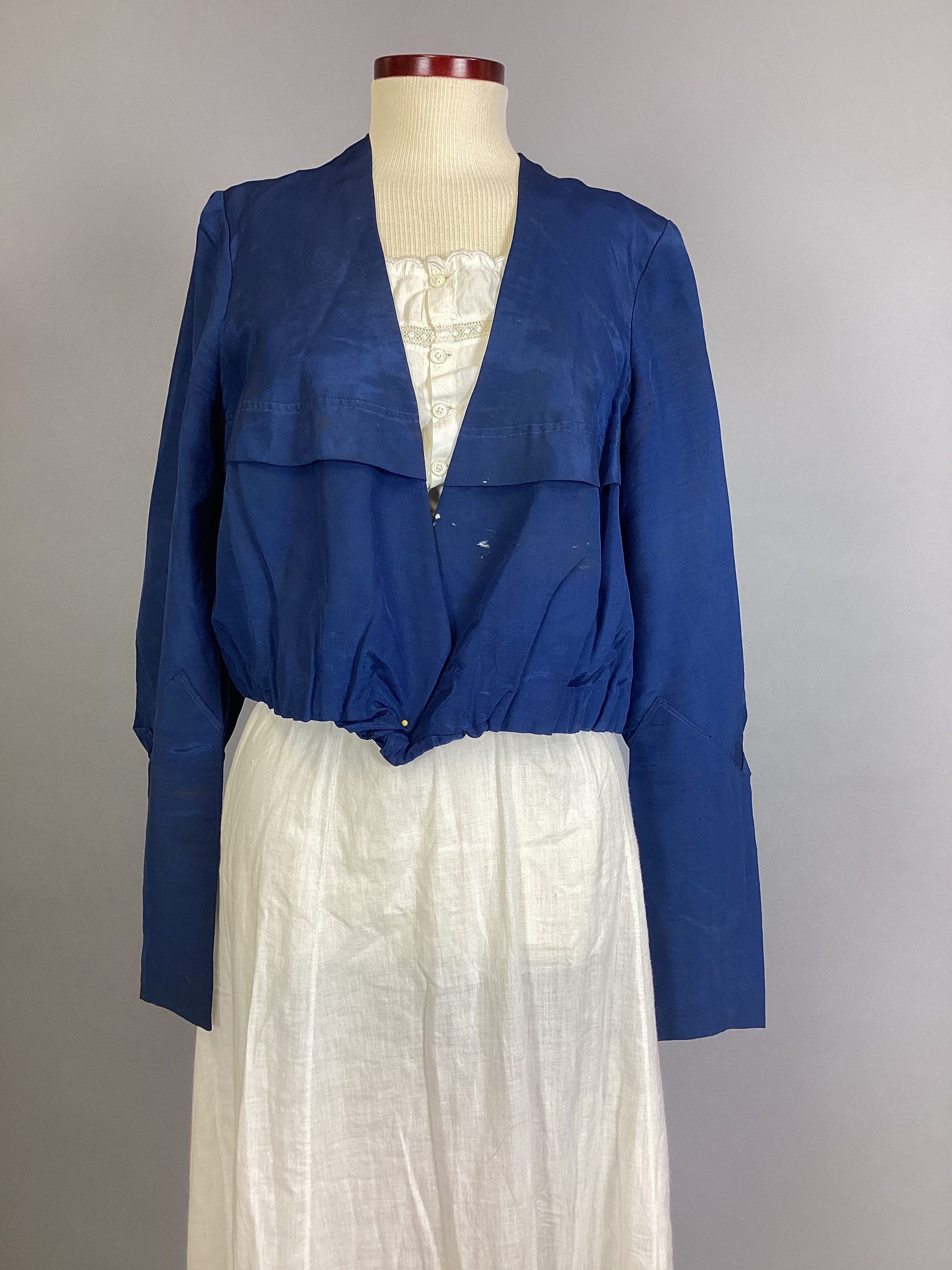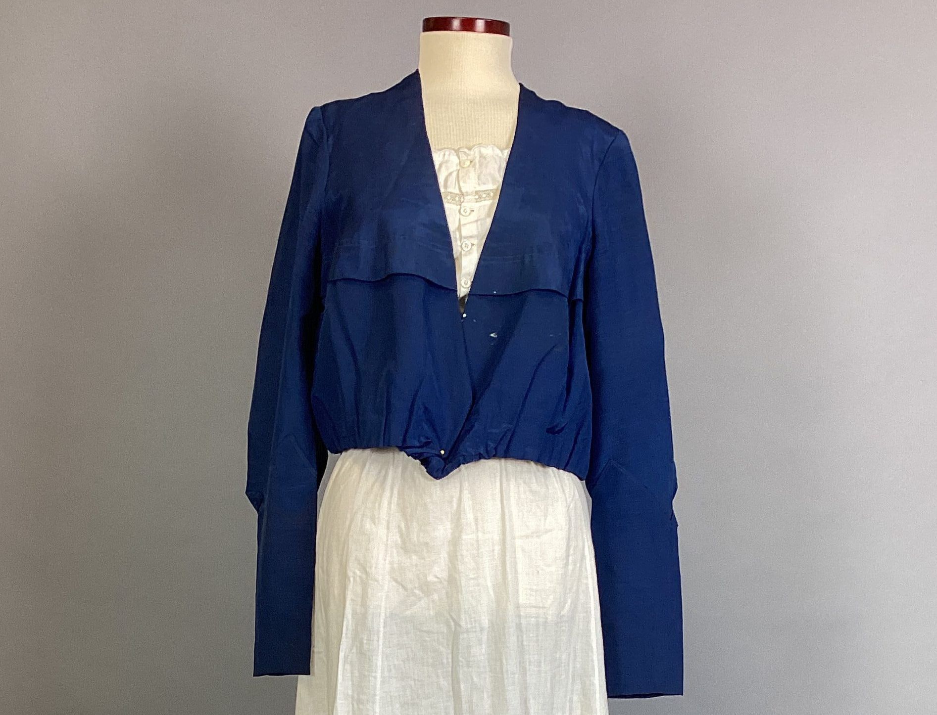 Navy blue blouse; v-neck from the waist; no buttons; 1-1/8" tuck at the bust line; long sleeves; 7-1/2" cuff extends to point 10" from wrist; sleeve is pleated to back of cuff; underarm length 8-1/4" ;1" black elastic in hem of blouse, fastens with 2 hooks and eyes; sheer cotton lining; seam behind bust tuck is pinked.Use