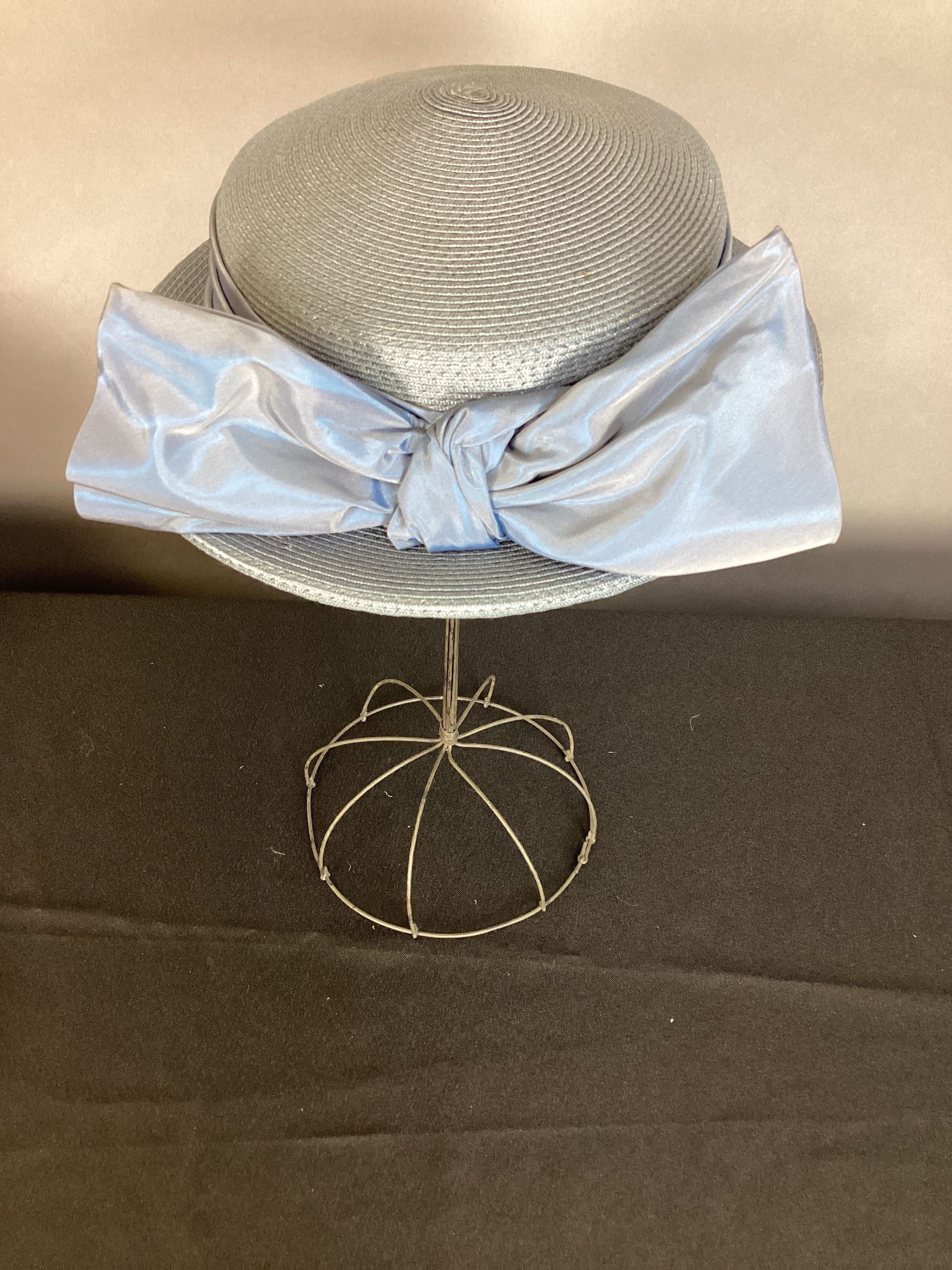 Slate blue, straw with pleated material (4 pleats) around crown, large bow 9" wide 6" deep in front, Blue grosgrain ribbon sweat band inside; Label inside reads "Paris/Lazarus/Cincinnati" Brown on white, Size label MEDIUM alsoCollection
