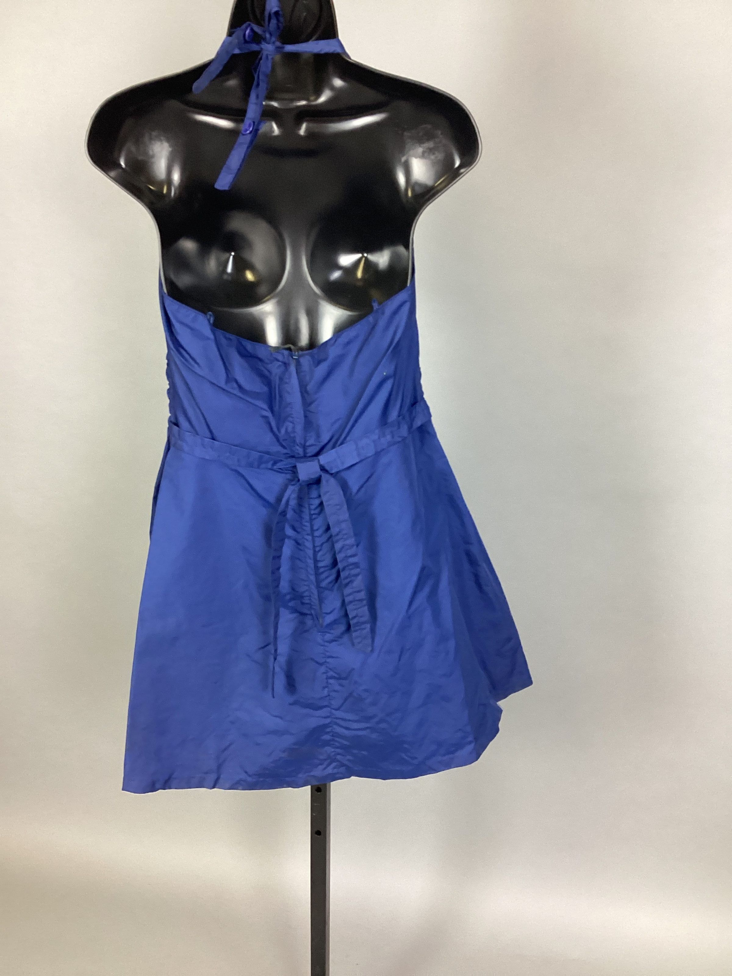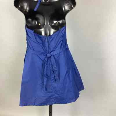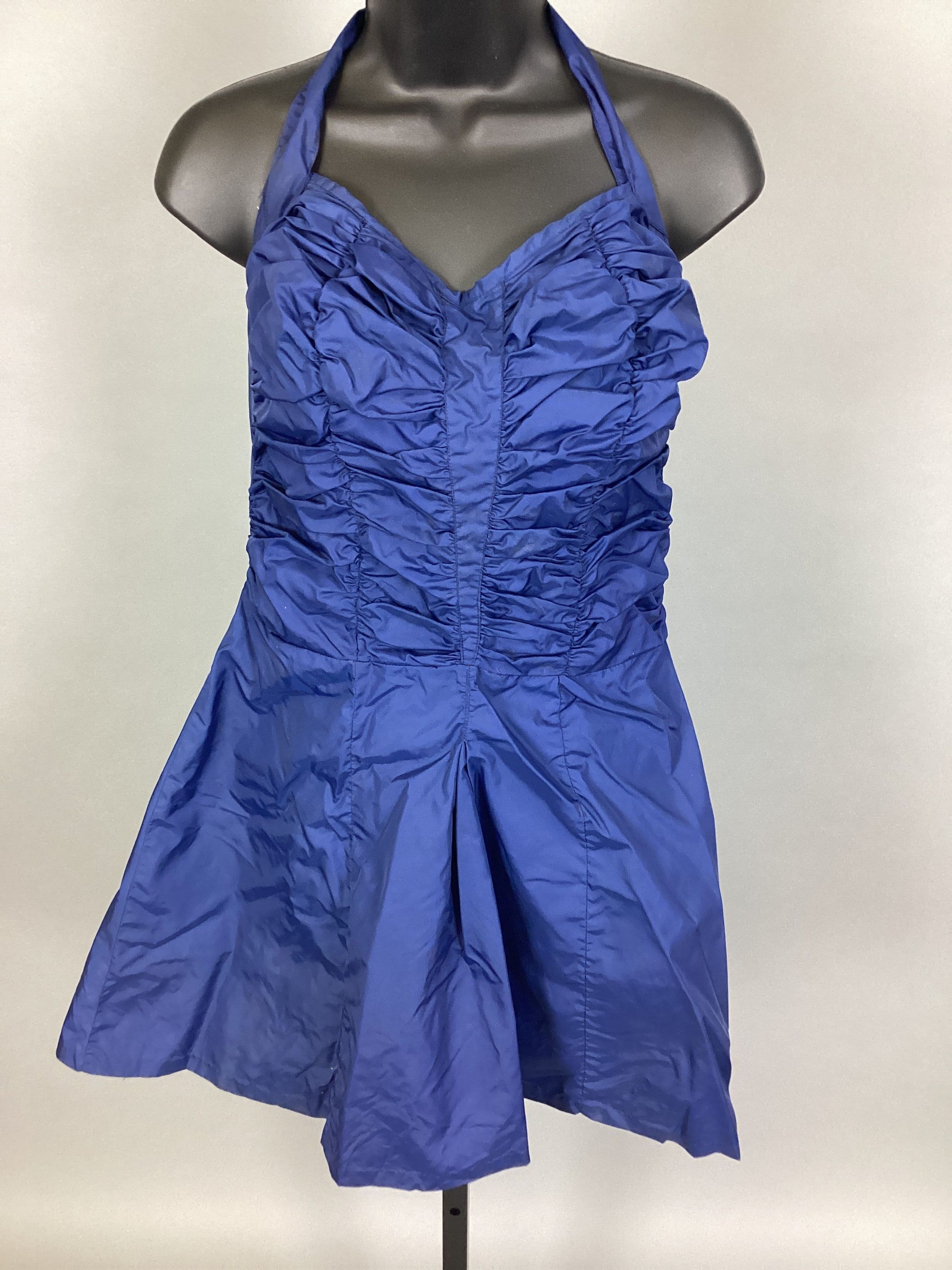 Bathing suit. Shirred front, back belt tie. Nylon, dark blue.Use