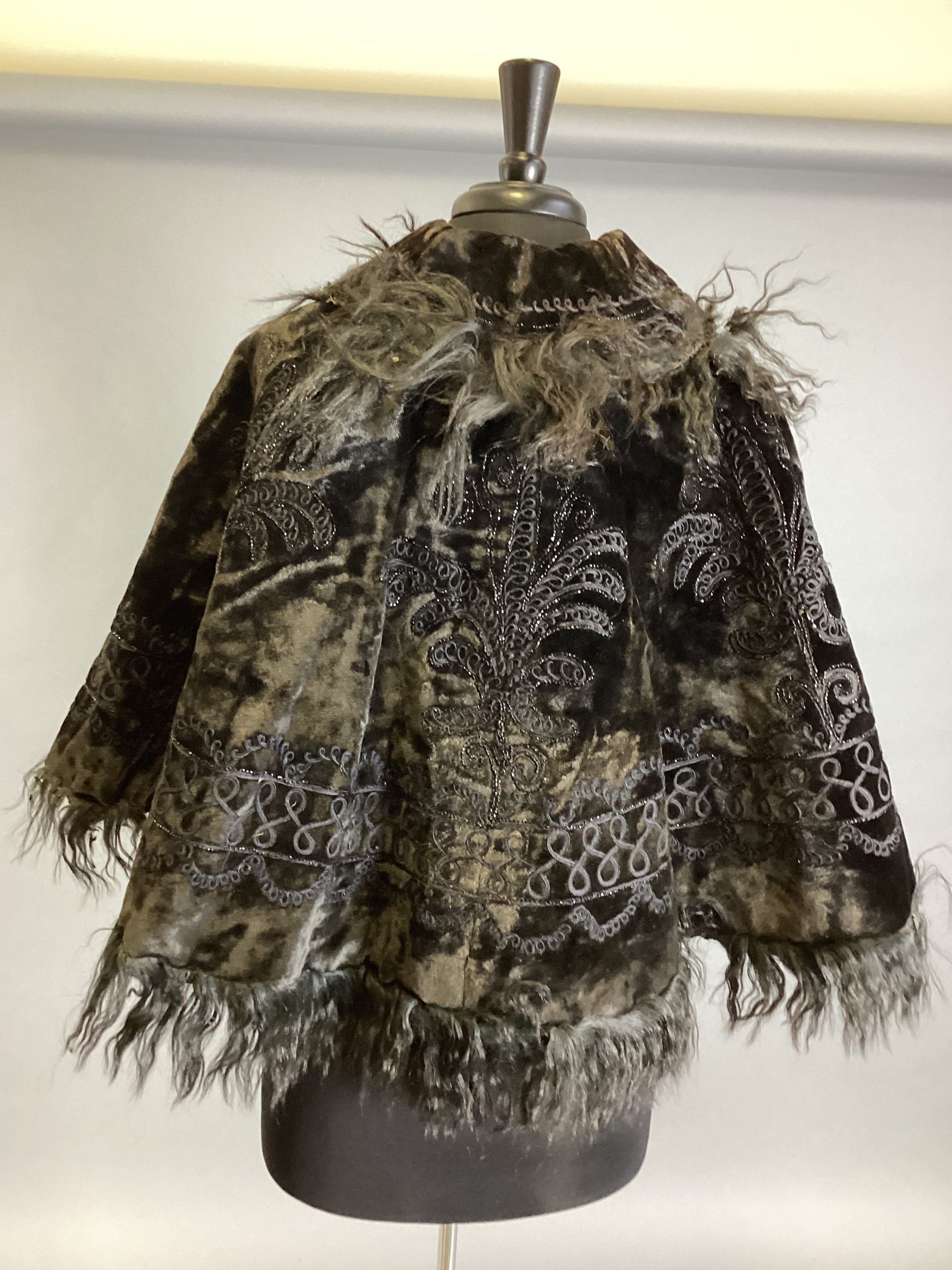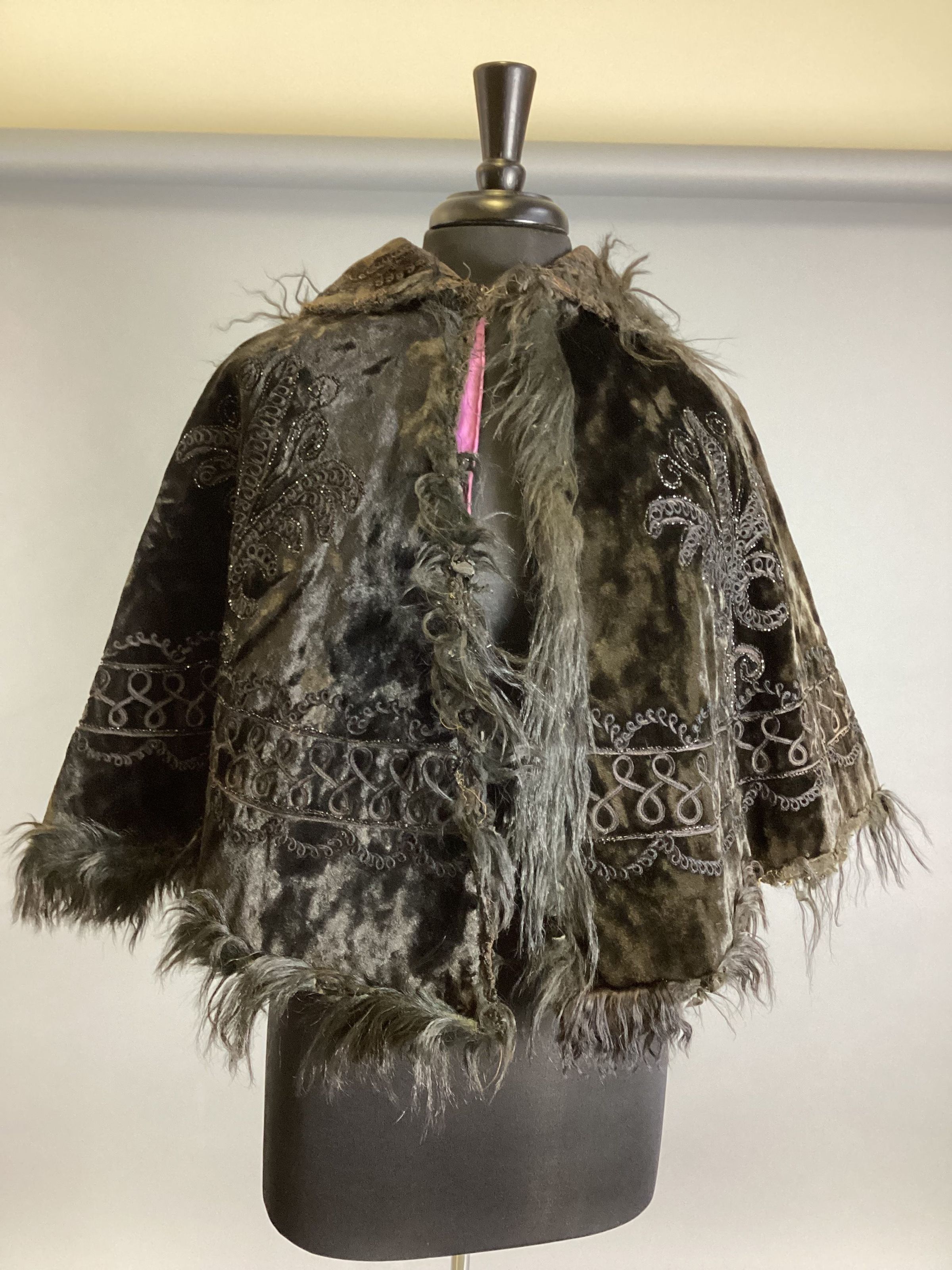 A deep brown fur cape with pink lining. The cape has Colobus Monkey fur trim and ornate embroidered embellishments.Clothing/Dress/Costume Details