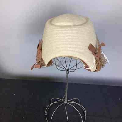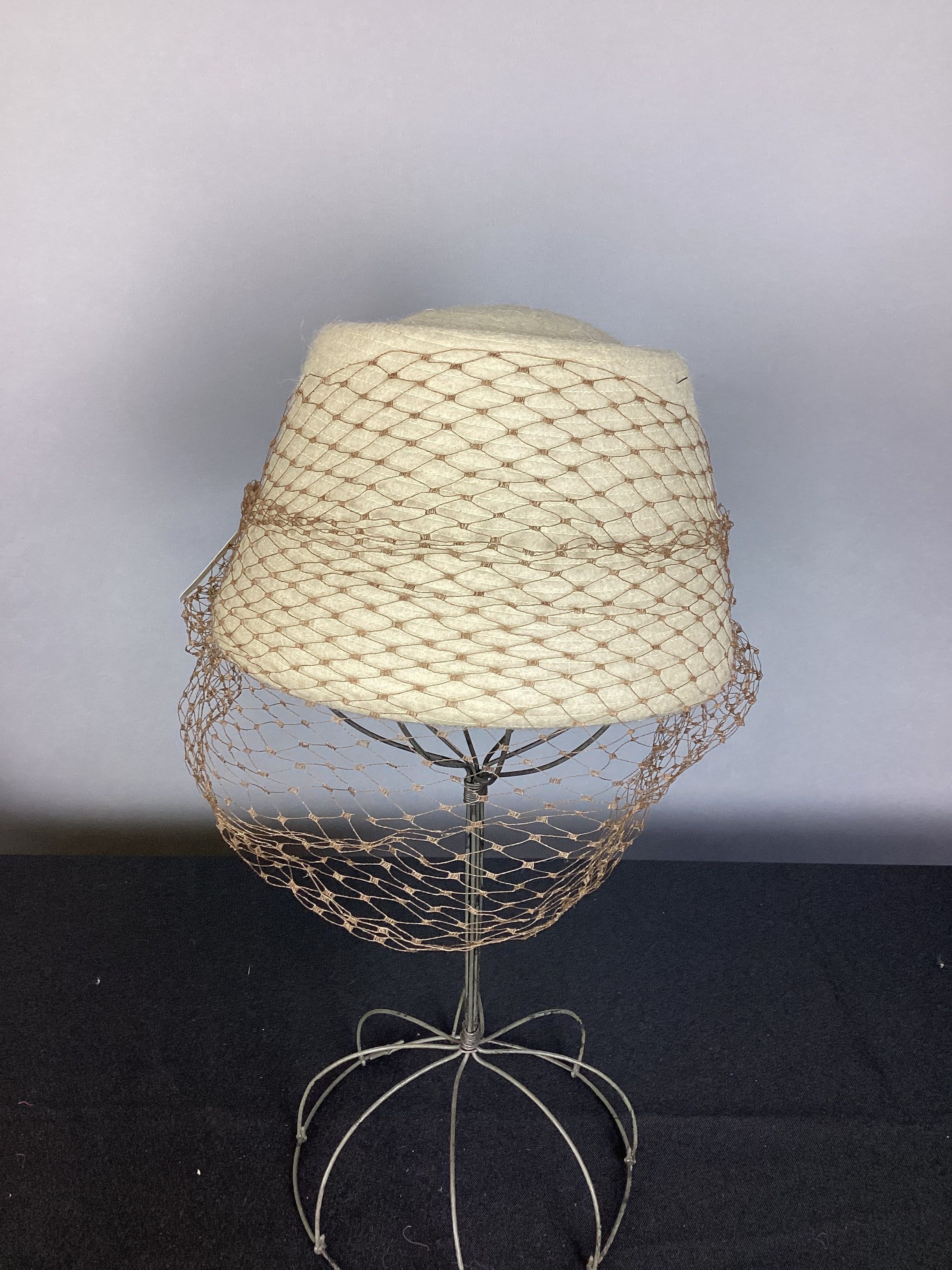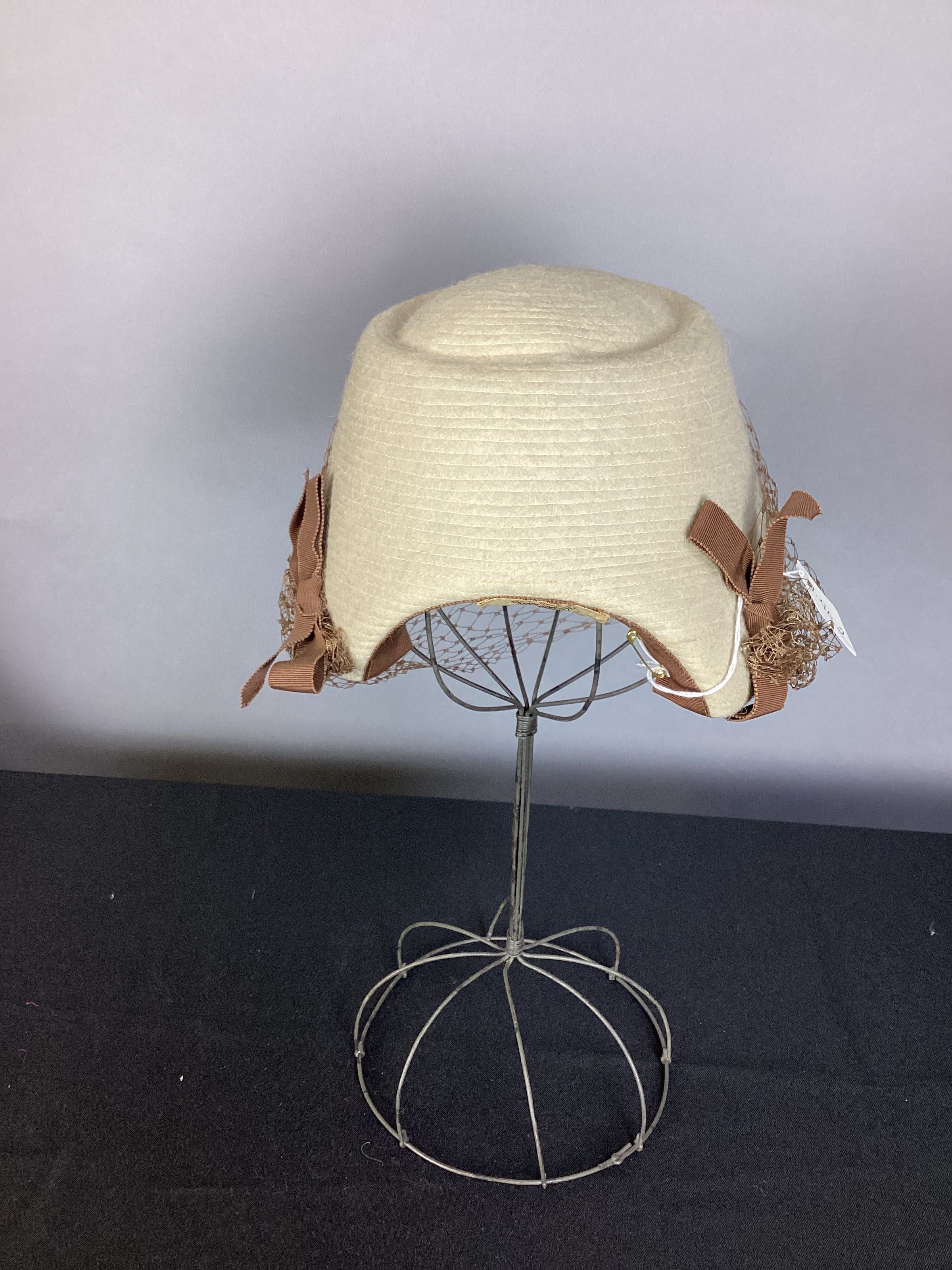 A light tan felt hat with brown veil and brown grosgrain ribbon bow on each side. Light tan stitching 1/8" in rows all around the hat.