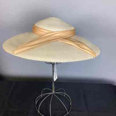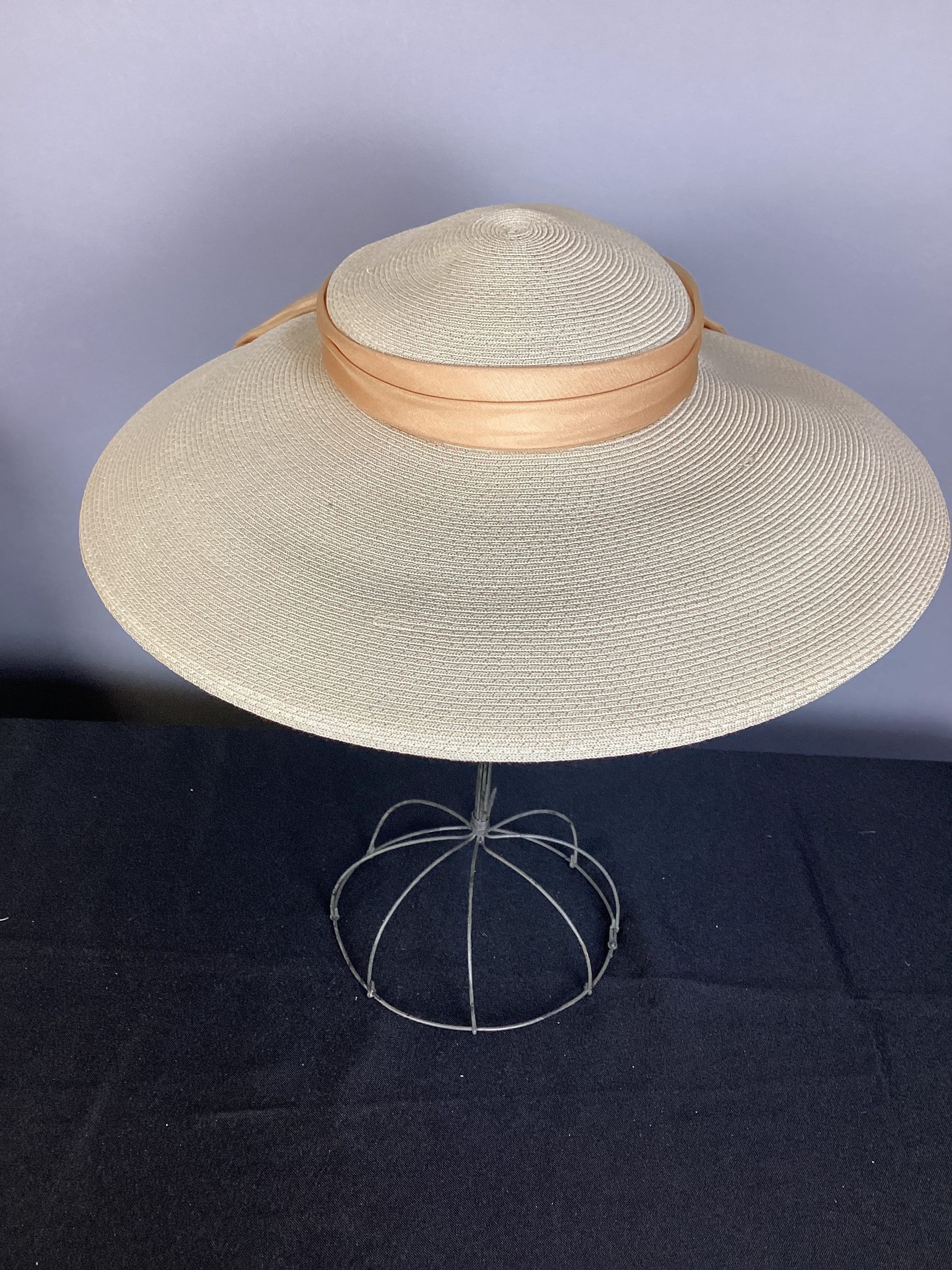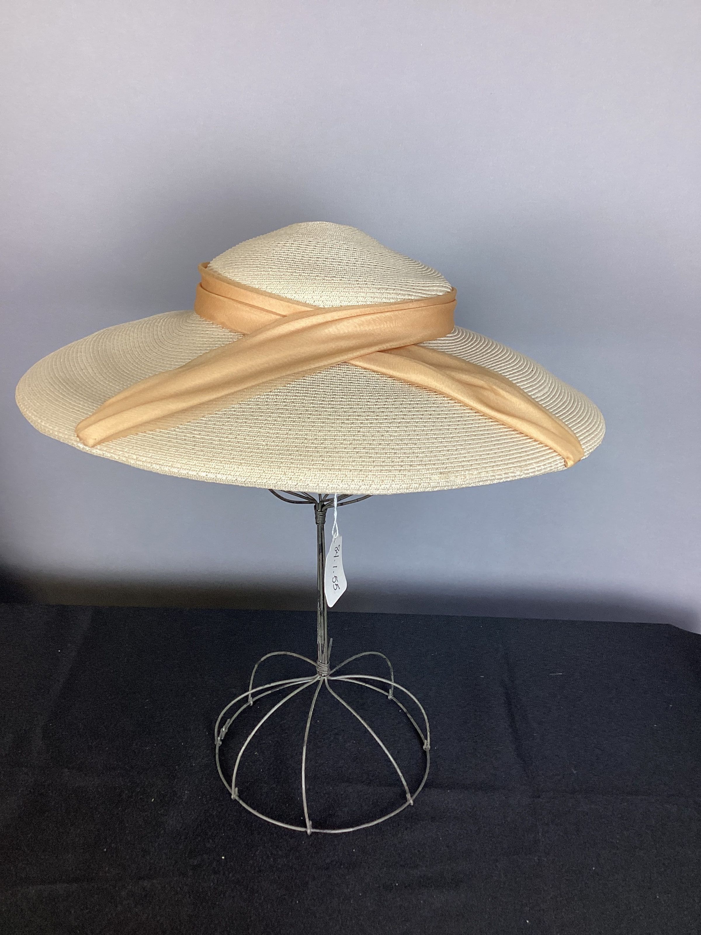 Possibly made of panama straw. Made over a crownless buckram frame. Has wide brim with chiffon-covered taffeta ribbon trim around the crown and extended to edge of brim in back.Context