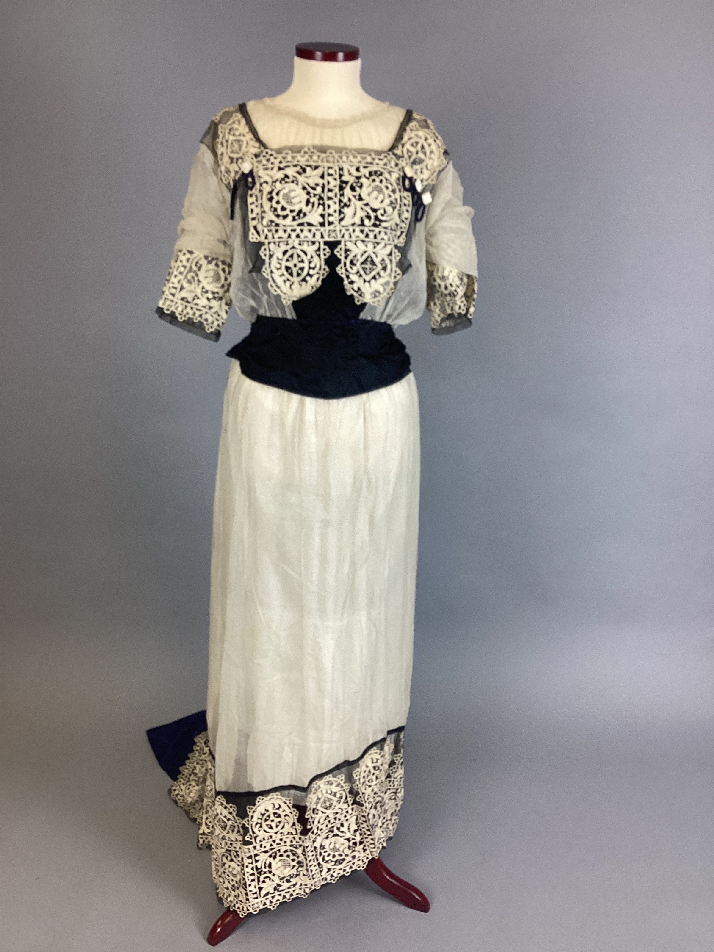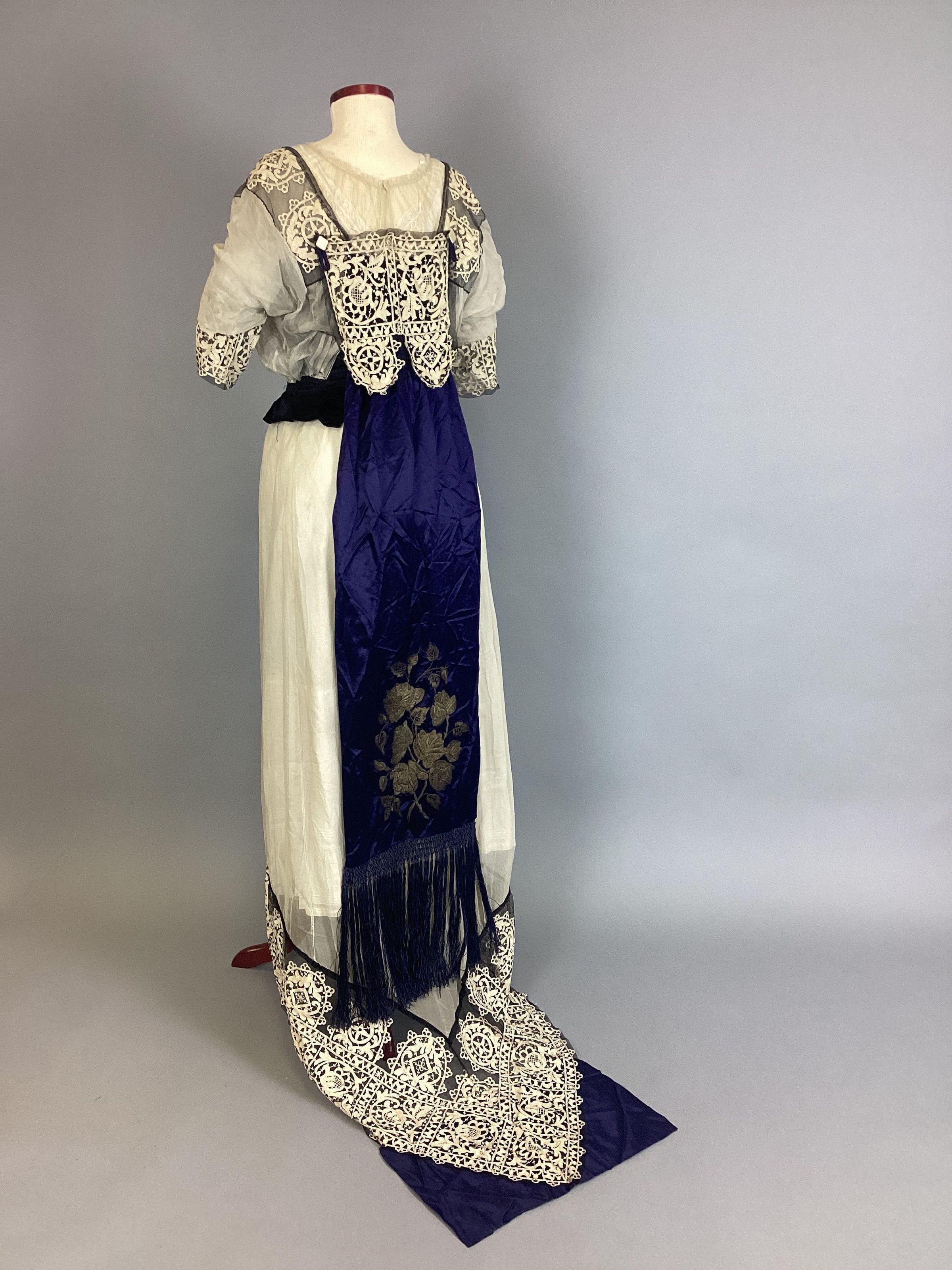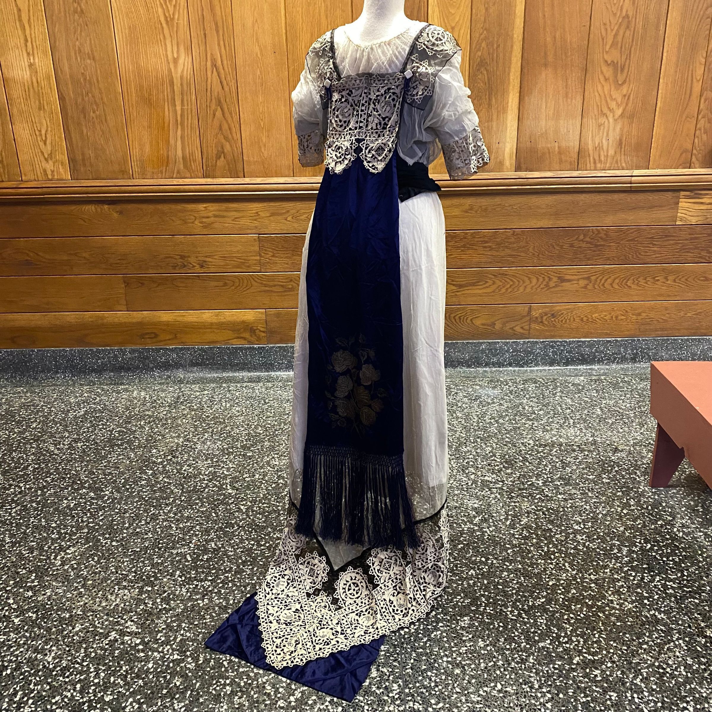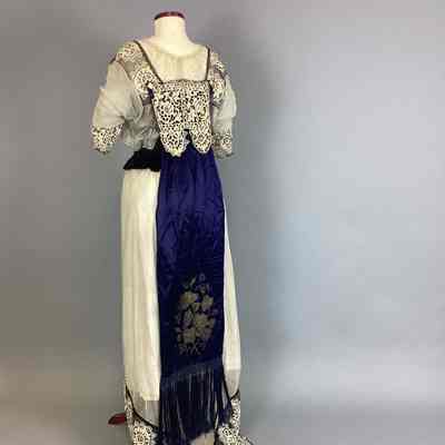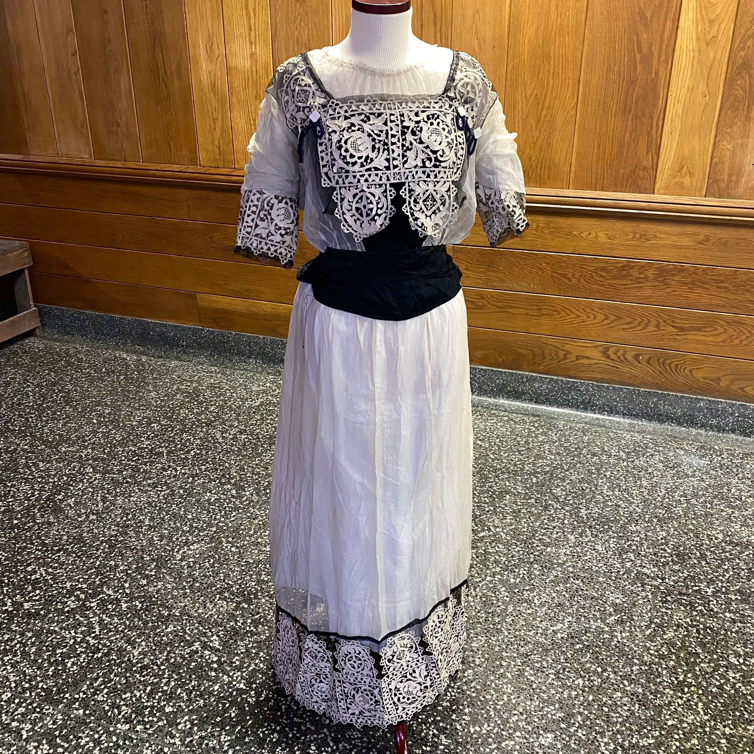 Evening dress in 2 parts. A: White chiffon bodice over black satin trimmed with white coggshell lace on black net; short sleeves with 5" black net & lace cuffs; square neck bordered with black net & lace; three 1/2" square white satin buttons with 1" purple satin loops each side; a panel of purple satin 12" wide & 30" long with 11" fringe hangs in back; flowers embroidered with metalic thread on panel. B: Skirt; 5" purple satin yoke; 4 white chiffon panels hemstitched together forms skirt 27" front; 44" back; border of black net & lace; 16" x 9" piece of purple satin at point of train. Picture on back of original record in card file.Collection