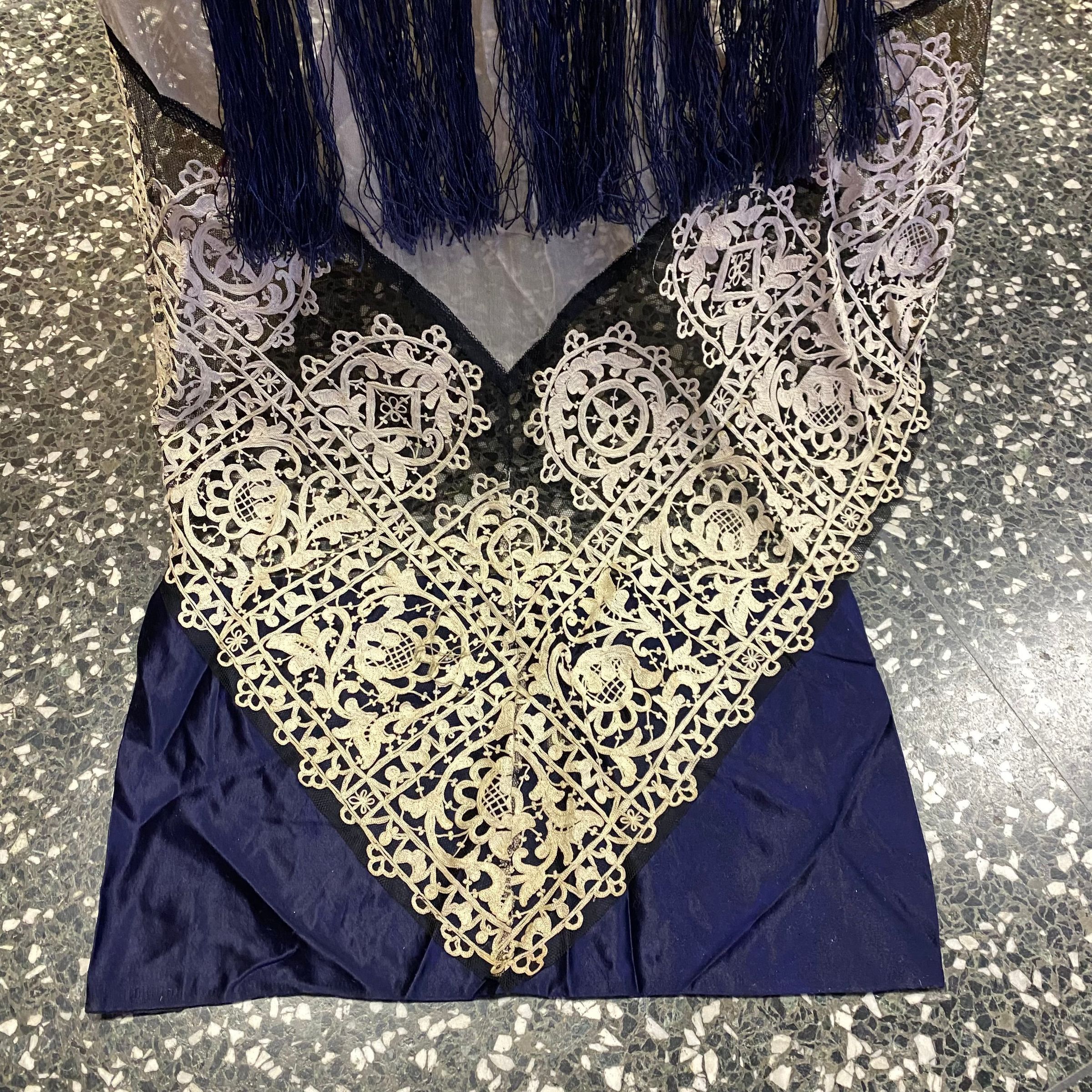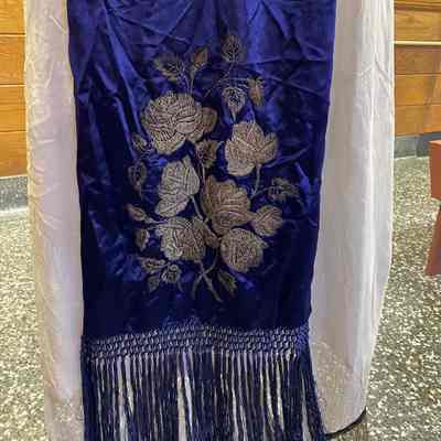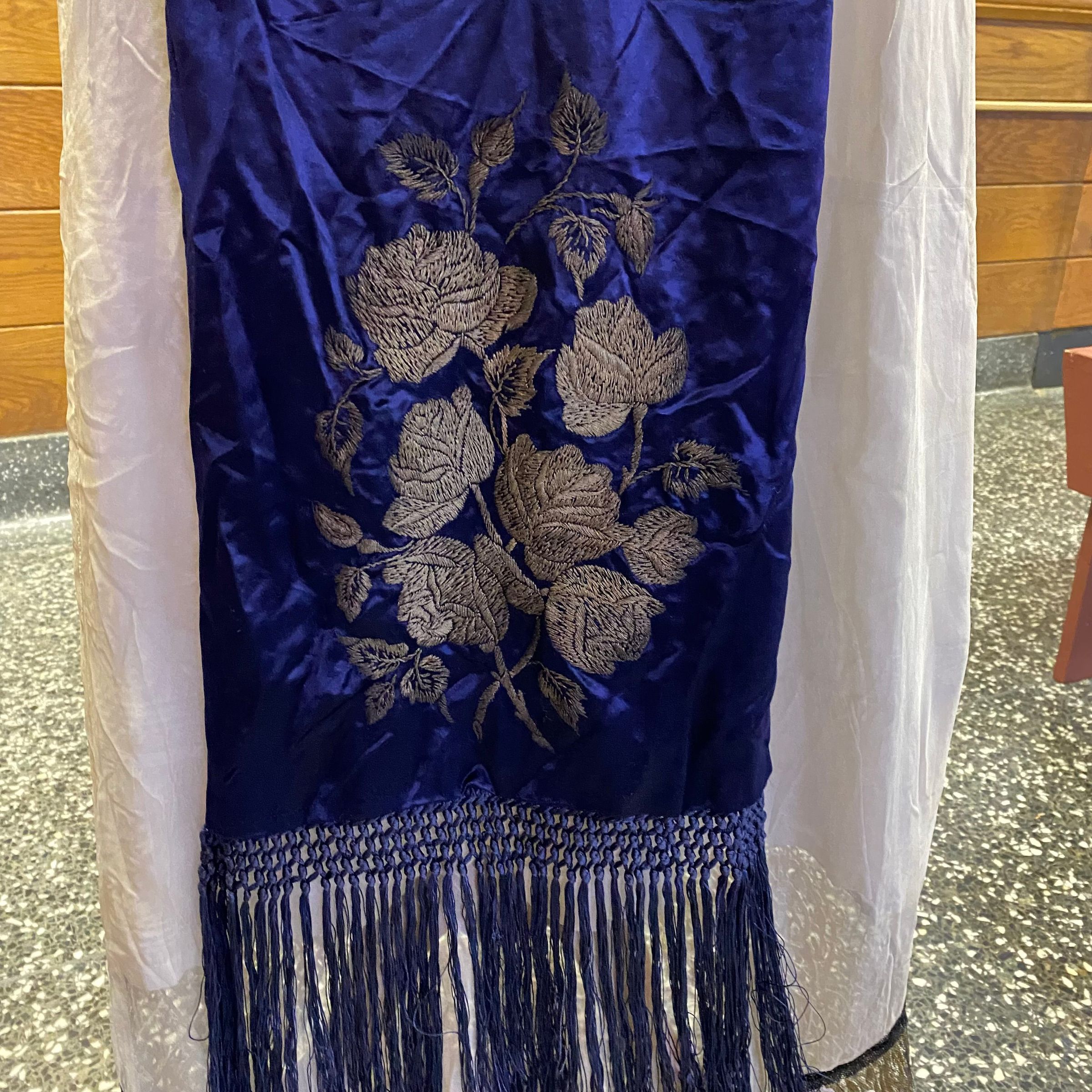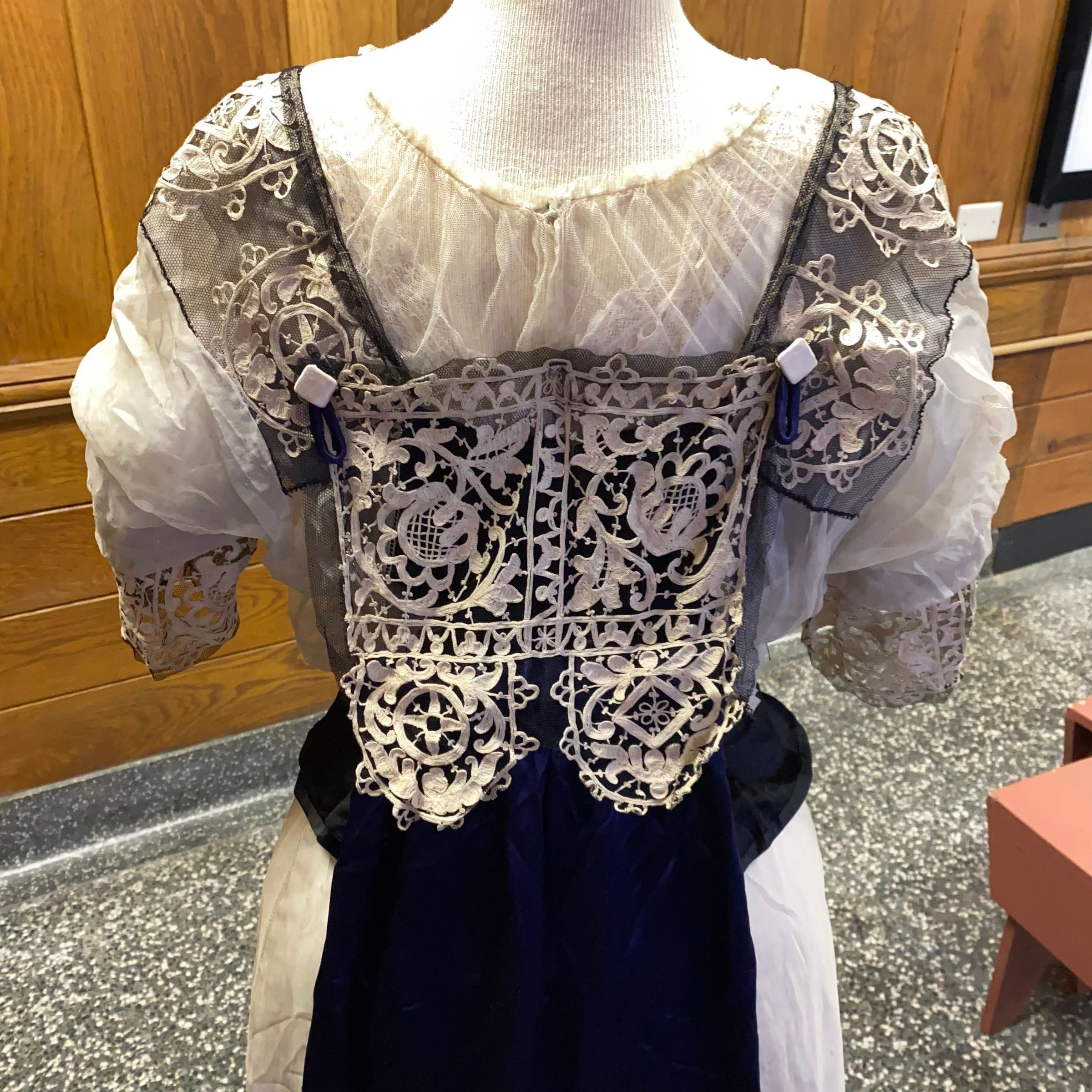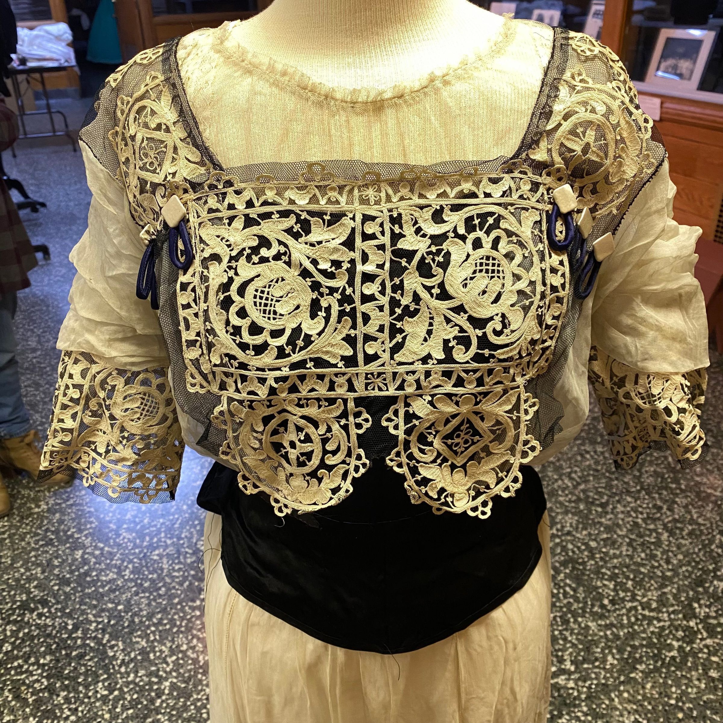 Evening dress in 2 parts. A: White chiffon bodice over black satin trimmed with white coggshell lace on black net; short sleeves with 5" black net & lace cuffs; square neck bordered with black net & lace; three 1/2" square white satin buttons with 1" purple satin loops each side; a panel of purple satin 12" wide & 30" long with 11" fringe hangs in back; flowers embroidered with metalic thread on panel. B: Skirt; 5" purple satin yoke; 4 white chiffon panels hemstitched together forms skirt 27" front; 44" back; border of black net & lace; 16" x 9" piece of purple satin at point of train. Picture on back of original record in card file.Collection