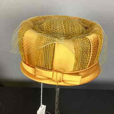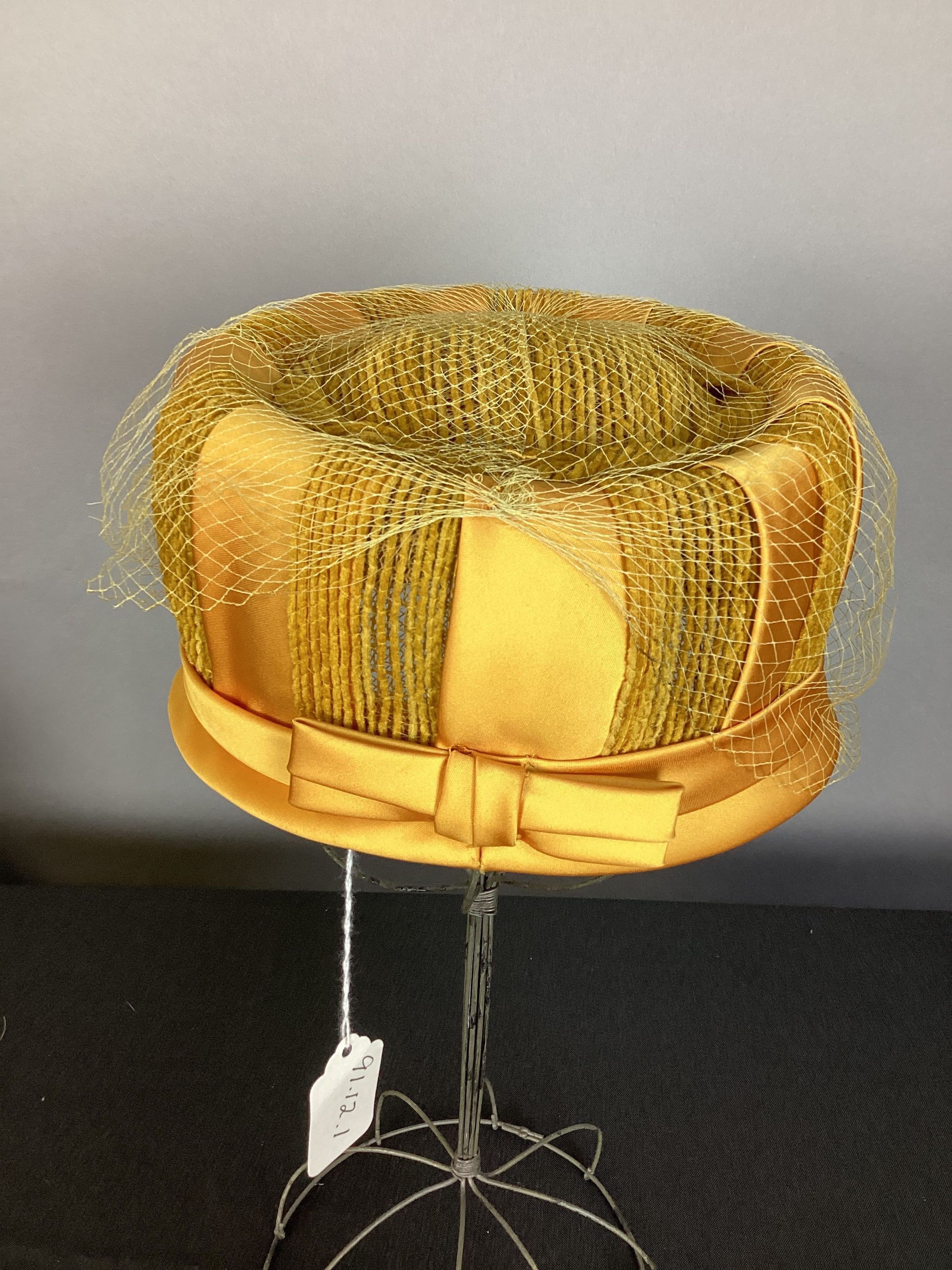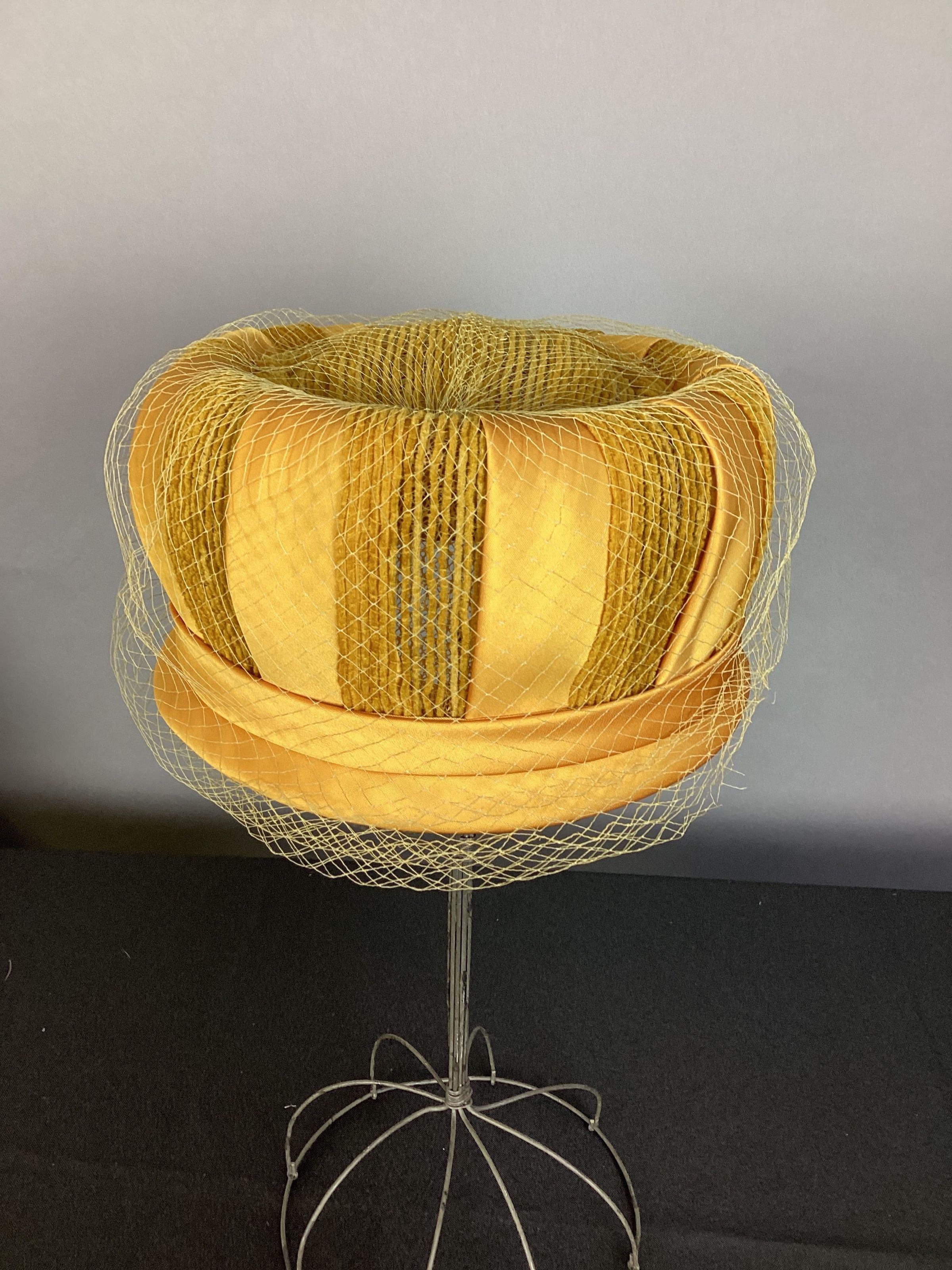 A gold satin & net hat / some shape w/ alternating gold satin & velour stripe / small satin bow in back / hat covered with gold net.Acquisition