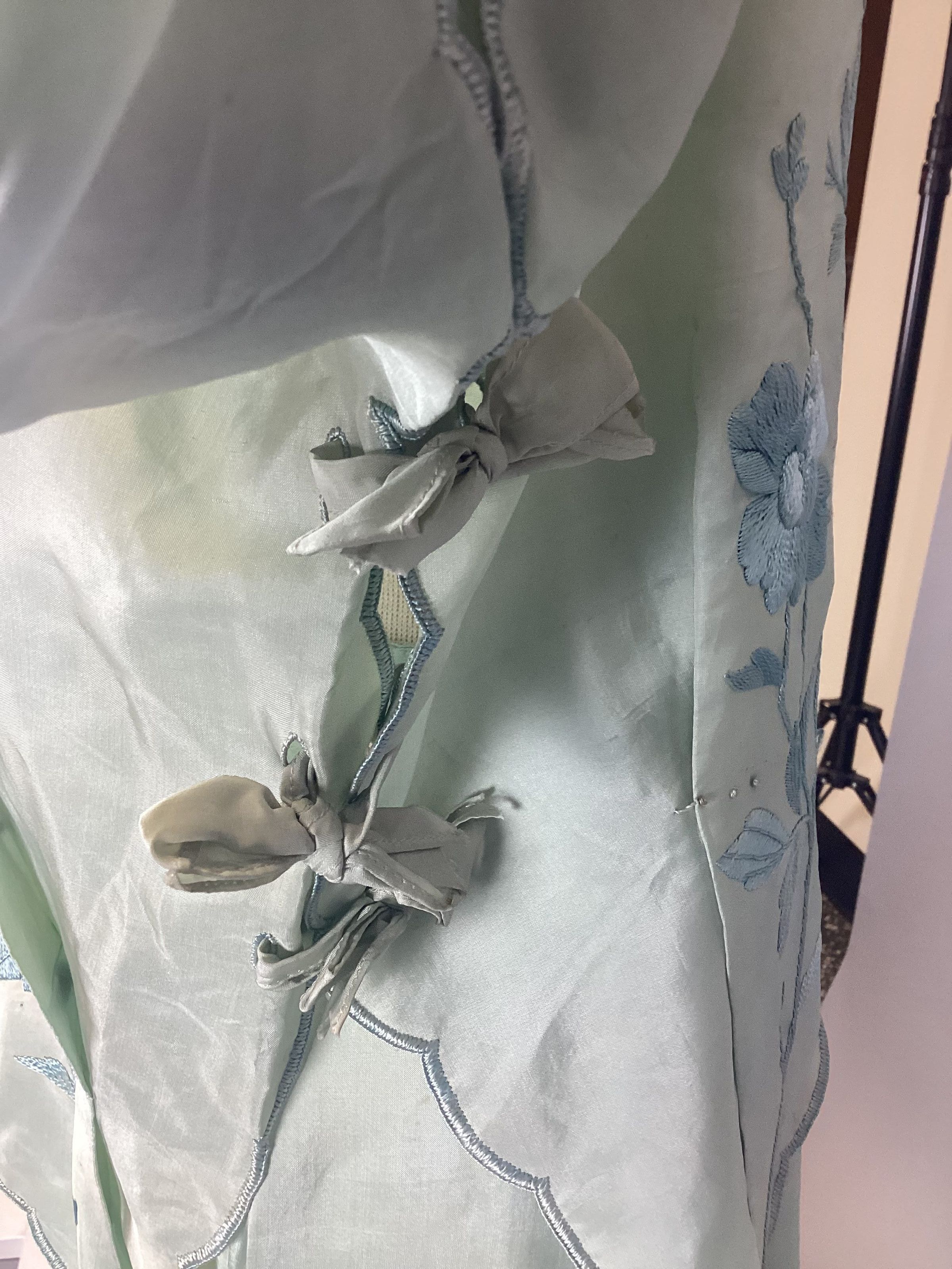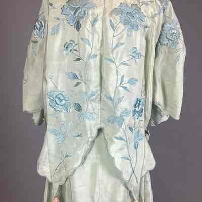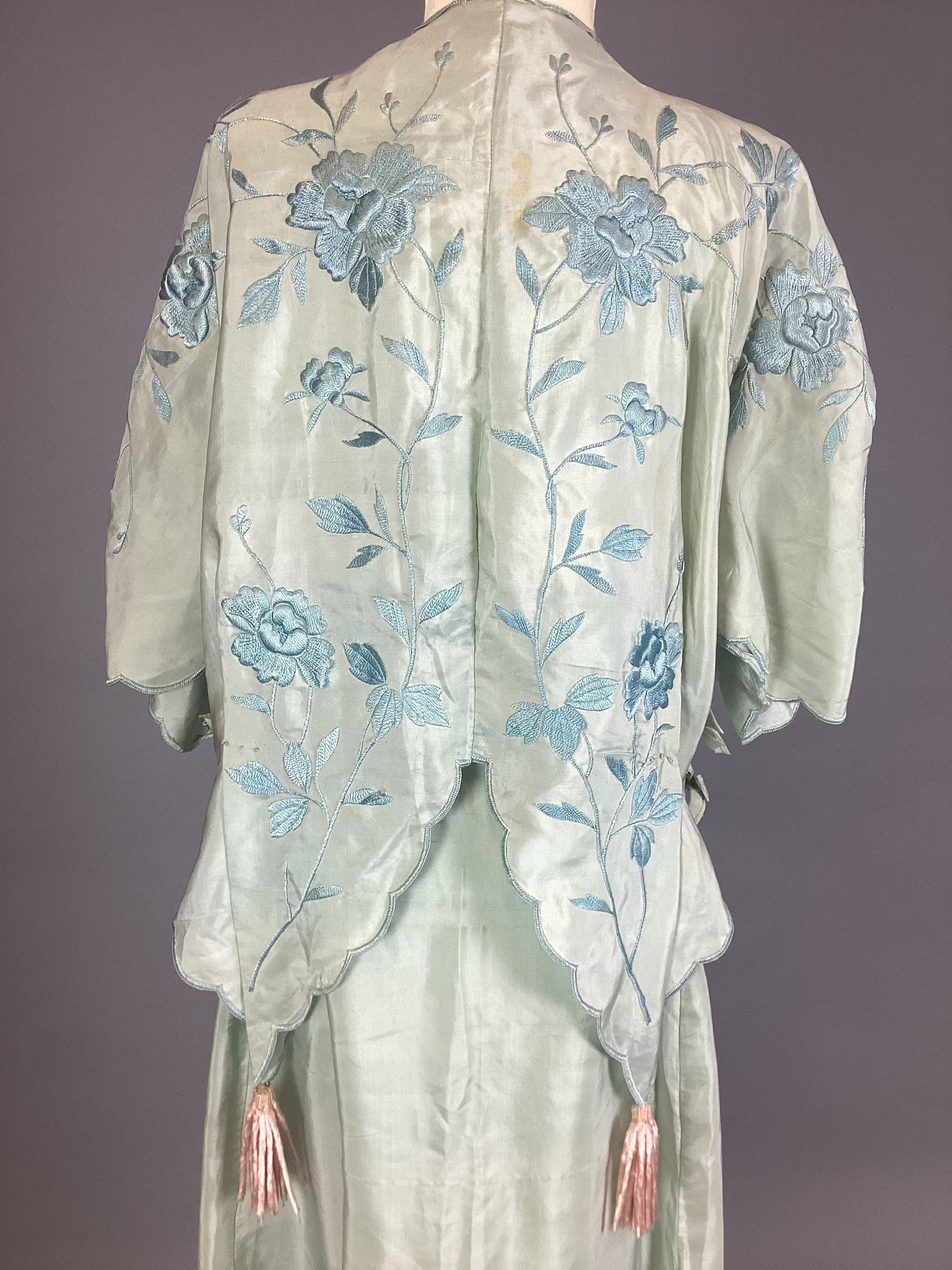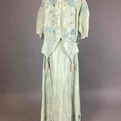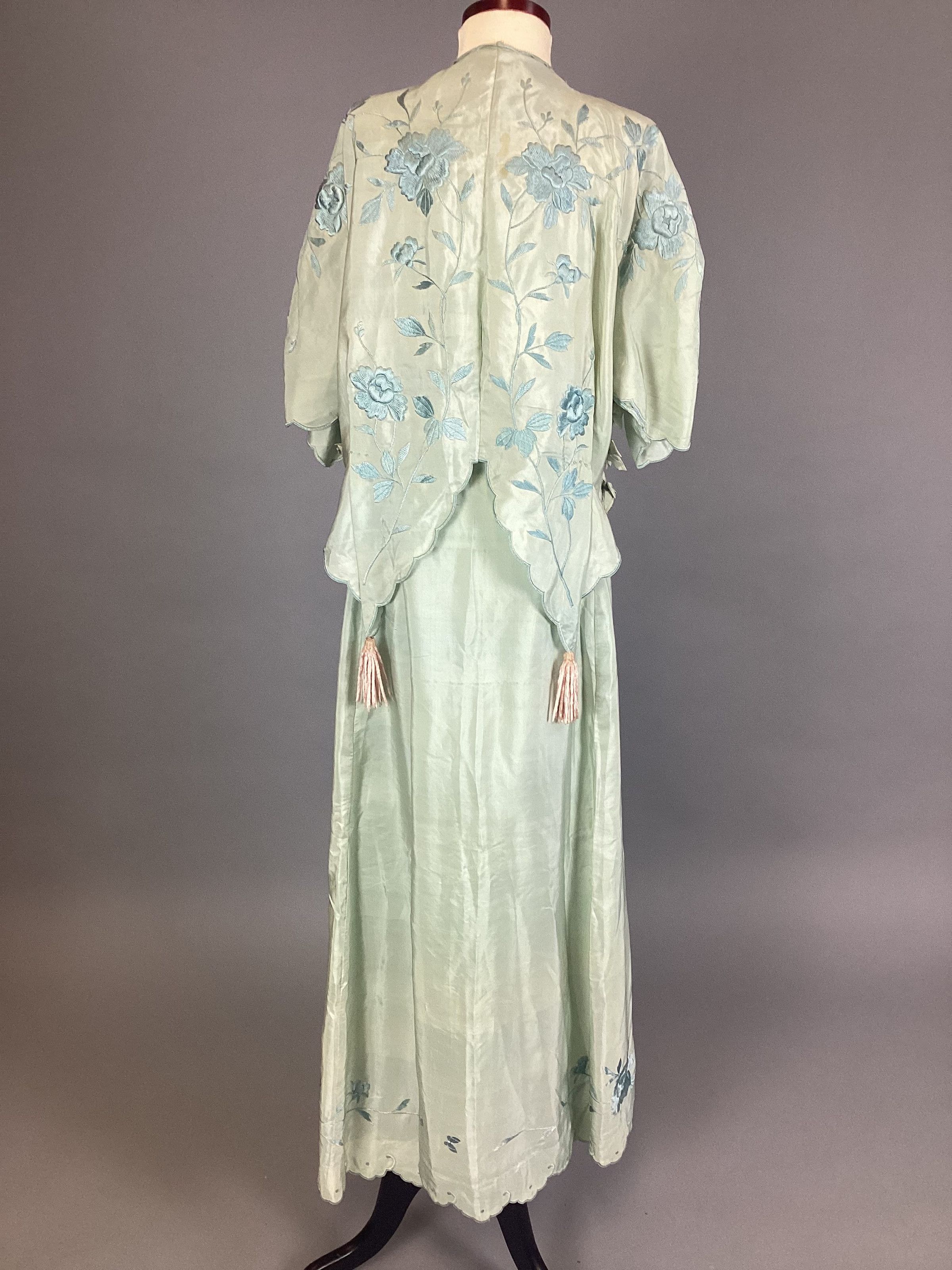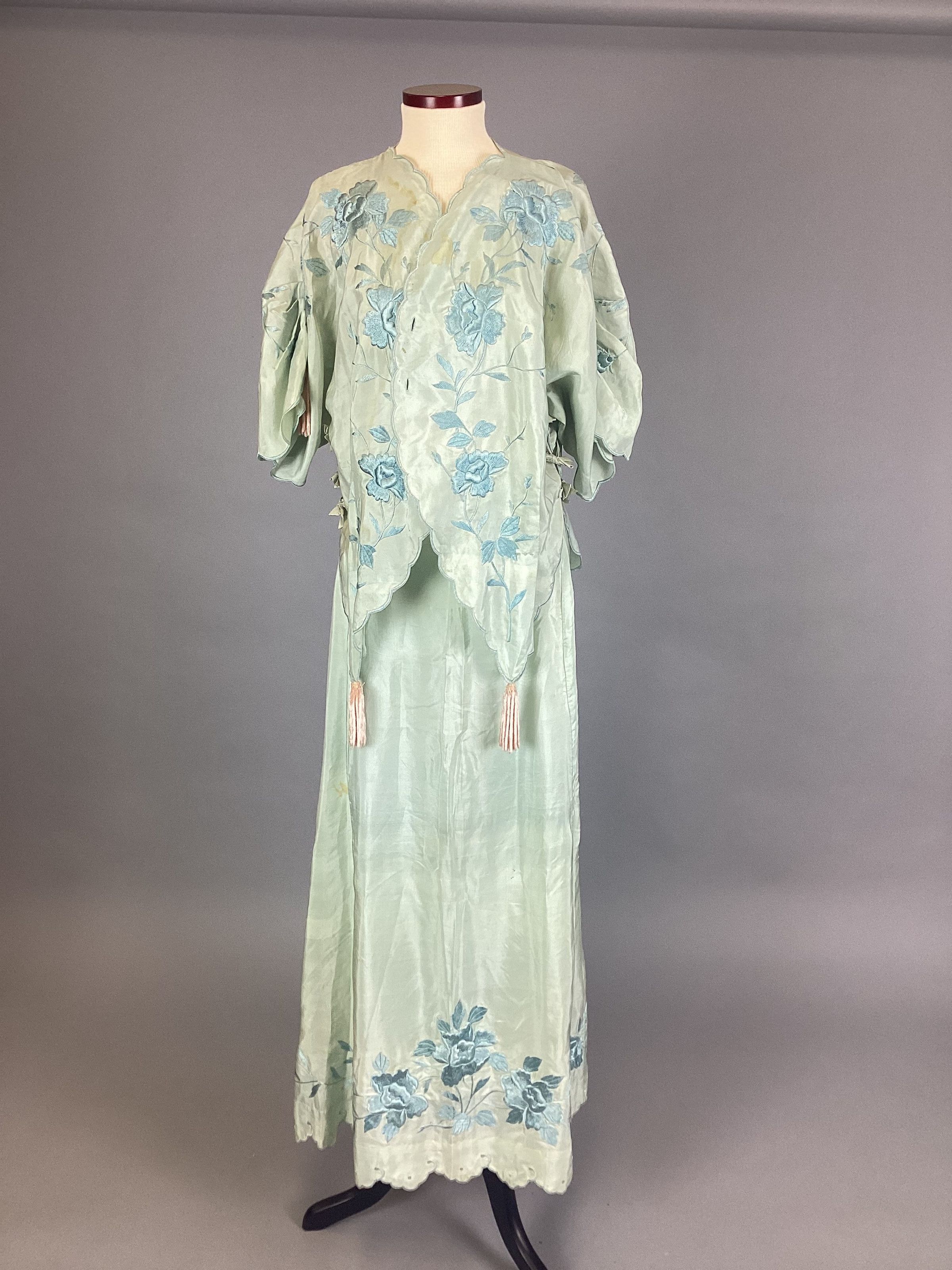 A women's green dress comprised of a jacket / blouse and a long skirt. The jacket has blue floral embroidery, a scalloped trim, ribbons at the sides, and four pink fringe tassels. The skirt has blue floral embroidery just above a scalloped eyelet trim.Use