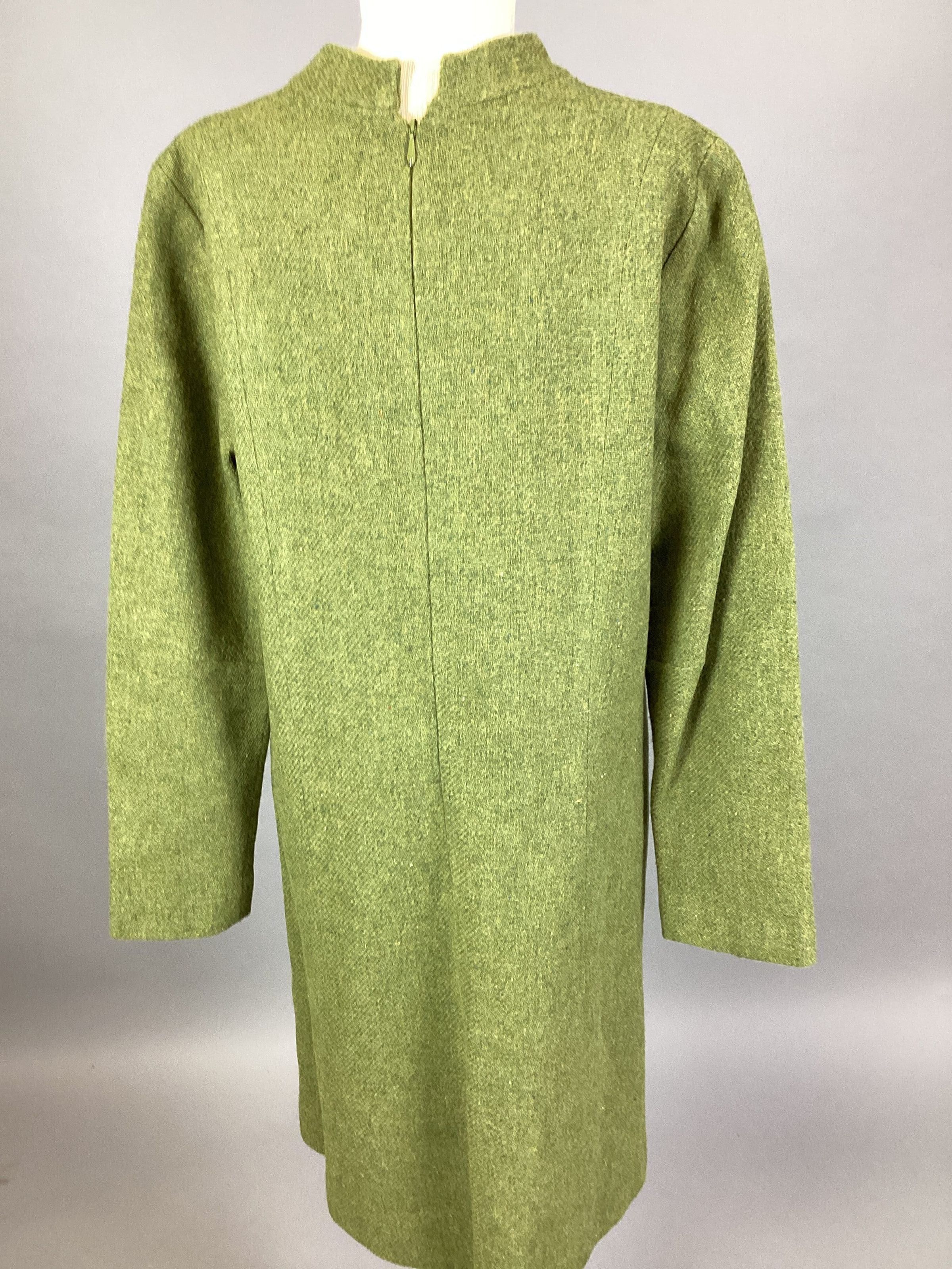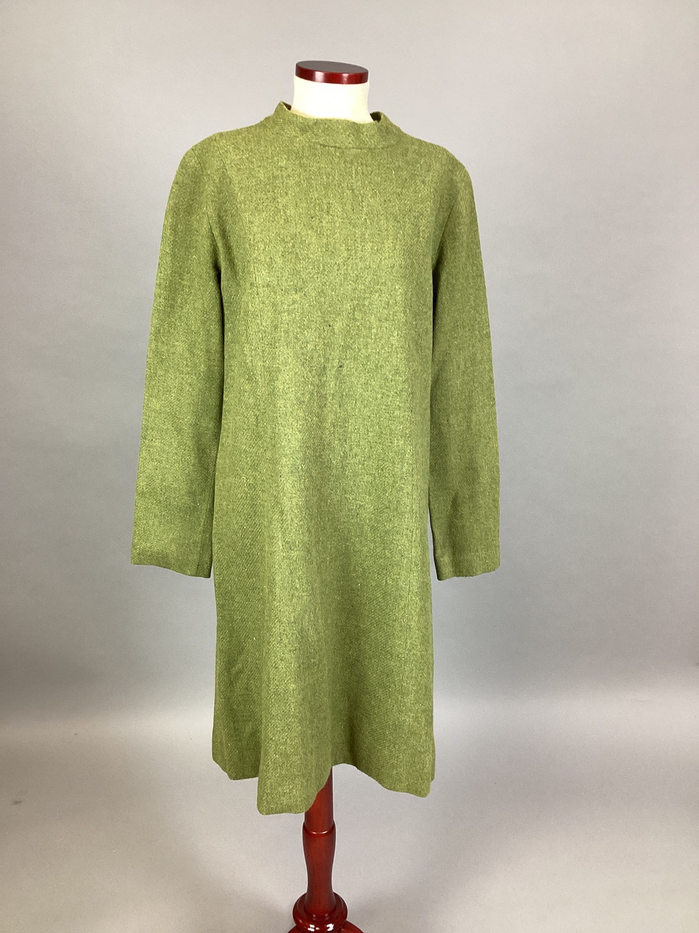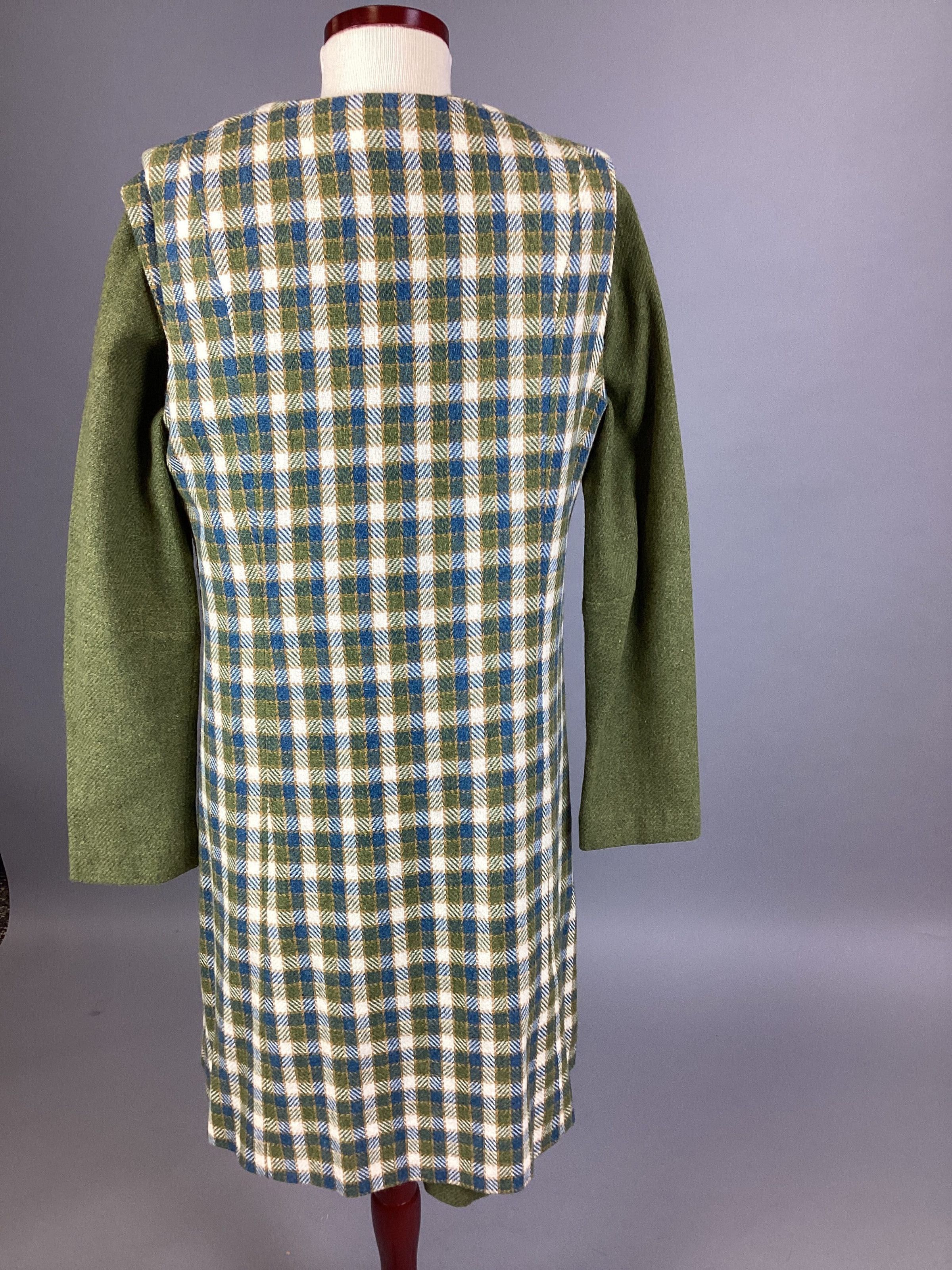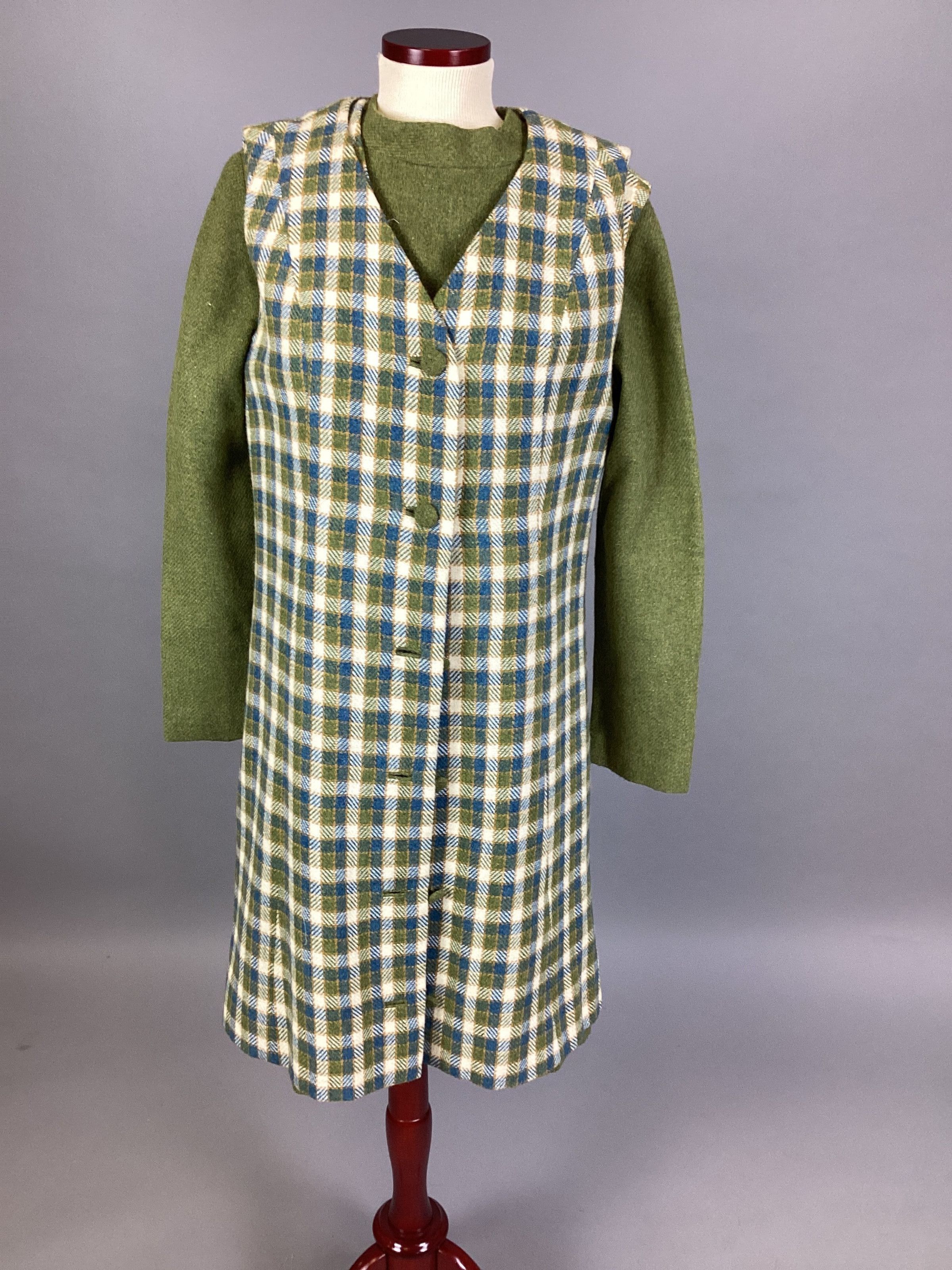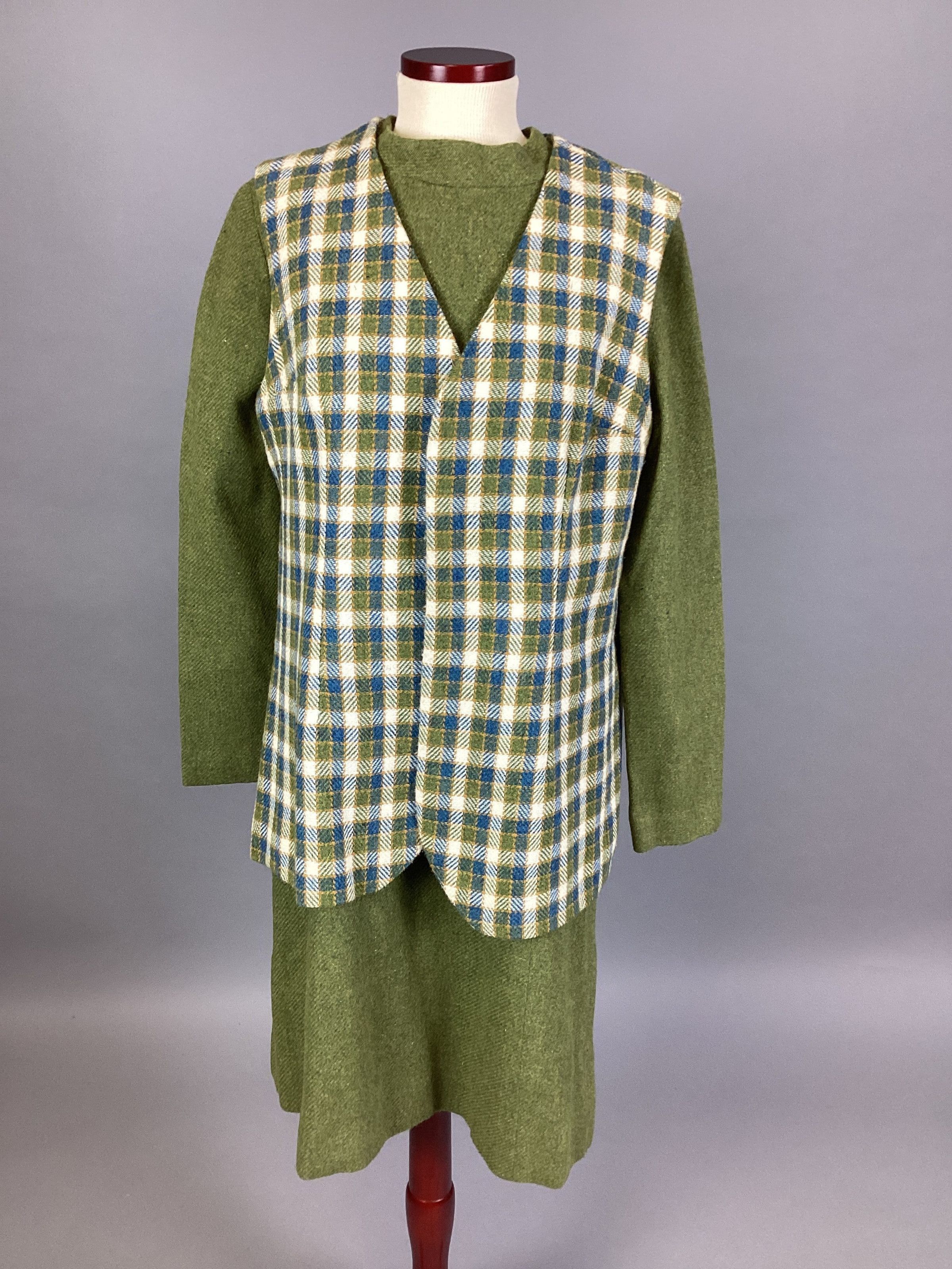 3 piece outfit. Dress - princess style in green wool, fully lined, long sleeves, hight neck with stand up band around neck, opens in back with zipper. 2 sleeveless jackets in a green & blue & white plaid wool; 1 jacket is full length with v-neck, 6 buttons covered in plain green wool in front, lined in green silk, jacket is princess style like dress. Other jacket is hip length with vent in back rar, open front with no buttons, lined in green silk. Sub-numbered A-C.