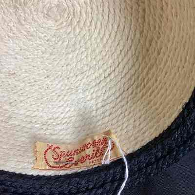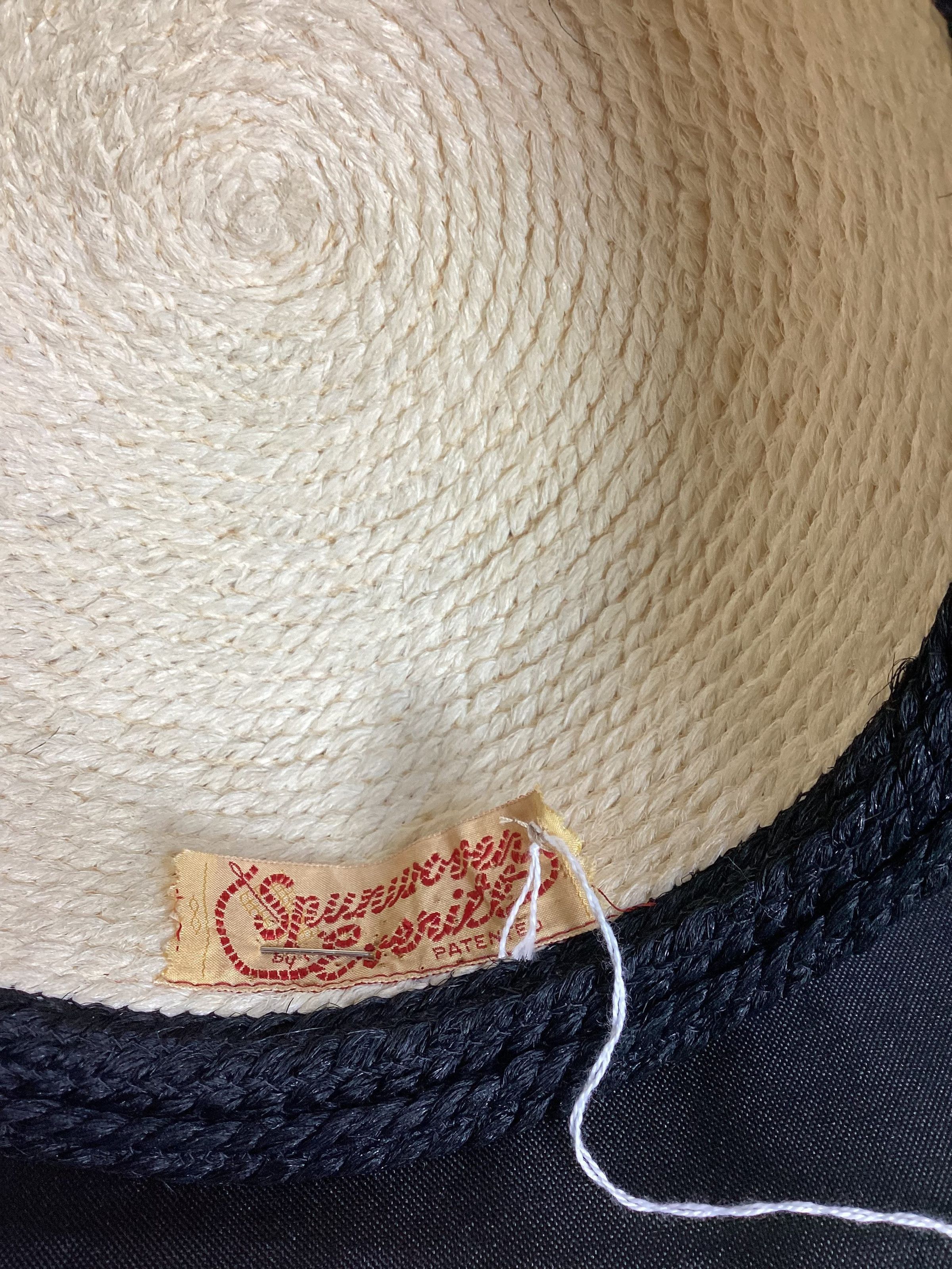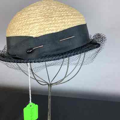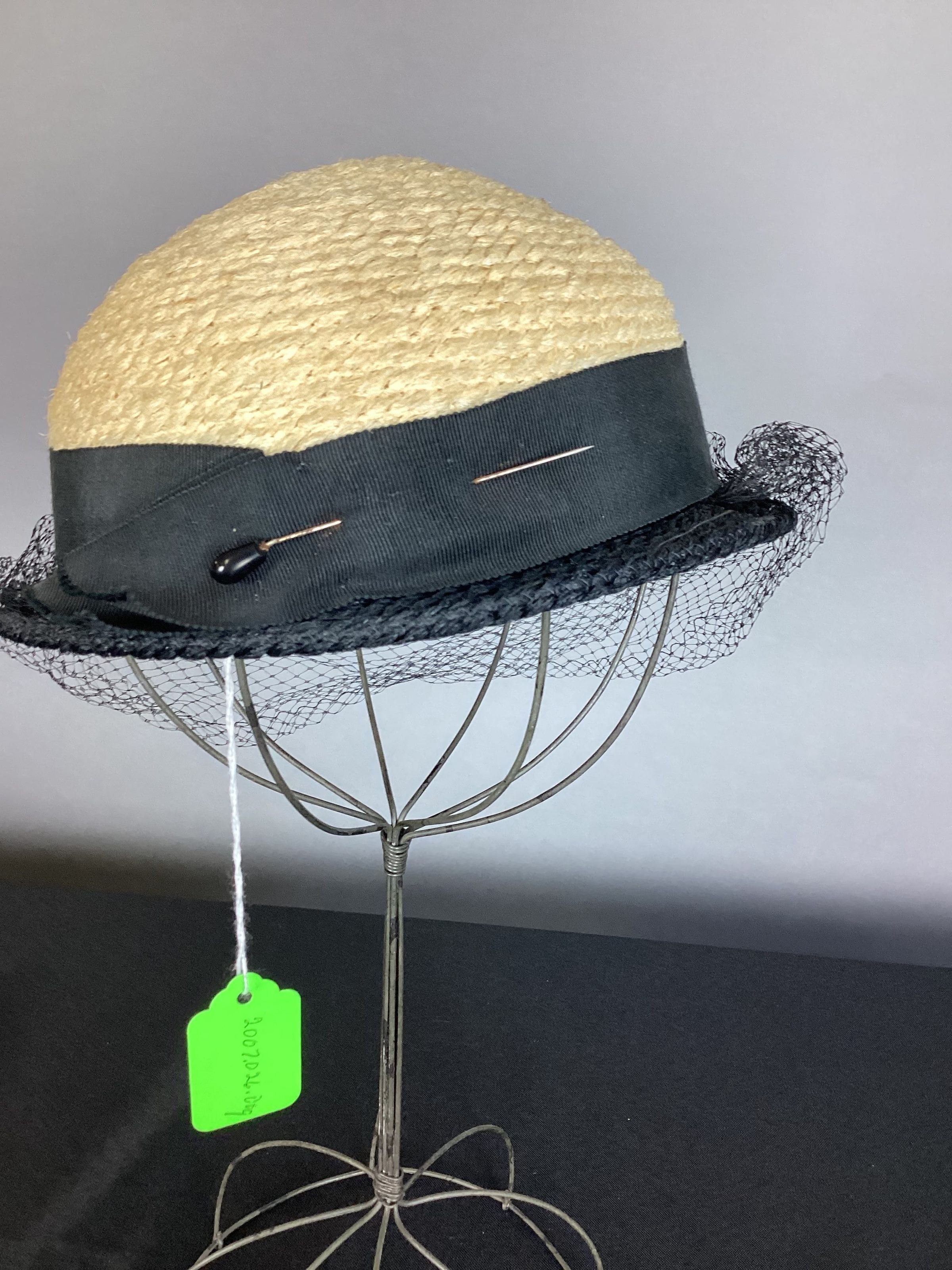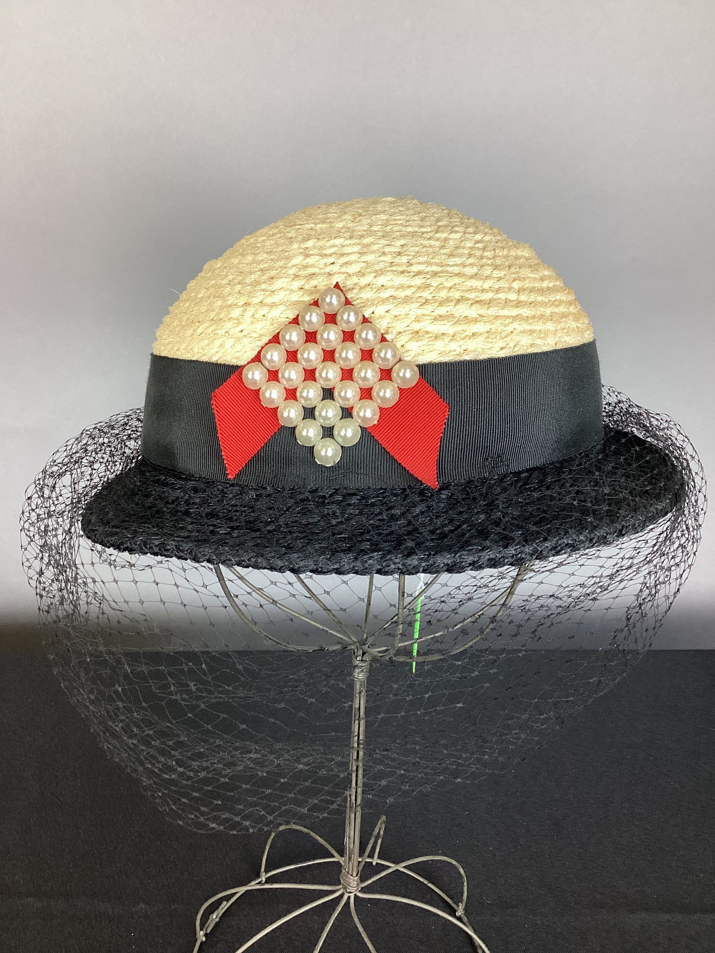 Cream colored 'straw look' with narrow brim of black, black grograin ribbon arouwnd crown, black veil trimmed with red grograin ribbon and 20 pearls