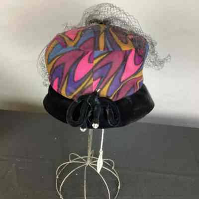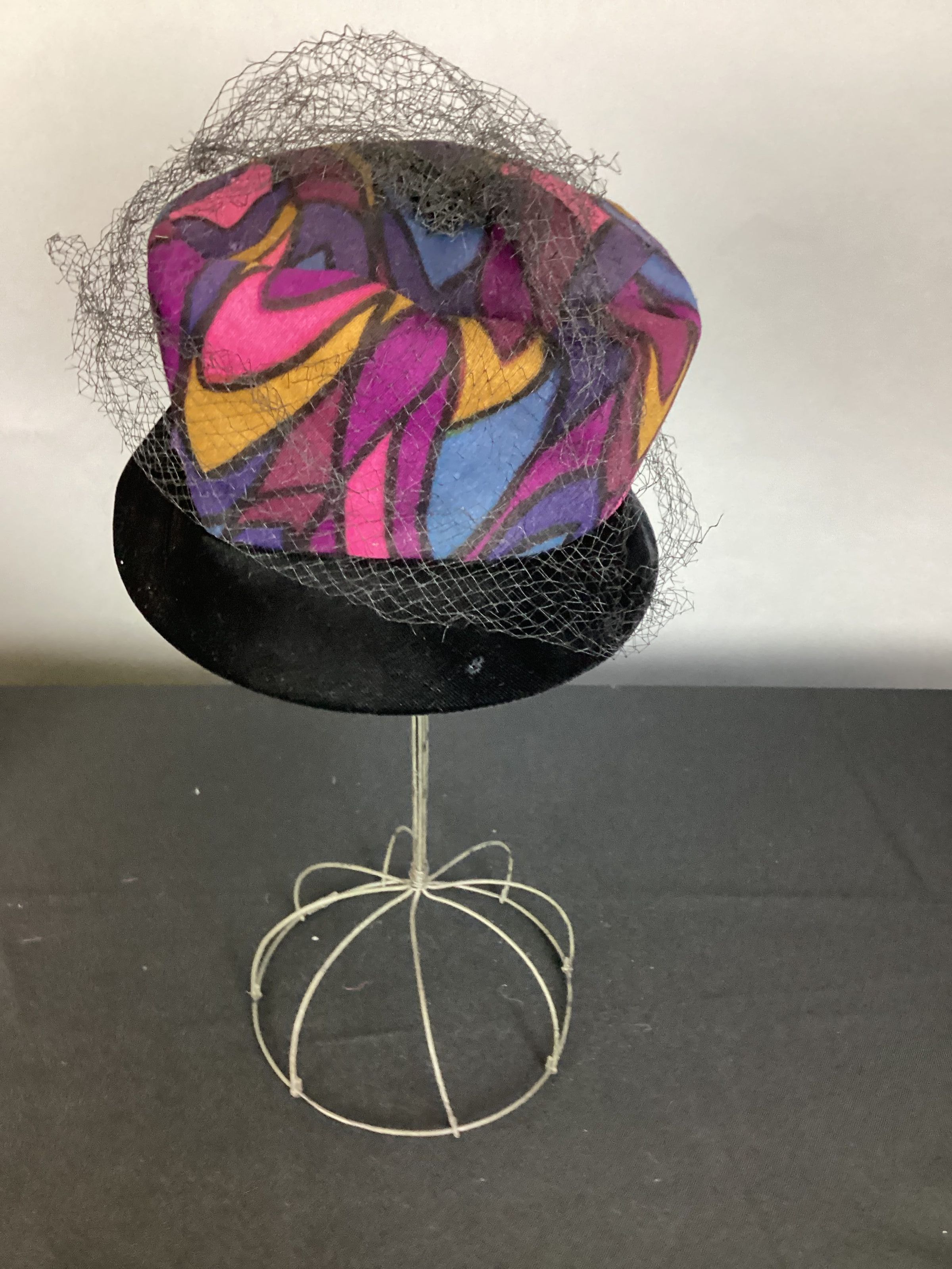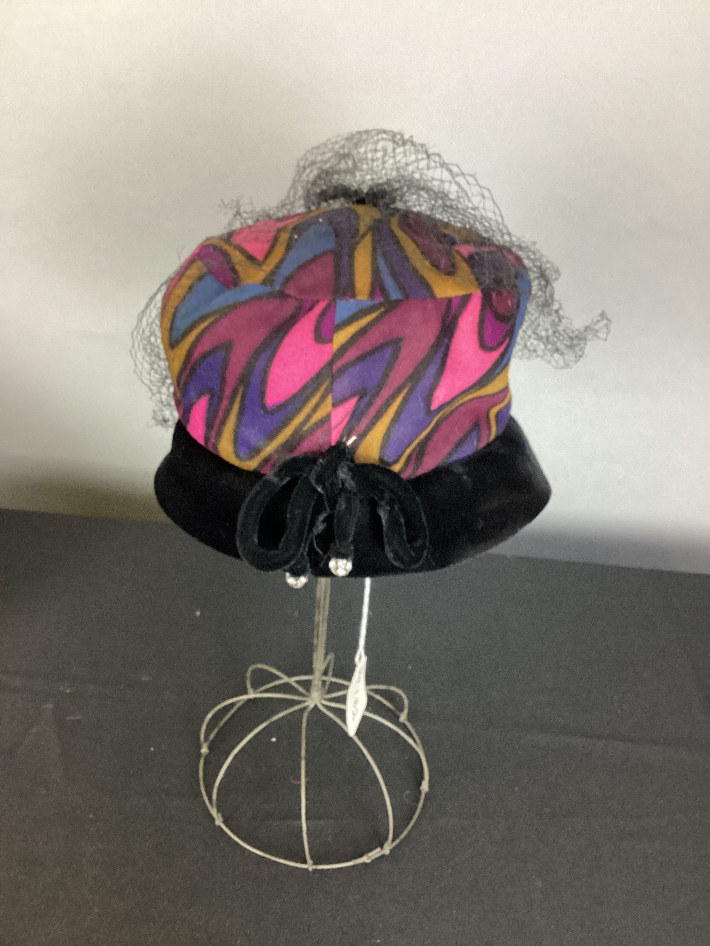 Wool print felt hat with black velvet brim and buckram base; net attached at front of crown; black velvet bow with rhinestone trim attached at center back