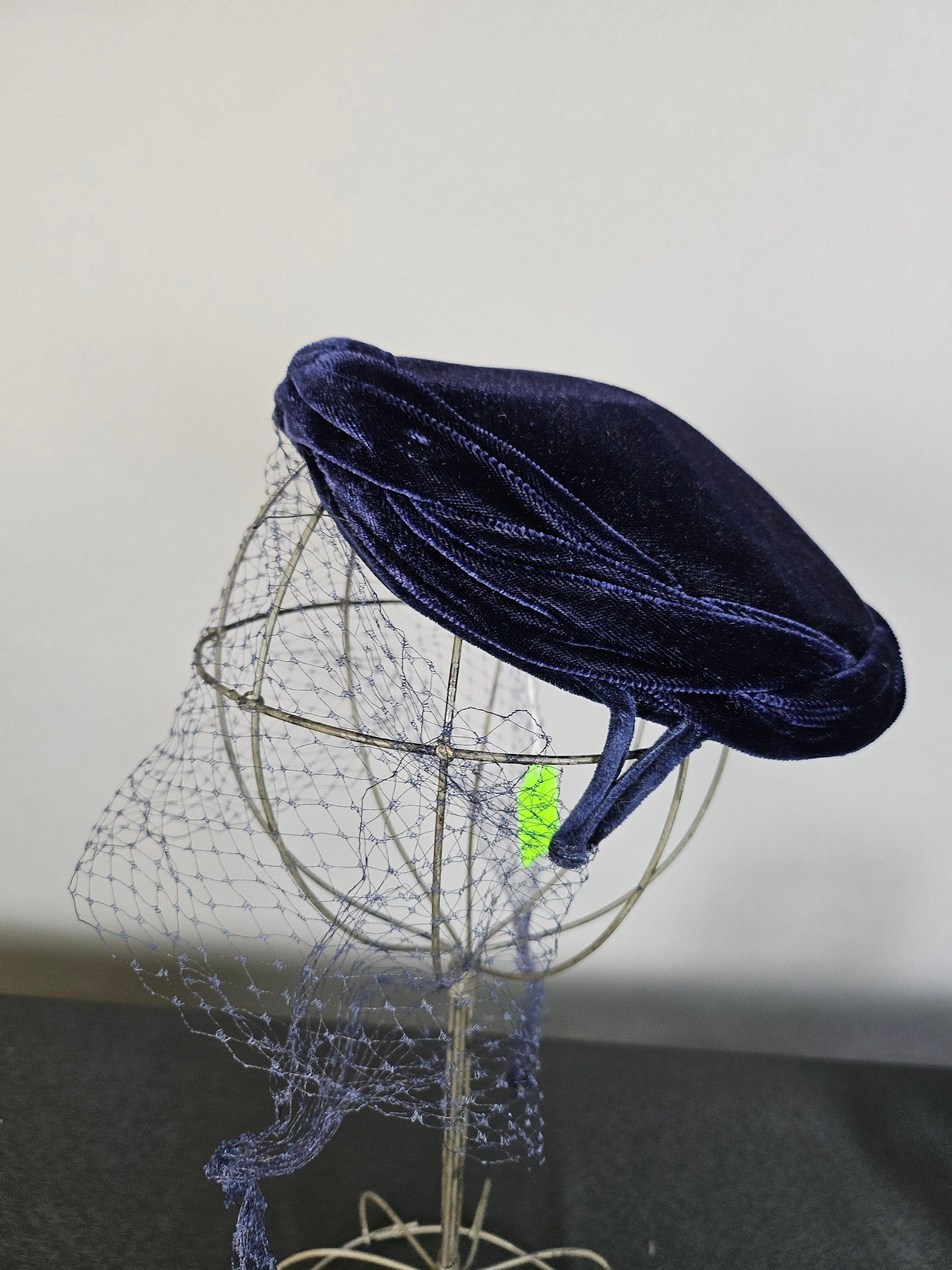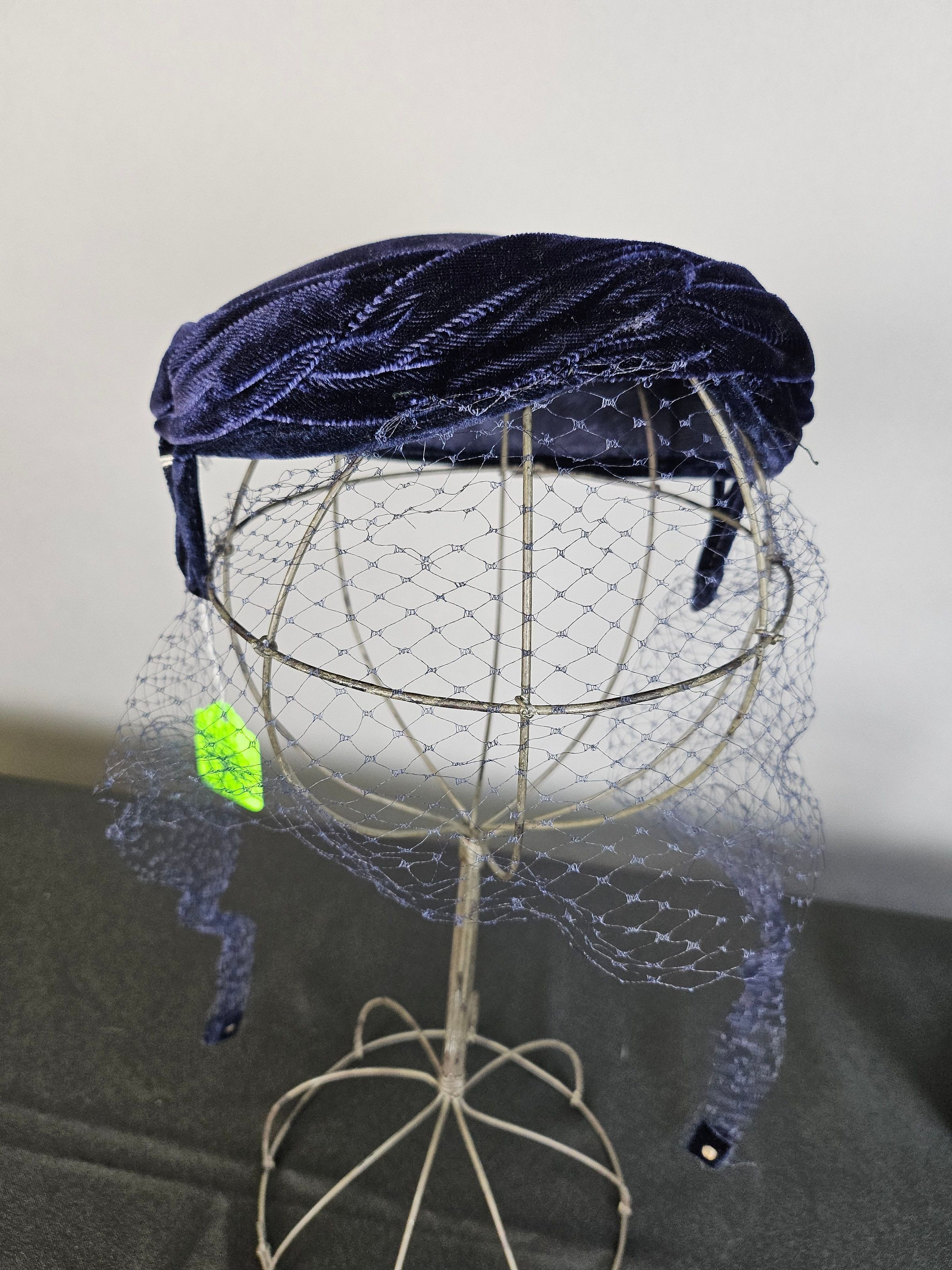 small navy blue velvet hat, twisted velvet around brim, velvet clips to hold on head