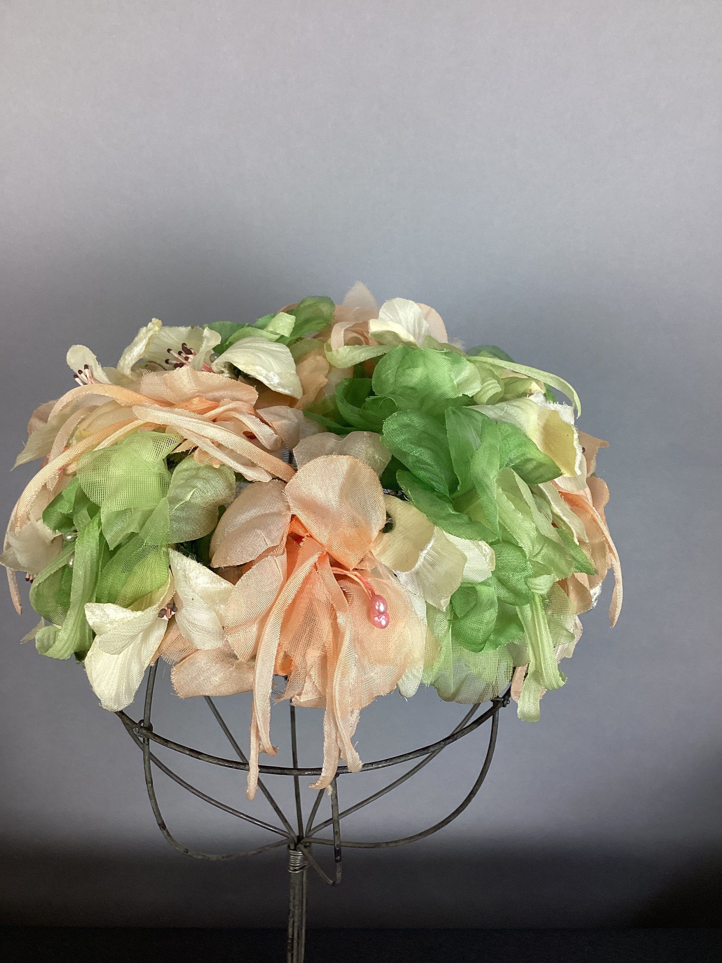 Color is peach and light green; green velvet over a wire frame with a net of silk flowers; little velvet prongs on side to hold hat on head; there are decorative centers in the flowersCollection