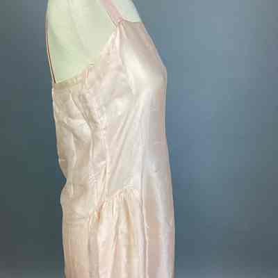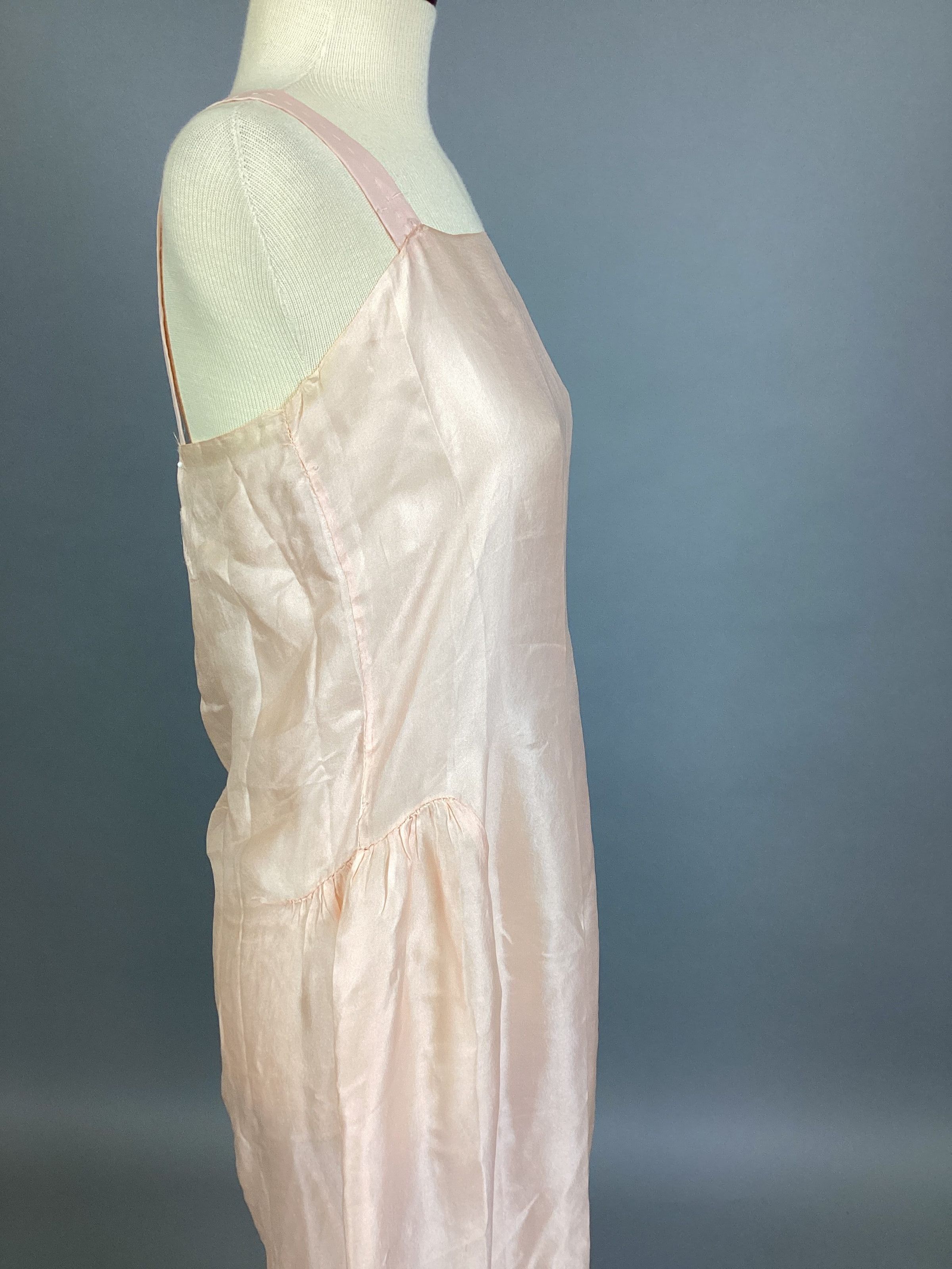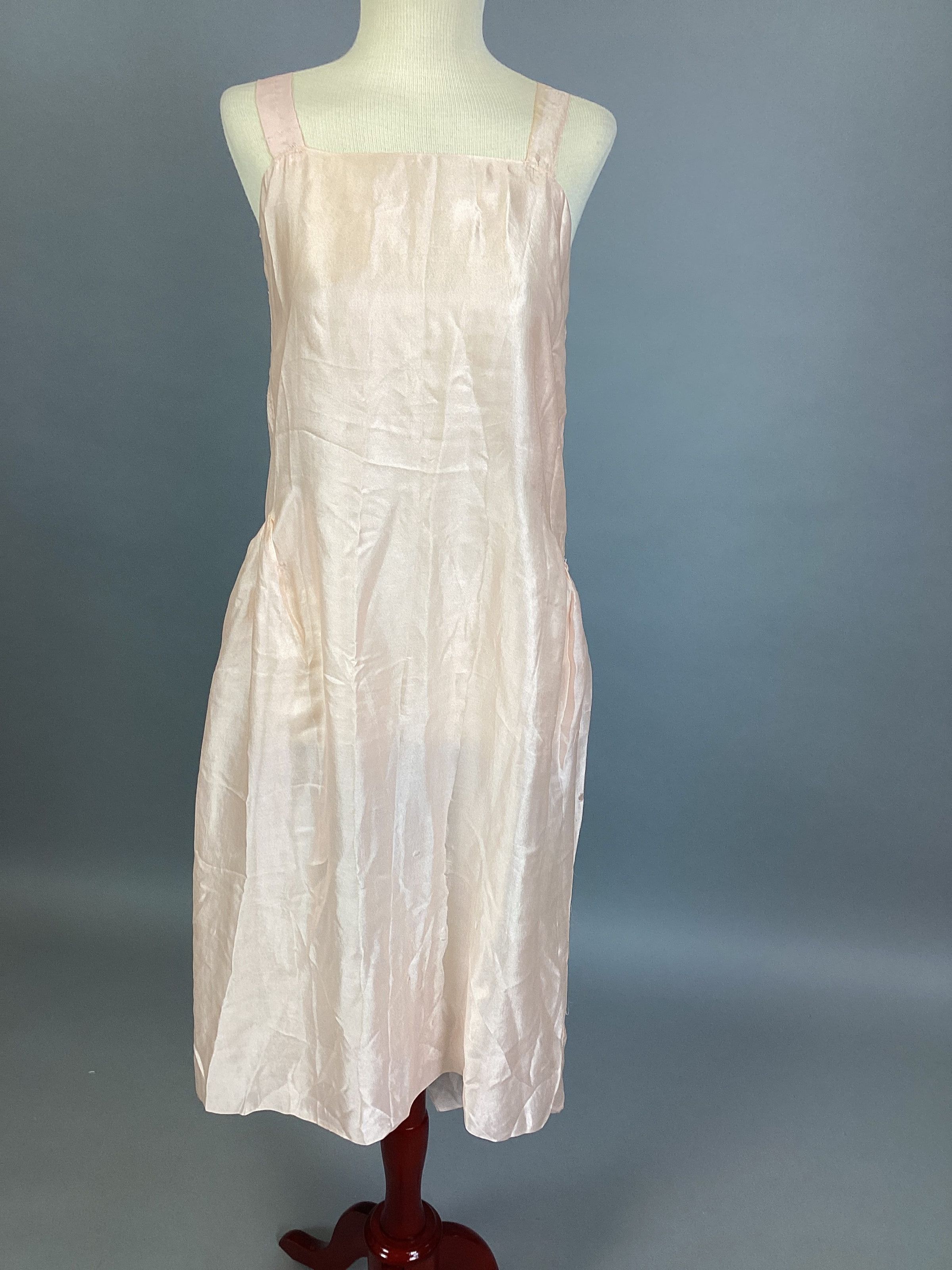 Hand sewn, peach color slip, cut across material so selvage edges were at top and bottom (no hems); side seams in bodice with 5" gathering in skirt attached - no waist seam; 1" straps hemstitched on edge. Hand sewn with felled seams.Use