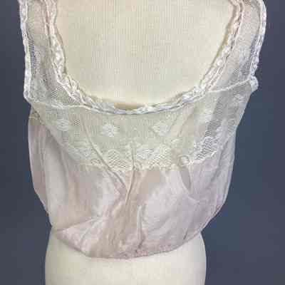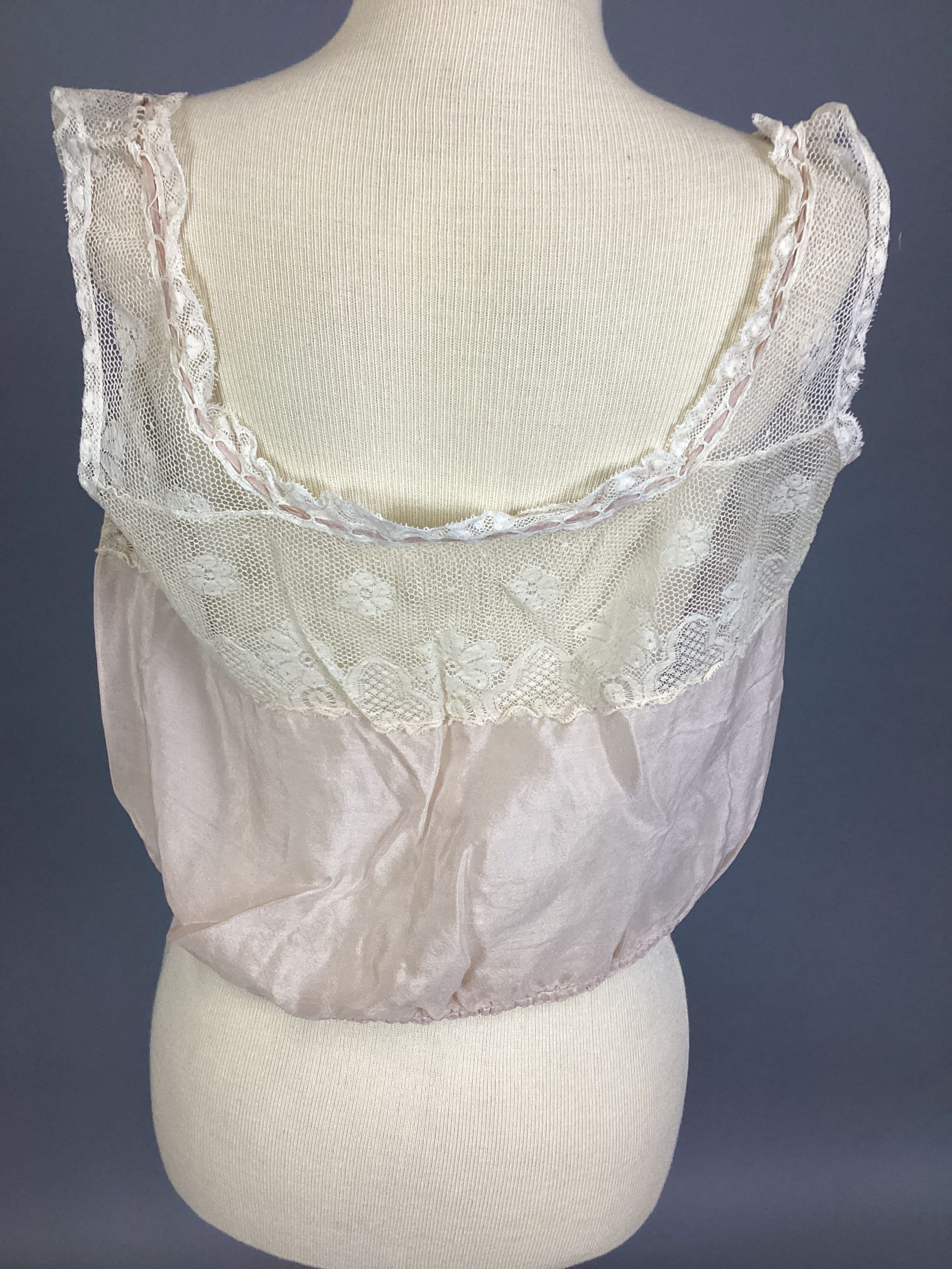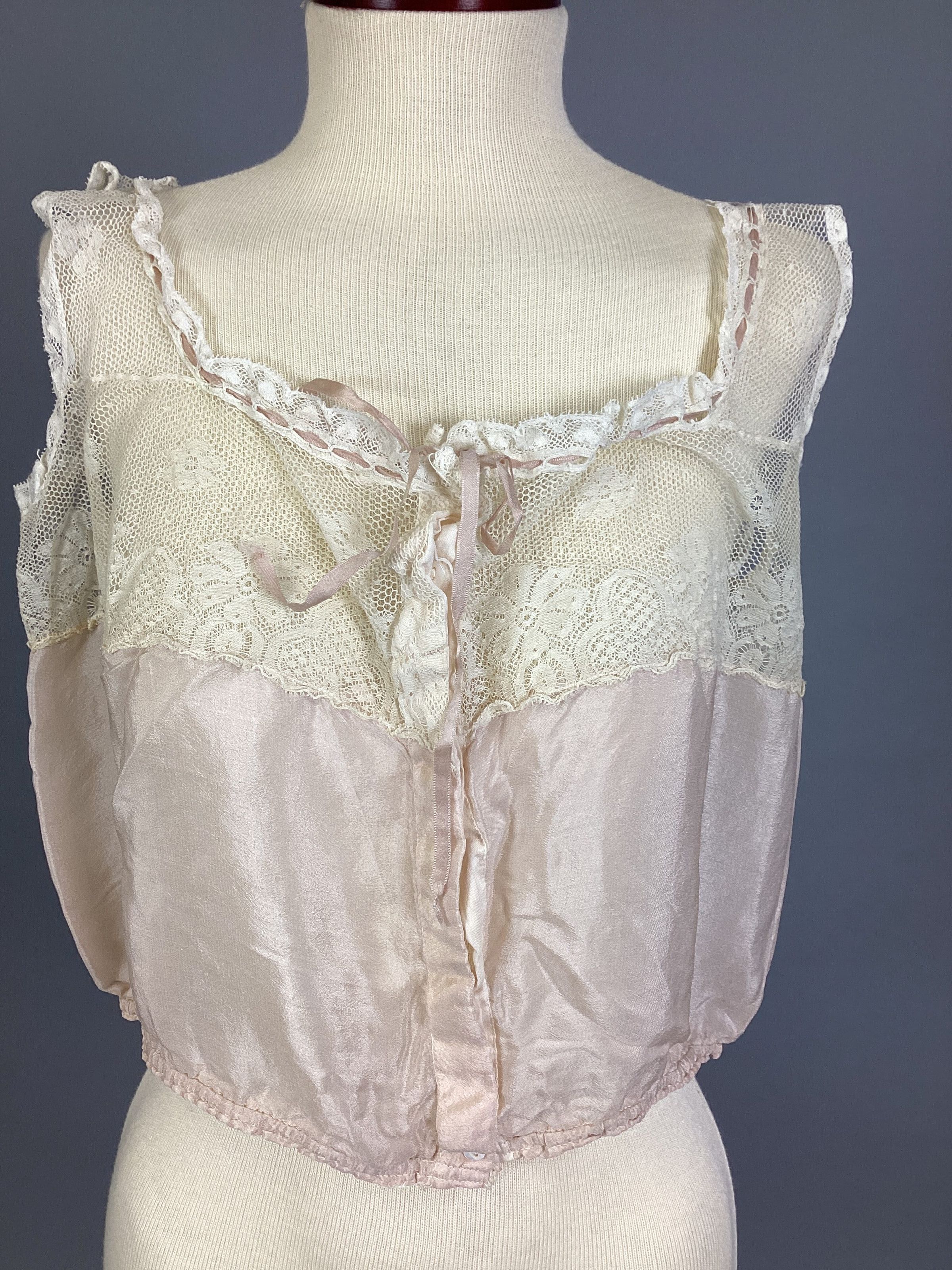 Camisole. 6.75" band of peach-colored silk topped with ecru lace; shoulder straps are ecru lace outlined with white lace; lace at neckline has peach- colored ribbon inserts; garment has elastic around the bottom; opens in back and fastens with 4 small pearl buttons.Use