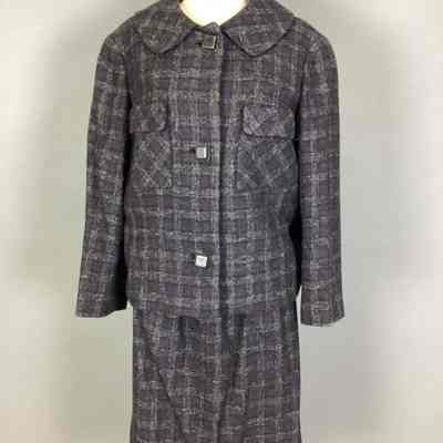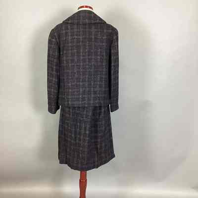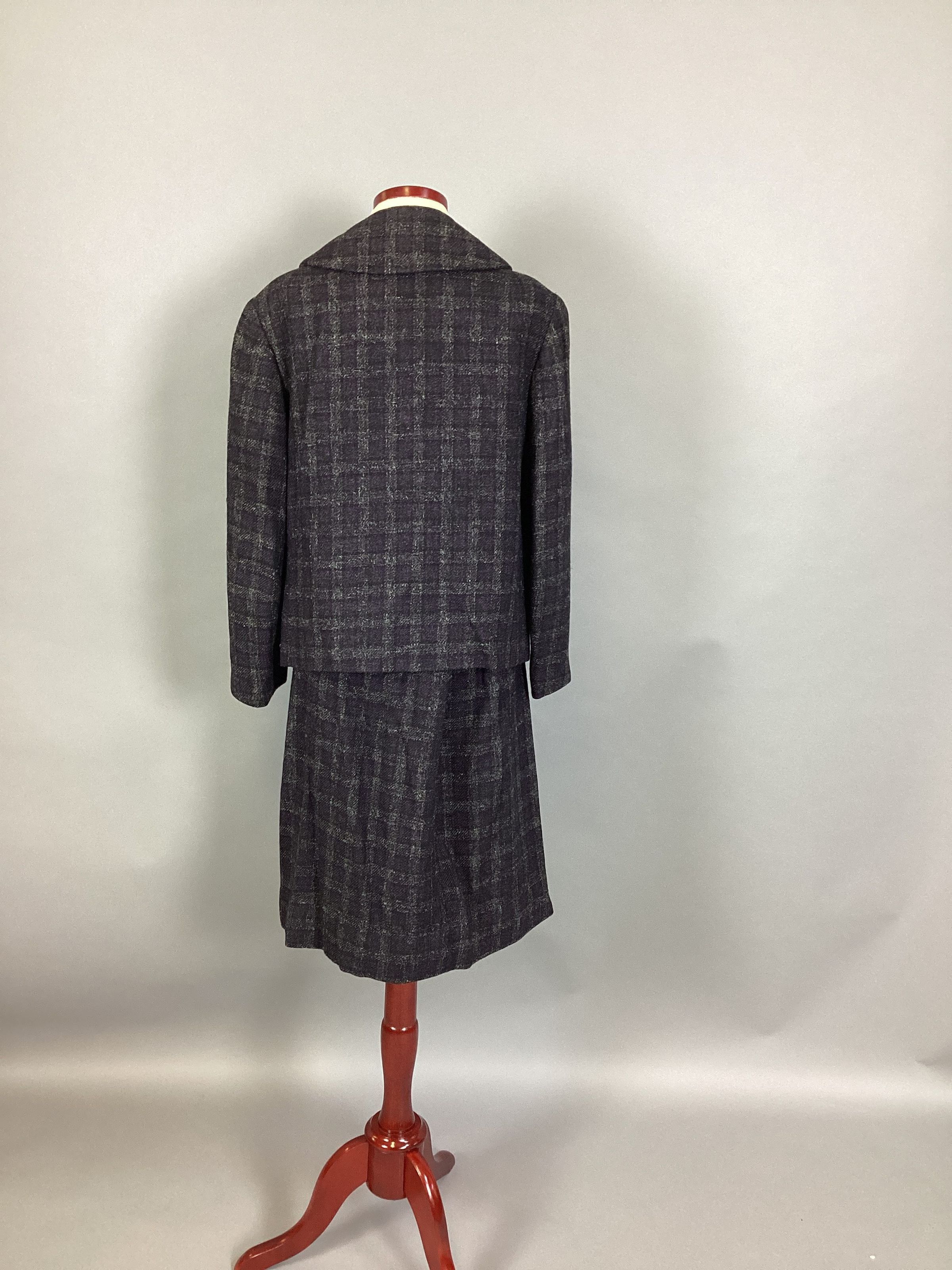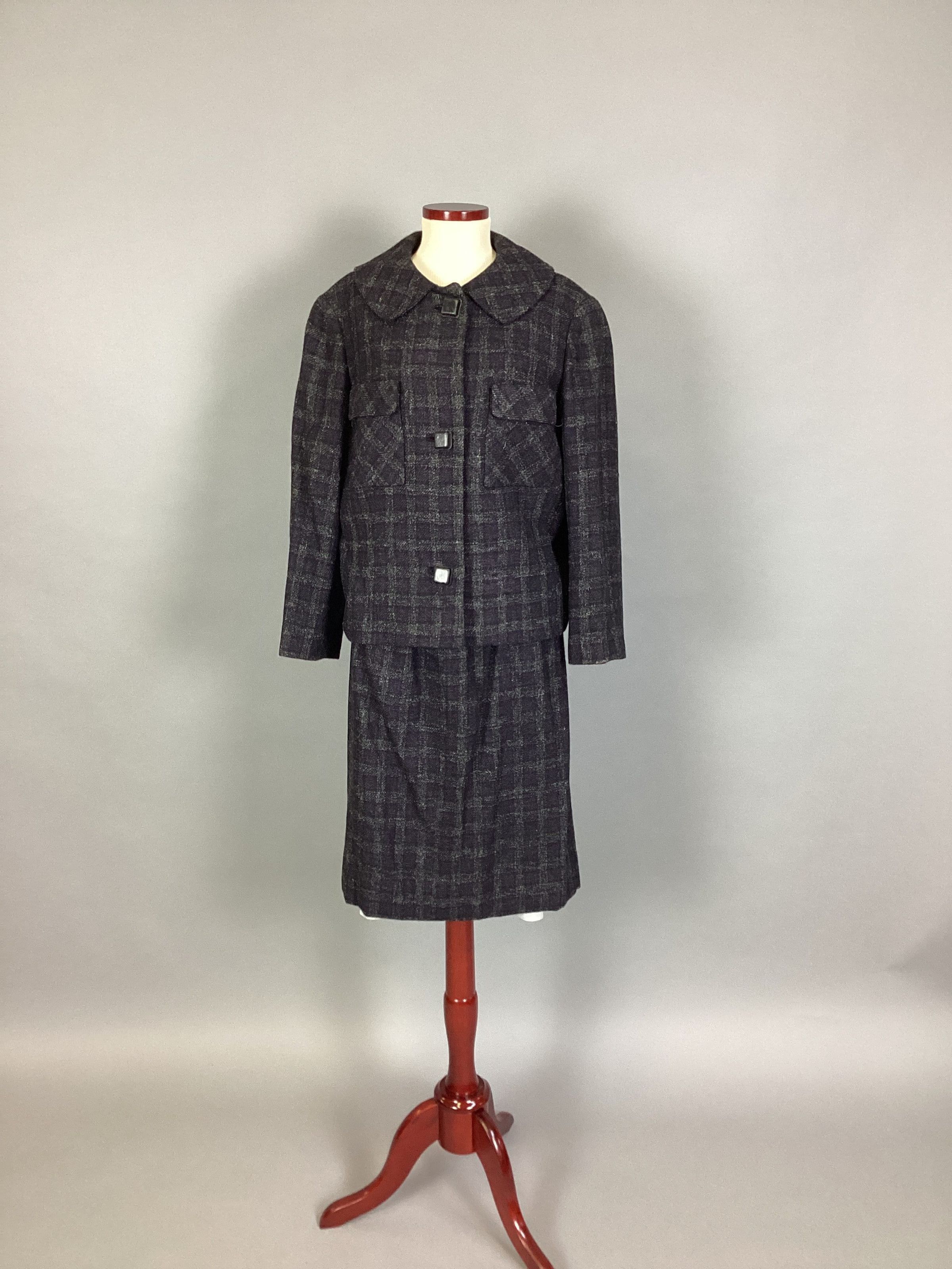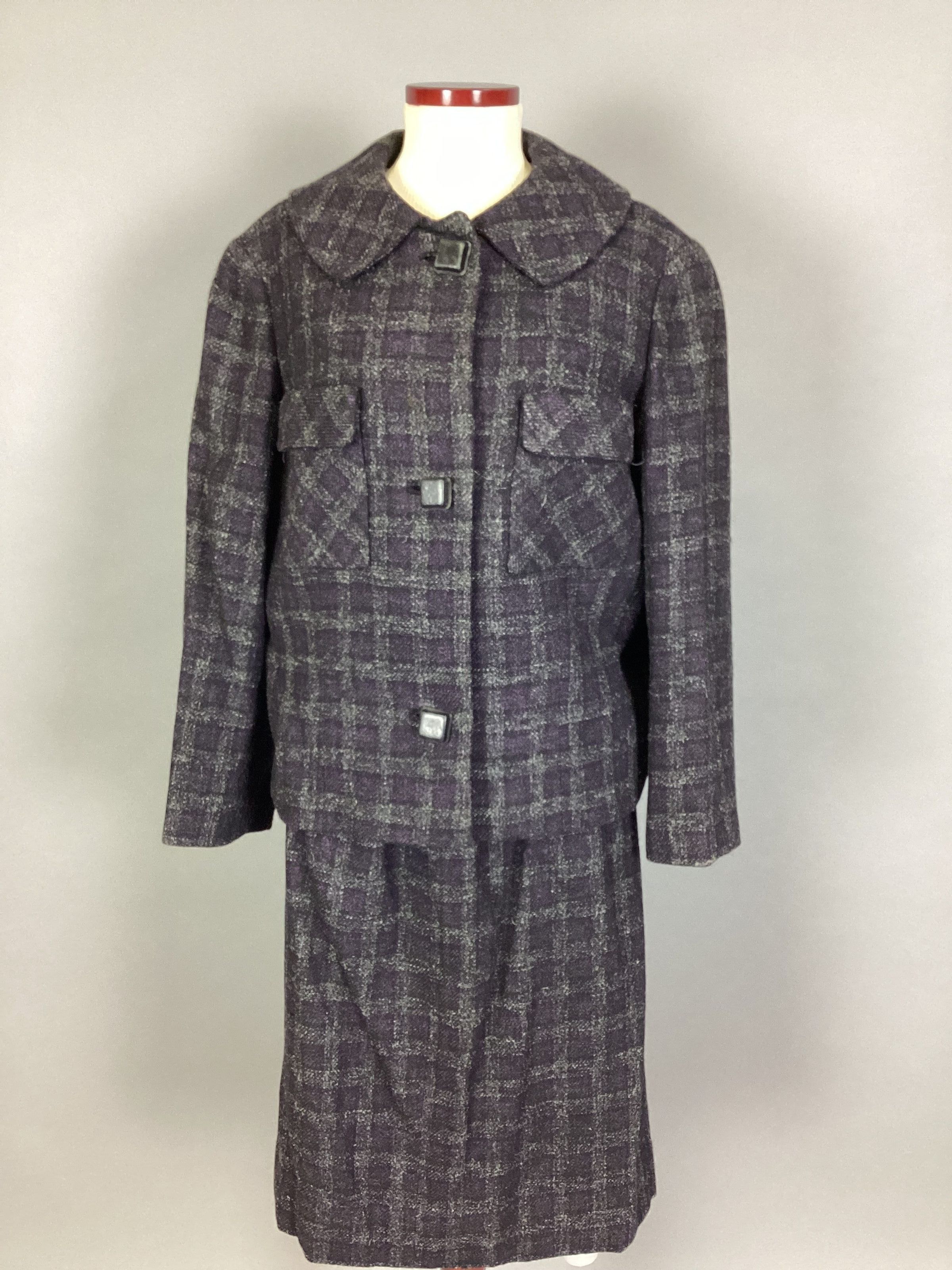 Lady's two-piece suit. Wool in a plaid of black, purple and white.