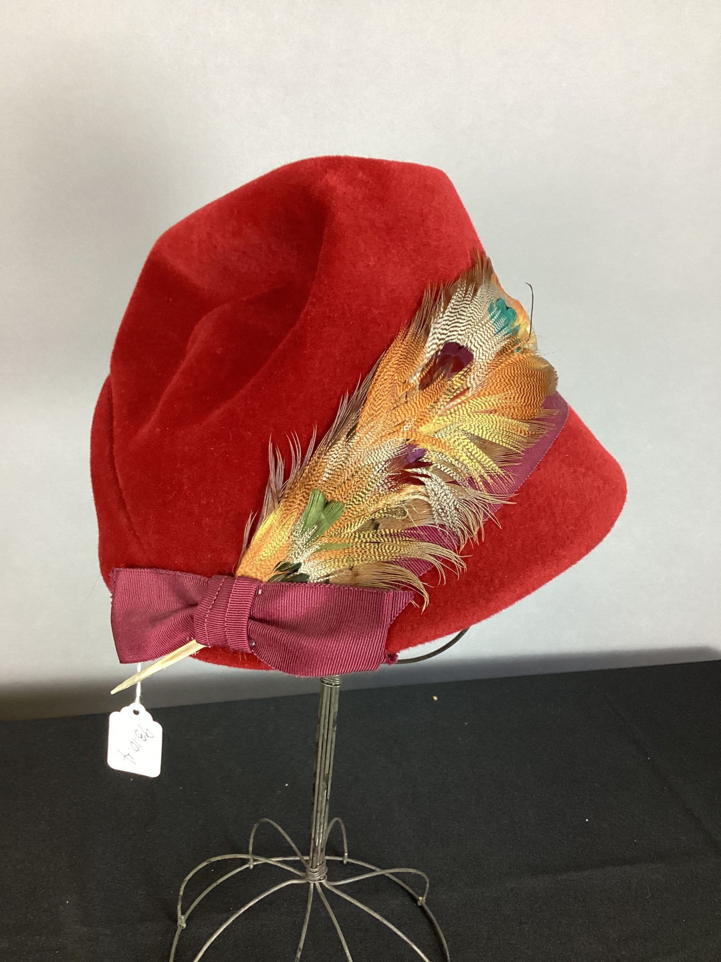 Women's Red Felt Cloche Hat w/ FeatherDescription