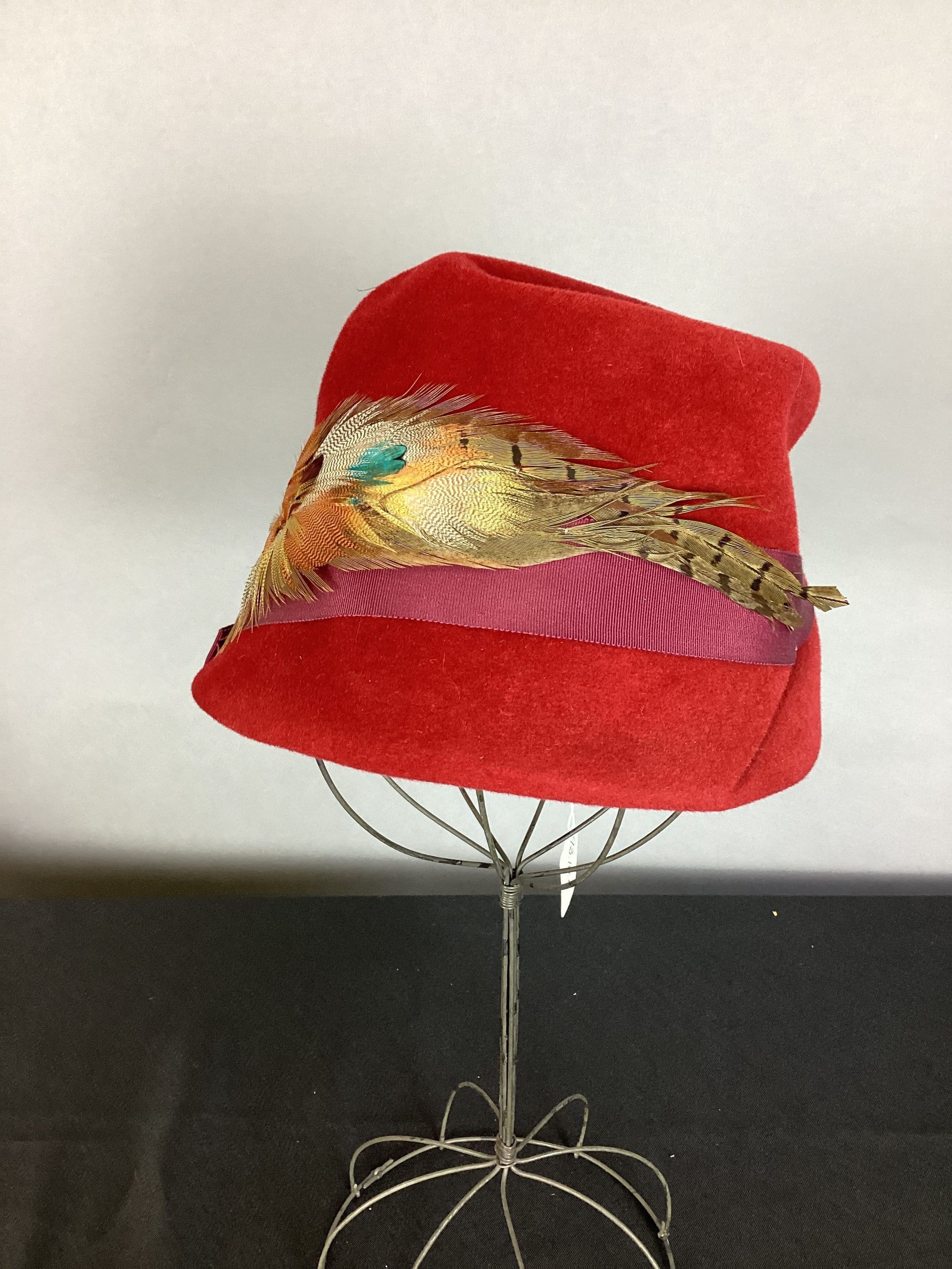 A "bonnet" shape of deep red felt. Back brim turned up flat against crown. Red grosgrain ribbon across front with bow on right anchoring a multi-colored feather.Use